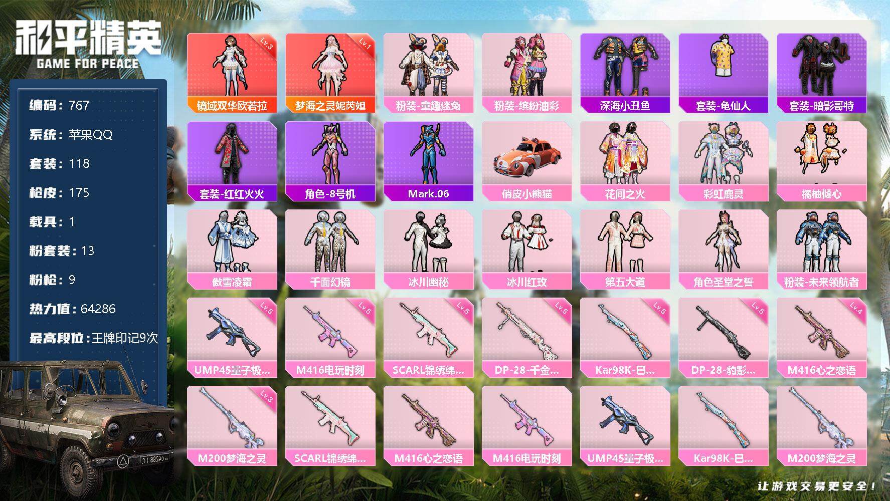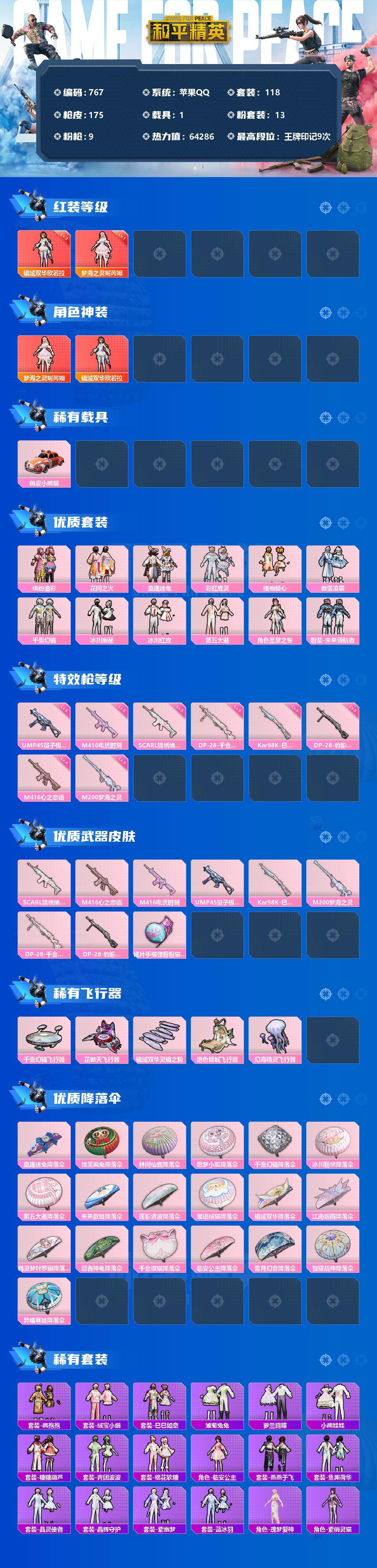 [12484614]【商品标题】:苹果 手q-2神装-13粉装-9特效呛-1载具-6粉色飞行器-64286热力值-9王牌印记-118套装-175呛皮 【红色神装等级】:梦海之灵-妮芮妲一级,镜域双华-欧若拉三级 【红色角色神装】:梦海之灵-妮芮妲,镜域双华-欧若拉 【热门品类】:粉装-童趣迷兔,粉装-缤纷油彩,套装-深海小丑鱼,套装-龟仙人,套装-暗影哥特,套装-红红火火,角色-8号机,角色-mark.06 【粉色载具】:俏皮小熊猫 【粉色套装】:粉装-缤纷油彩,粉装-花间之火,粉装-童趣迷兔,粉装-彩虹鹿灵,粉装-橘柚倾心,粉装-傲雪凌霜,粉装-千面幻镜,粉装-冰川幽秘,粉装-冰川红玫,粉装-第五大道,角色-圣堂之誓,粉装-未来领航者 【粉色呛皮等级】:scar-l-锦绣绵绵五级,m416-心之恋语四级,m416-电玩时刻五级,ump45-量子极限五级,kar98k-巳巳如意五级,m200-梦海之灵三级,dp-28-千金淑猫五级,dp-28-豹影疾电五级 【粉色呛皮】:scar-l-锦绣绵绵,m416-心之恋语,m416-电玩时刻,ump45-量子极限,kar98k-巳巳如意,m200-梦海之灵,dp-28-千金淑猫,dp-28-豹影疾电,破片手留单-粉粉猫爪 【粉色飞行器】:千面幻镜飞行器,花傲天飞行器,镜域双华-灵镜之阶,绝色倾城飞行器,幻海精灵飞行器 【粉色降落伞】:童趣迷兔降落伞,怪笑疯兔降落伞,林间仙鹿降落伞,甜梦小狐降落伞,千面幻镜降落伞,冰川粉黛降落伞,第五大道降落伞,未来歌姬降落伞,莲影清波降落伞,蜜语绒猫降落伞,镜域双华降落伞,江南烟雨降落伞,精灵梦叶罗丽降落伞,忍者神龟降落伞,千金淑猫降落伞,临安公主降落伞,雪月幻音降落伞,智耀战神降落伞,异瞳寒姬降落伞 【稀有套装】:套装-龟仙人,套装-熊抱抱,套装-绒宝小鹅,套装-巳巳如意,套装-雏菊兔兔,套装-萝兰蝴蝶,套装-小熊娃娃,套装-糖糖葫芦,套装-青团波波,套装-棉花软糖,角色-临安公主,套装-燕燕于飞,套装-鱼渊荷华,套装-晶灵使者,套装-晶辉守护,套装-紫幽梦,套装-蓝冰羽,角色-瑰梦爱神,角色-紫俏灵猫 【稀有呛皮】:akm-江南烟雨,akm-霓虹街区,akm-龙的传人,m16a4-莲影清波,scar-l-玉兔迎春,scar-l-甜蜜旋律,m416-糯团青竹,groz