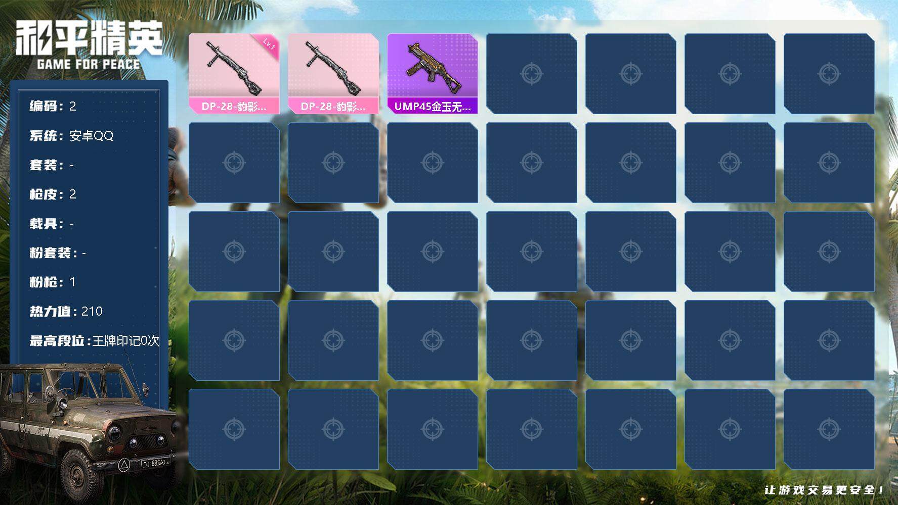[12484633]【商品标题】:安卓 手q-0粉装-1特效呛-0载具-0粉色飞行器-210热力值-0王牌印记-0套装-2呛皮 【粉色呛皮等级】:dp-28-豹影疾电一级 【粉色呛皮】:dp-28-豹影疾电 【稀有呛皮】:ump45-金玉无双 【营地id】:1018583967