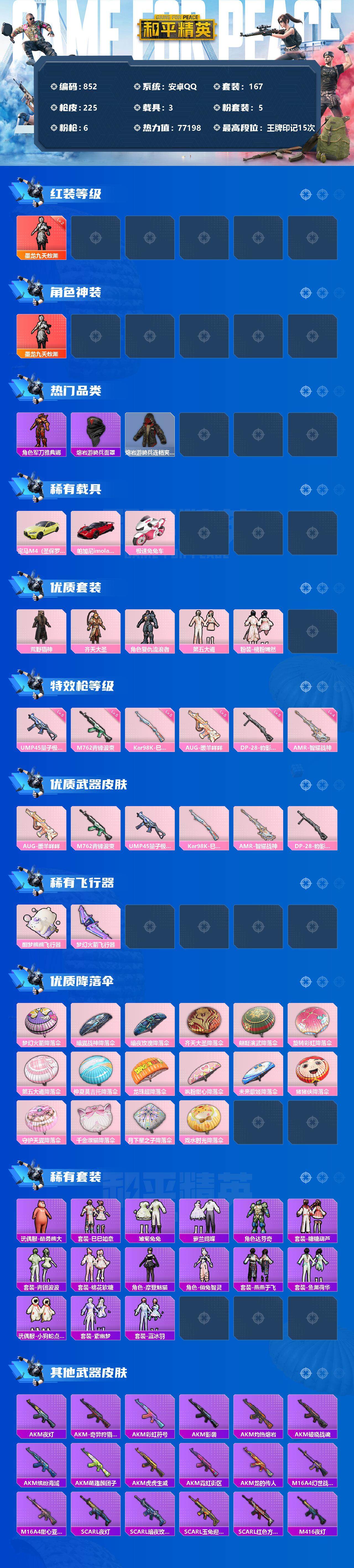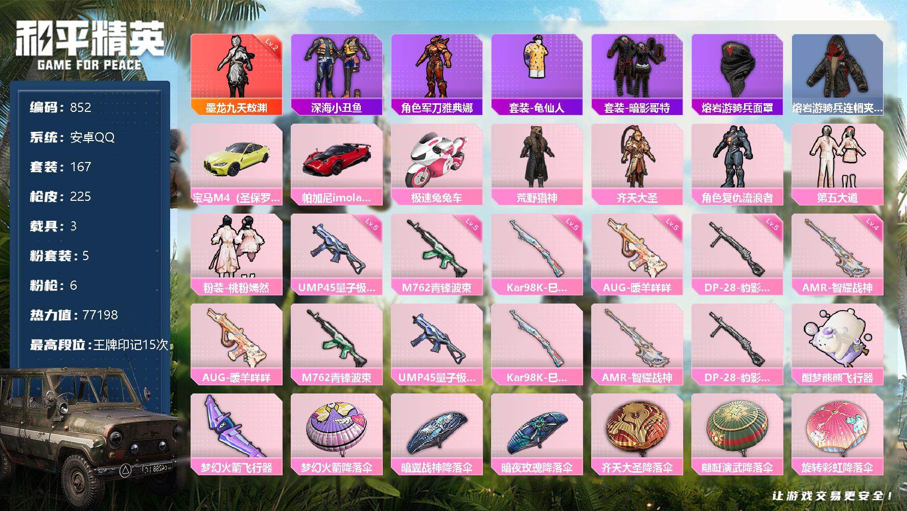 [12485151]【商品标题】:安卓 手q-1神装-5粉装-6特效呛-3载具-3粉色飞行器-77198热力值-15王牌印记-167套装-225呛皮 【红色神装等级】:墨龙九天-敖渊二级 【红色角色神装】:墨龙九天-敖渊 【热门品类】:套装-深海小丑鱼,角色-军刀雅典娜,套装-龟仙人,套装-暗影哥特,熔岩游骑兵面罩,熔岩游骑兵连帽夹克 【粉色载具】:宝马m4(圣保罗黄),帕加尼imola(光影红),极速兔兔车 【粉色套装】:粉装-荒野猎神,粉装-齐天大圣,角色-复仇流浪者,粉装-第五大道,粉装-桃粉嫣然 【粉色呛皮等级】:aug-暖羊咩咩五级,m762-青锋波束五级,ump45-量子极限五级,kar98k-巳巳如意五级,amr-智耀战神四级,dp-28-豹影疾电五级 【粉色呛皮】:aug-暖羊咩咩,m762-青锋波束,ump45-量子极限,kar98k-巳巳如意,amr-智耀战神,dp-28-豹影疾电 【粉色飞行器】:酣梦熊熊飞行器,梦幻火箭飞行器 【粉色降落伞】:梦幻火箭降落伞,暗翼战神降落伞,暗夜玫瑰降落伞,齐天大圣降落伞,翩跹演武降落伞,旋转彩虹降落伞,第五大道降落伞,仲夏莫吉托降落伞,龙珠超降落伞,飒粉甜心降落伞,未来歌姬降落伞,猪猪侠降落伞,守护天翼降落伞,千金淑猫降落伞,月下星之子降落伞,戏水时光降落伞 【稀有套装】:套装-龟仙人,玩偶服-酷勇熊大,套装-巳巳如意,套装-雏菊兔兔,套装-萝兰蝴蝶,角色-达芬奇,套装-糖糖葫芦,套装-青团波波,套装-棉花软糖,角色-摩登魅猫,角色-俏兔智灵,套装-燕燕于飞,套装-鱼渊荷华,玩偶服-小狗蛇点点,套装-紫幽梦,套装-蓝冰羽 【稀有呛皮】:akm-夜灯,akm-奇异狩猎者,akm-彩虹符号,akm-影袭,akm-灼热熔岩,akm-破晓战魂,akm-缤纷海域,akm-萌趣颜团子,akm-虎虎生威,akm-霓虹街区,akm-龙的传人,m16a4-幻世战舞者,m16a4-甜心亚梦,scar-l-夜灯,scar-l-暗夜玫瑰,scar-l-玉兔迎春,scar-l-红色方程式,m416-夜灯,m416-暗星紫秘,m416-糯团青竹,m416-红色方程式,m416-绯红前夜,m416-蓝色火焰,groza-影袭,groza-懵萌河马,groza-田园牧歌,aug-天降萌叽,aug-月影灵韵,q-彩虹符号,q