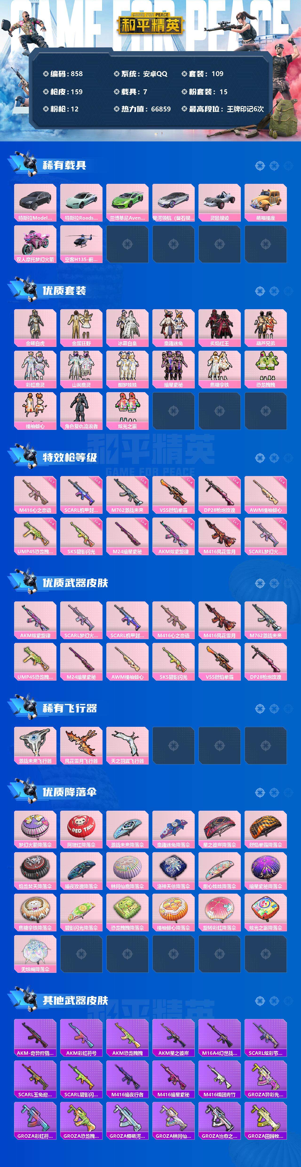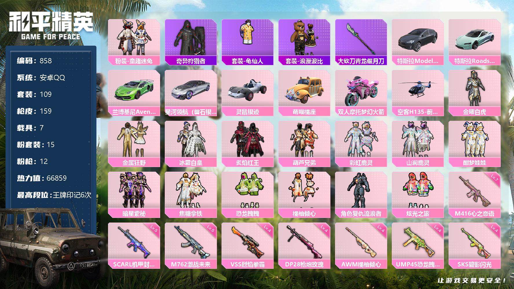 [12485204]【商品标题】:安卓 手q-15粉装-12特效呛-7载具-3粉色飞行器-66859热力值-6王牌印记-109套装-159呛皮 【热门品类】:粉装-童趣迷兔,套装-奇异狩猎者,套装-龟仙人,套装-浪漫波比,大砍刀-青龙偃月刀 【粉色载具】:特斯拉model x(冷光银),特斯拉roadster(水滴蓝),兰博基尼aventad svj(翡翠绿),星河领航(磐石银),灵鼠银迹,萌喵橘座,双人摩托-梦幻火箭,空客h135-蔚蓝之翼 【粉色套装】:粉装-金曜白虎,粉装-金属狂野,粉装-冰霜白皇,粉装-童趣迷兔,粉装-炙焰红王,粉装-葫芦兄弟,粉装-彩虹鹿灵,粉装-山涧鹿灵,粉装-酣梦娃娃,粉装-暗星紫秘,粉装-焦糖拿铁,粉装-恐龙拽拽,粉装-橘柚倾心,角色-复仇流浪者,粉装-炫光之旅 【粉色呛皮等级】:akm-炫紫旋律四级,scar-l-梦幻火箭一级,scar-l-机甲封神五级,m416-心之恋语七级,m416-风花雪月一级,m762-激战未来五级,ump45-恐龙拽拽四级,m24-暗星紫秘四级,awm-橘柚倾心四级,sks-碧影闪光四级,vss-烈焰拳霸四级,dp-28-呛炮玫瑰四级 【粉色呛皮】:akm-炫紫旋律,scar-l-梦幻火箭,scar-l-机甲封神,m416-心之恋语,m416-风花雪月,m762-激战未来,ump45-恐龙拽拽,m24-暗星紫秘,awm-橘柚倾心,sks-碧影闪光,vss-烈焰拳霸,dp-28-呛炮玫瑰 【粉色飞行器】:激战未来飞行器,风花雪月飞行器,天之羽翼飞行器 【粉色降落伞】:梦幻火箭降落伞,阿狸红降落伞,激战未来降落伞,童趣迷兔降落伞,星之彼岸降落伞,烈焰拳霸降落伞,焰龙焚天降落伞,暗夜玫瑰降落伞,林间仙鹿降落伞,洛神天依降落伞,甜心娃娃降落伞,暗星紫秘降落伞,焦糖拿铁降落伞,碧影闪光降落伞,恐龙拽拽降落伞,橘柚倾心降落伞,旋转彩虹降落伞,炫光之旅降落伞,无垠阁降落伞 【稀有套装】:套装-龟仙人 【稀有呛皮】:akm-奇异狩猎者,akm-彩虹符号,akm-恐龙拽拽,akm-星之彼岸,m16a4-幻世战舞者,scar-l-炫彩节奏,scar-l-玉兔迎春,scar-l-碧影闪光,m416-暗夜行者,m416-暗星紫秘,m416-糯团青竹,groza-异彩先驱,groza-彩虹符号,g