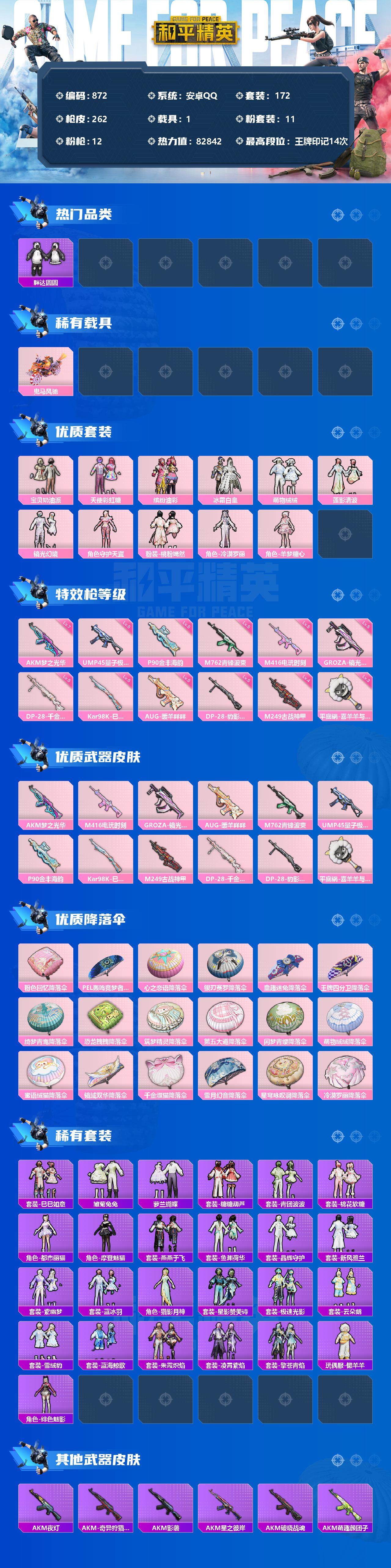 [12485294]【商品标题】:安卓 手q-11粉装-12特效呛-1载具-0粉色飞行器-82842热力值-14王牌印记-172套装-262呛皮 【热门品类】:粉装-缤纷油彩,套装-深海小丑鱼,套装-奇异狩猎者,套装-胖达圆圆,套装-龟仙人 【粉色载具】:鬼马风驰 【粉色套装】:粉装-宝贝奶油派,粉装-天使彩虹糖,粉装-缤纷油彩,粉装-冰霜白皇,粉装-萌物绒绒,粉装-莲影清波,粉装-镜光幻境,角色-守护天翼,粉装-桃粉嫣然,角色-冷漠罗丽,角色-羊梦糖心 【粉色呛皮等级】:akm-梦之光华七级,m416-电玩时刻五级,groza-镜光银凌五级,aug-暖羊咩咩五级,m762-青锋波束五级,ump45-量子极限五级,p90-金丰海韵五级,kar98k-巳巳如意五级,m249-古战神甲四级,dp-28-千金淑猫五级,dp-28-豹影疾电五级,平底锅-喜羊羊与灰太狼三级 【粉色呛皮】:akm-梦之光华,m416-电玩时刻,groza-镜光银凌,aug-暖羊咩咩,m762-青锋波束,ump45-量子极限,p90-金丰海韵,kar98k-巳巳如意,m249-古战神甲,dp-28-千金淑猫,dp-28-豹影疾电,平底锅-喜羊羊与灰太狼 【粉色降落伞】:粉色回忆降落伞,pel轰鸣竞梦者降落伞,心之恋语降落伞,银刃赛罗降落伞,童趣迷兔降落伞,王牌四分卫降落伞,绮梦青鸾降落伞,恐龙拽拽降落伞,筑梦精灵降落伞,第五大道降落伞,闲梦青缨降落伞,萌物绒绒降落伞,蜜语绒猫降落伞,镜域双华降落伞,千金淑猫降落伞,雪月幻音降落伞,星穹咏叹调降落伞,冷漠罗丽降落伞 【稀有套装】:套装-龟仙人,套装-巳巳如意,套装-雏菊兔兔,套装-萝兰蝴蝶,套装-糖糖葫芦,套装-青团波波,套装-棉花软糖,角色-都市丽猫,角色-摩登魅猫,套装-燕燕于飞,套装-鱼渊荷华,套装-晶辉守护,套装-新风雅兰,套装-紫幽梦,套装-蓝冰羽,角色-猎影月神,套装-星影赞美诗,套装-极速光影,套装-云朵鹅,套装-雪绒豹,套装-蓝海鲸歌,套装-朱霞炽焰,套装-凌霄紫焰,套装-擎苍青焰,玩偶服-懒羊羊,角色-绯色魅影 【稀有呛皮】:akm-夜灯,akm-奇异狩猎者,akm-影袭,akm-星之彼岸,akm-破晓战魂,akm-萌趣颜团子,akm-龙的传人,m16a4-千金淑猫,scar-l-炫彩节奏,scar-
