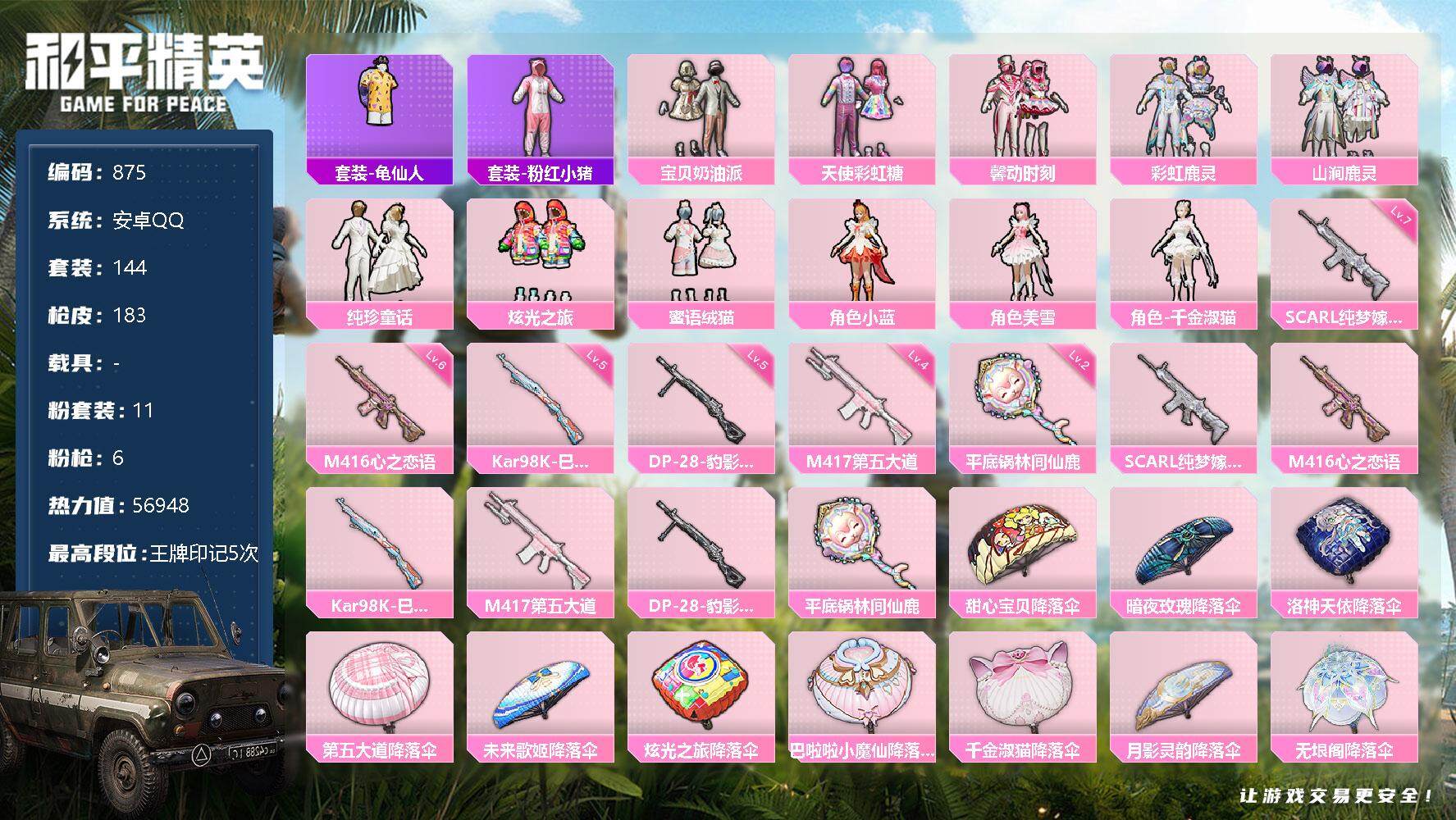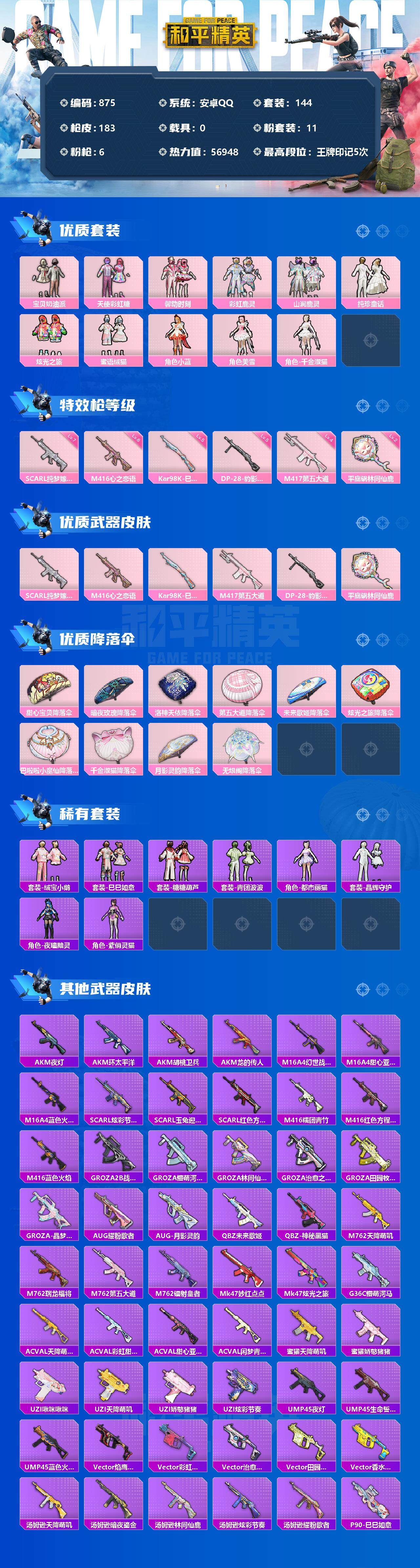 [12485311]【商品标题】:安卓 手q-11粉装-6特效呛-0载具-0粉色飞行器-56948热力值-5王牌印记-144套装-183呛皮 【热门品类】:套装-龟仙人,套装-粉红小猪 【粉色套装】:粉装-宝贝奶油派,粉装-天使彩虹糖,粉装-馨动时刻,粉装-彩虹鹿灵,粉装-山涧鹿灵,粉装-纯珍童话,粉装-炫光之旅,粉装-蜜语绒猫,角色-小蓝,角色-美雪,角色-千金淑猫 【粉色呛皮等级】:scar-l-纯梦嫁纱七级,m416-心之恋语六级,kar98k-巳巳如意五级,m417-第五大道四级,dp-28-豹影疾电五级,平底锅-林间仙鹿二级 【粉色呛皮】:scar-l-纯梦嫁纱,m416-心之恋语,kar98k-巳巳如意,m417-第五大道,dp-28-豹影疾电,平底锅-林间仙鹿 【粉色降落伞】:甜心宝贝降落伞,暗夜玫瑰降落伞,洛神天依降落伞,第五大道降落伞,未来歌姬降落伞,炫光之旅降落伞,巴啦啦小魔仙降落伞,千金淑猫降落伞,月影灵韵降落伞,无垠阁降落伞 【稀有套装】:套装-龟仙人,套装-绒宝小鹅,套装-巳巳如意,套装-糖糖葫芦,套装-青团波波,角色-都市丽猫,套装-晶辉守护,角色-夜瞳黯灵,角色-紫俏灵猫 【稀有呛皮】:akm-夜灯,akm-环太平洋,akm-胡桃卫兵,akm-龙的传人,m16a4-幻世战舞者,m16a4-甜心亚梦,m16a4-蓝色火焰,scar-l-炫彩节奏,scar-l-玉兔迎春,scar-l-红色方程式,m416-糯团青竹,m416-红色方程式,m416-蓝色火焰,groza-2b战斗服款,groza-懵萌河马,groza-林间仙鹿,groza-治愈之星,groza-田园牧歌,groza-晶梦幻蝶,aug-耀粉歌者,aug-月影灵韵,q-未来歌姬,q-神秘黑猫,m762-天降萌叽,m762-瑞龙福将,m762-第五大道,m762-镭射皇者,mk47-妙红点点,mk47-炫光之旅,g36c-懵萌河马,ac-val-天降萌叽,ac-val-彩虹甜喵,ac-val-甜心亚梦,ac-val-闲梦青缨,蜜獾-天降萌叽,蜜獾-娇憨猪猪,uzi-啾咪啾咪,uzi-天降萌叽,uzi-娇憨猪猪,uzi-炫彩节奏,ump45-夜灯,ump45-生命誓言,ump45-蓝色火焰,vect-焰鹰斗篷,vect-彩虹符号,vect-治愈之星,vect