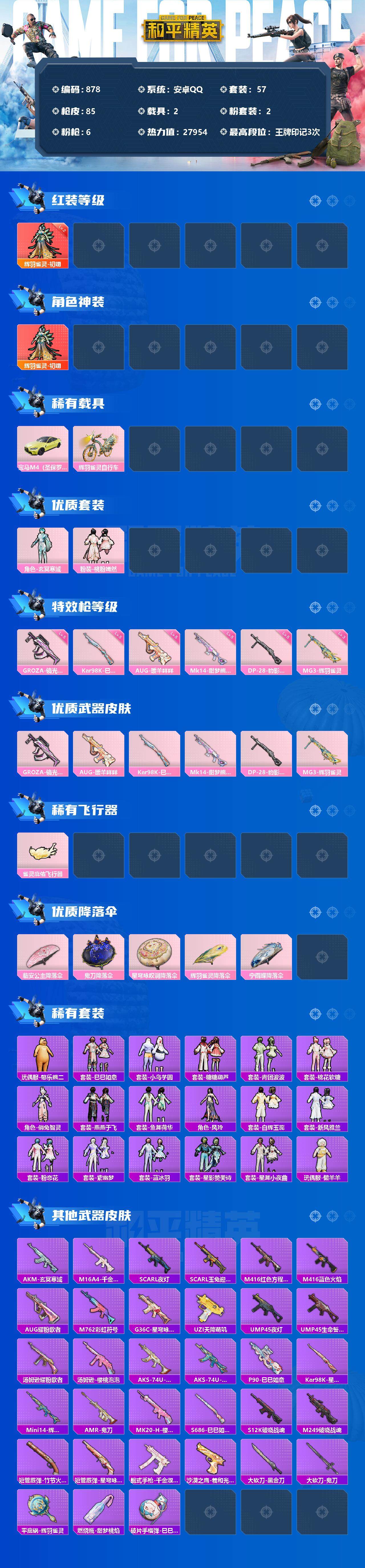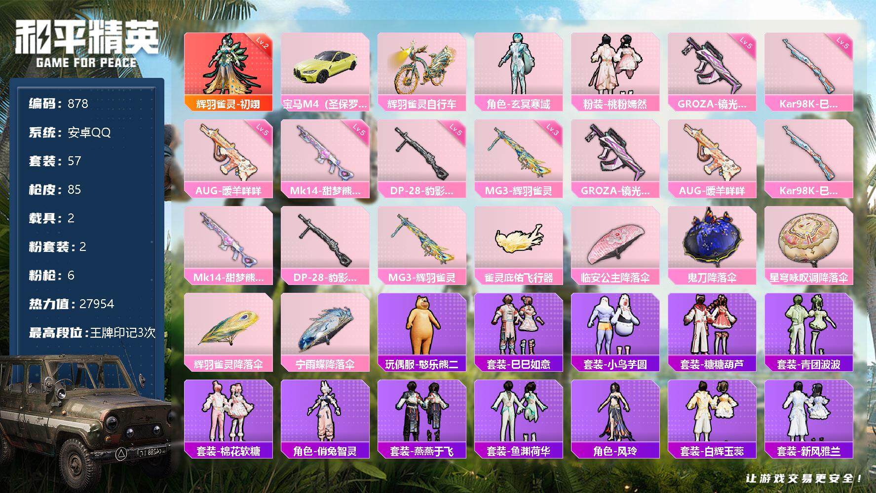[12485329]【商品标题】:安卓 手q-1神装-2粉装-6特效呛-2载具-1粉色飞行器-27954热力值-3王牌印记-57套装-85呛皮 【红色神装等级】:辉羽雀灵-初翊二级 【红色角色神装】:辉羽雀灵-初翊 【粉色载具】:宝马m4(圣保罗黄),辉羽雀灵自行车 【粉色套装】:角色-玄冥寒域,粉装-桃粉嫣然 【粉色呛皮等级】:groza-镜光银凌五级,aug-暖羊咩咩五级,kar98k-巳巳如意五级,mk14-甜梦熊击五级,dp-28-豹影疾电五级,mg3-辉羽雀灵三级 【粉色呛皮】:groza-镜光银凌,aug-暖羊咩咩,kar98k-巳巳如意,mk14-甜梦熊击,dp-28-豹影疾电,mg3-辉羽雀灵 【粉色飞行器】:雀灵庇佑飞行器 【粉色降落伞】:临安公主降落伞,鬼刀降落伞,星穹咏叹调降落伞,辉羽雀灵降落伞,宁雨蝶降落伞 【稀有套装】:玩偶服-憨乐熊二,套装-巳巳如意,套装-小鸟芋圆,套装-糖糖葫芦,套装-青团波波,套装-棉花软糖,角色-俏兔智灵,套装-燕燕于飞,套装-鱼渊荷华,角色-风玲,套装-白辉玉蕊,套装-新风雅兰,套装-粉恋花,套装-紫幽梦,套装-蓝冰羽,套装-星影赞美诗,套装-星渊小夜曲,玩偶服-懒羊羊 【稀有呛皮】:akm-玄冥寒域,m16a4-千金淑猫,scar-l-夜灯,scar-l-玉兔迎春,m416-红色方程式,m416-蓝色火焰,aug-耀粉歌者,m762-彩虹符号,g36c-星穹咏叹调,uzi-天降萌叽,ump45-夜灯,ump45-生命誓言,汤姆逊-耀粉歌者,汤姆逊-樱桃泡泡,aks-74u-鬼刀,aks-74u-辉羽雀灵,p90-巳巳如意,kar98k-星穹咏叹调,mini14-辉羽雀灵,amr-鬼刀,mk20-h-樱桃泡泡,s686-巳巳如意,s12k-破晓战魂,m249-破晓战魂,短管霰弹-竹节火铳,短管霰弹-星穹咏叹调,蝎式手呛-千金淑猫,沙墨之鹦-羲和光序,大砍刀-黑金刀,大砍刀-鬼刀,平底锅-辉羽雀灵,燃烧瓶-甜梦桃焰,破片手留单-巳巳如意 【其他套装】:套装-冷焰舞者,套装-战地督导,套装-旭日情侣,套装-森林游猎者,套装-海岛探路者,套装-牛气满满,套装-特殊使命,套装-特训学院,套装-疯狂小兔子,套装-白色伏地魔,套装-破蛋小黄鸡,套装-竞技名士,套装-红色运动,套装-绮丽涂鸦,套装-缤纷果语,套装-蓝