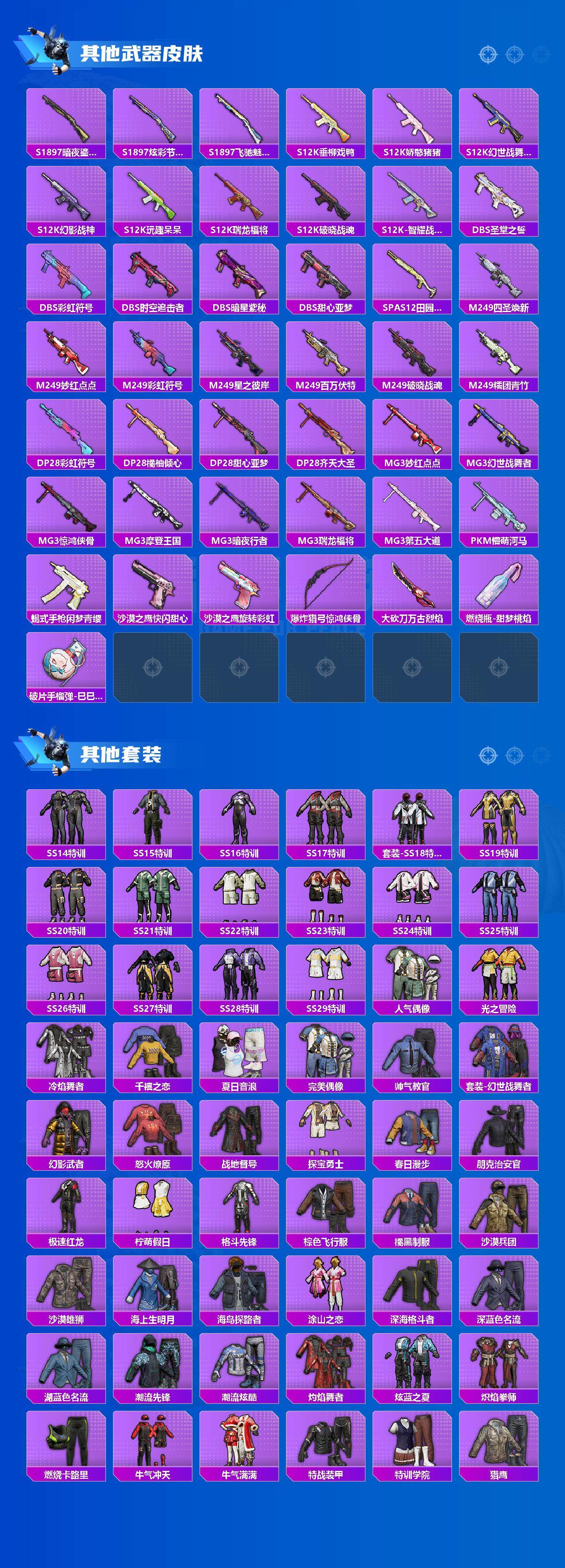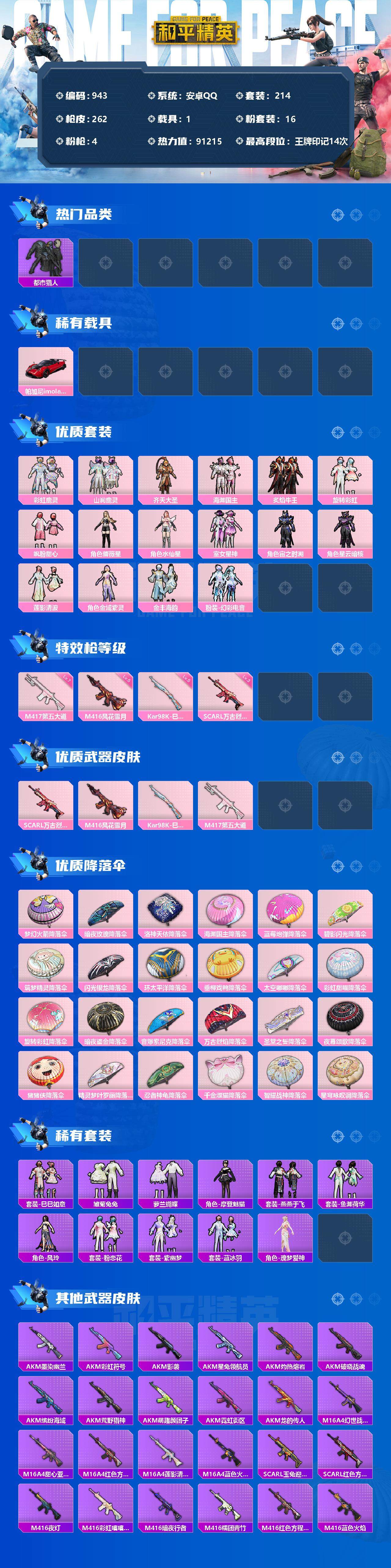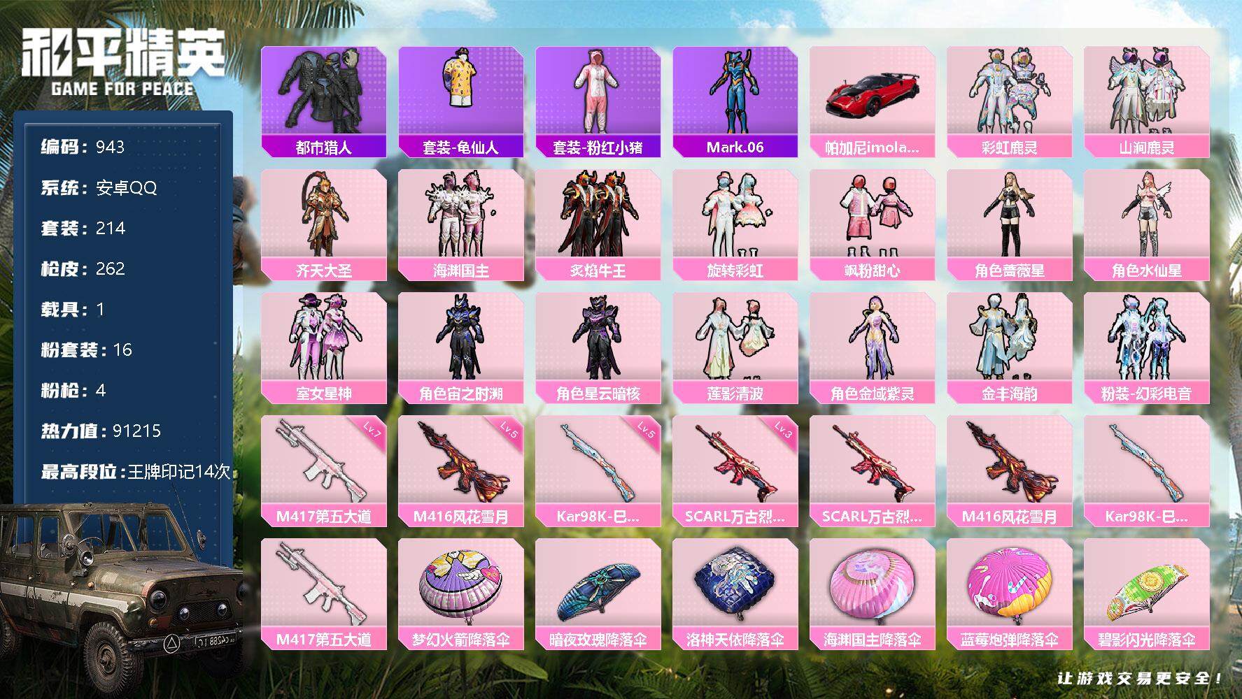 [12485708]【商品标题】:安卓 手q-16粉装-4特效呛-1载具-0粉色飞行器-91215热力值-14王牌印记-214套装-262呛皮 【热门品类】:套装-都市猎人,套装-龟仙人,套装-粉红小猪,角色-mark.06 【粉色载具】:帕加尼imola(光影红) 【粉色套装】:粉装-彩虹鹿灵,粉装-山涧鹿灵,粉装-齐天大圣,粉装-海渊国主,粉装-炙焰牛王,粉装-旋转彩虹,粉装-飒粉甜心,角色-蔷薇星,角色-水仙星,粉装-室女星神,角色-宙之时溯,角色-星云暗核,粉装-莲影清波,角色-金域紫灵,粉装-金丰海韵,粉装-幻彩电音 【粉色呛皮等级】:scar-l-万古烈焰三级,m416-风花雪月五级,kar98k-巳巳如意五级,m417-第五大道七级 【粉色呛皮】:scar-l-万古烈焰,m416-风花雪月,kar98k-巳巳如意,m417-第五大道 【粉色降落伞】:梦幻火箭降落伞,暗夜玫瑰降落伞,洛神天依降落伞,海渊国主降落伞,蓝莓炮弹降落伞,碧影闪光降落伞,筑梦精灵降落伞,闪光银龙降落伞,环太平洋降落伞,垂柳戏鸭降落伞,太空嘟嘟降落伞,彩虹甜喵降落伞,旋转彩虹降落伞,暗夜鎏金降落伞,音爆索尼克降落伞,万古烈焰降落伞,圣堂之誓降落伞,夜幕颂歌降落伞,猪猪侠降落伞,精灵梦叶罗丽降落伞,忍者神龟降落伞,千金淑猫降落伞,智耀战神降落伞,星穹咏叹调降落伞 【稀有套装】:套装-龟仙人,套装-巳巳如意,套装-雏菊兔兔,套装-萝兰蝴蝶,角色-摩登魅猫,套装-燕燕于飞,套装-鱼渊荷华,角色-风玲,套装-粉恋花,套装-紫幽梦,套装-蓝冰羽,角色-瑰梦爱神 【稀有呛皮】:akm-墨染幽兰,akm-彩虹符号,akm-影袭,akm-星兔领航员,akm-灼热熔岩,akm-破晓战魂,akm-缤纷海域,akm-荒野猎神,akm-萌趣颜团子,akm-霓虹街区,akm-龙的传人,m16a4-幻世战舞者,m16a4-甜心亚梦,m16a4-红色方程式,m16a4-莲影清波,m16a4-蓝色火焰,scar-l-玉兔迎春,scar-l-红色方程式,m416-夜灯,m416-彩虹嘻嘻猴,m416-暗夜行者,m416-糯团青竹,m416-红色方程式,m416-蓝色火焰,groza-异彩先驱,groza-彩虹符号,groza-影袭,groza-懵萌河马,groza-田园牧歌,groza-蓝莓炮弹,aug-天降萌叽,a
