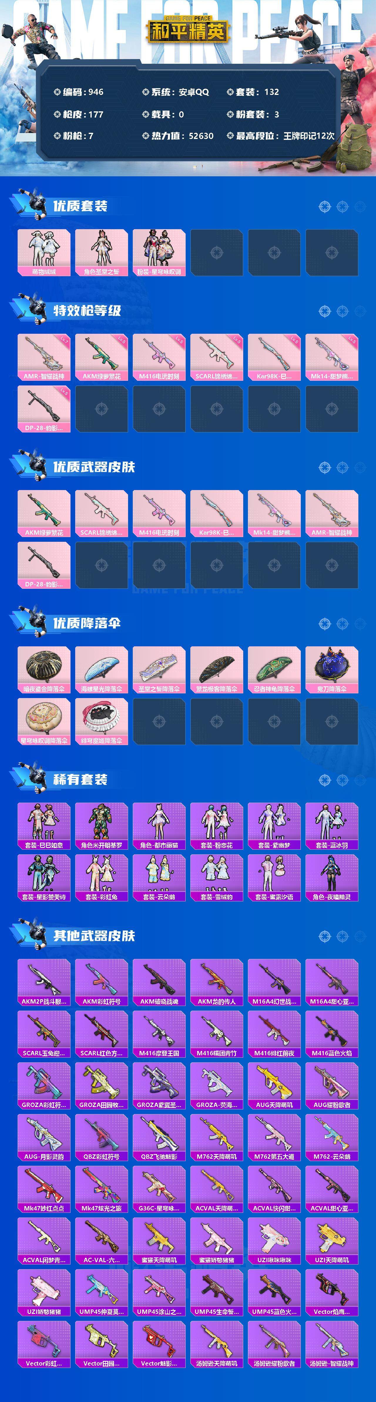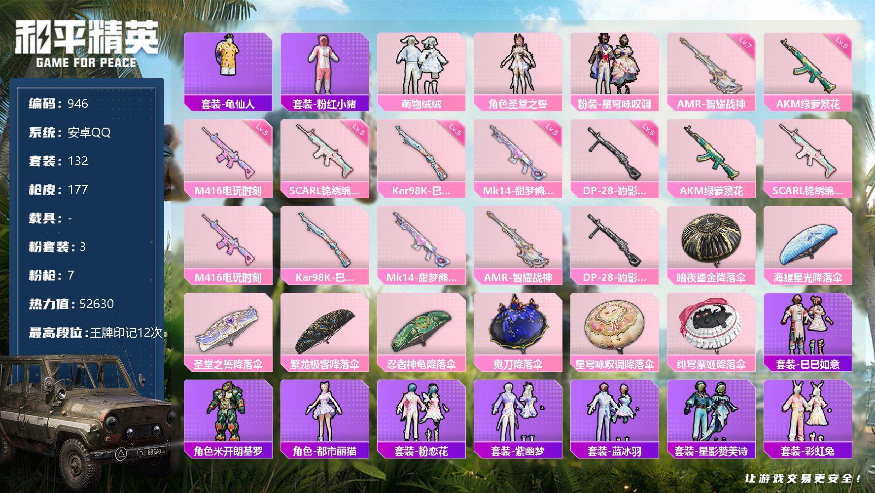 [12485728]【商品标题】:安卓 手q-3粉装-7特效呛-0载具-0粉色飞行器-52630热力值-12王牌印记-132套装-177呛皮 【热门品类】:套装-龟仙人,套装-粉红小猪 【粉色套装】:粉装-萌物绒绒,角色-圣堂之誓,粉装-星穹咏叹调 【粉色呛皮等级】:akm-绿萝繁花五级,scar-l-锦绣绵绵五级,m416-电玩时刻五级,kar98k-巳巳如意五级,mk14-甜梦熊击五级,amr-智耀战神七级,dp-28-豹影疾电五级 【粉色呛皮】:akm-绿萝繁花,scar-l-锦绣绵绵,m416-电玩时刻,kar98k-巳巳如意,mk14-甜梦熊击,amr-智耀战神,dp-28-豹影疾电 【粉色降落伞】:暗夜鎏金降落伞,海螺星光降落伞,圣堂之誓降落伞,繁龙极客降落伞,忍者神龟降落伞,鬼刀降落伞,星穹咏叹调降落伞,绯穹魔姬降落伞 【稀有套装】:套装-龟仙人,套装-巳巳如意,角色-米开朗基罗,角色-都市丽猫,套装-粉恋花,套装-紫幽梦,套装-蓝冰羽,套装-星影赞美诗,套装-彩虹兔,套装-云朵鹅,套装-雪绒豹,套装-蜜露汐语,角色-夜瞳黯灵 【稀有呛皮】:akm-2p战斗服款,akm-彩虹符号,akm-破晓战魂,akm-龙的传人,m16a4-幻世战舞者,m16a4-甜心亚梦,scar-l-玉兔迎春,scar-l-红色方程式,m416-摩登王国,m416-糯团青竹,m416-绯红前夜,m416-蓝色火焰,groza-彩虹符号,groza-田园牧歌,groza-紫翼圣骑,groza-荧海星豚,aug-天降萌叽,aug-耀粉歌者,aug-月影灵韵,q-彩虹符号,q-飞驰魅影,m762-天降萌叽,m762-第五大道,m762-云朵鹅,mk47-妙红点点,mk47-炫光之旅,g36c-星穹咏叹调,ac-val-天降萌叽,ac-val-快闪甜心,ac-val-甜心亚梦,ac-val-闲梦青缨,ac-val-六号稻草人,蜜獾-天降萌叽,蜜獾-娇憨猪猪,uzi-啾咪啾咪,uzi-天降萌叽,uzi-娇憨猪猪,ump45-仲夏莫吉托,ump45-涂山之恋,ump45-生命誓言,ump45-蓝色火焰,vect-焰鹰斗篷,vect-彩虹符号,vect-田园牧歌,vect-魅影蝠王,汤姆逊-天降萌叽,汤姆逊-耀粉歌者,汤姆逊-智耀战神,aks-74u-鬼刀,