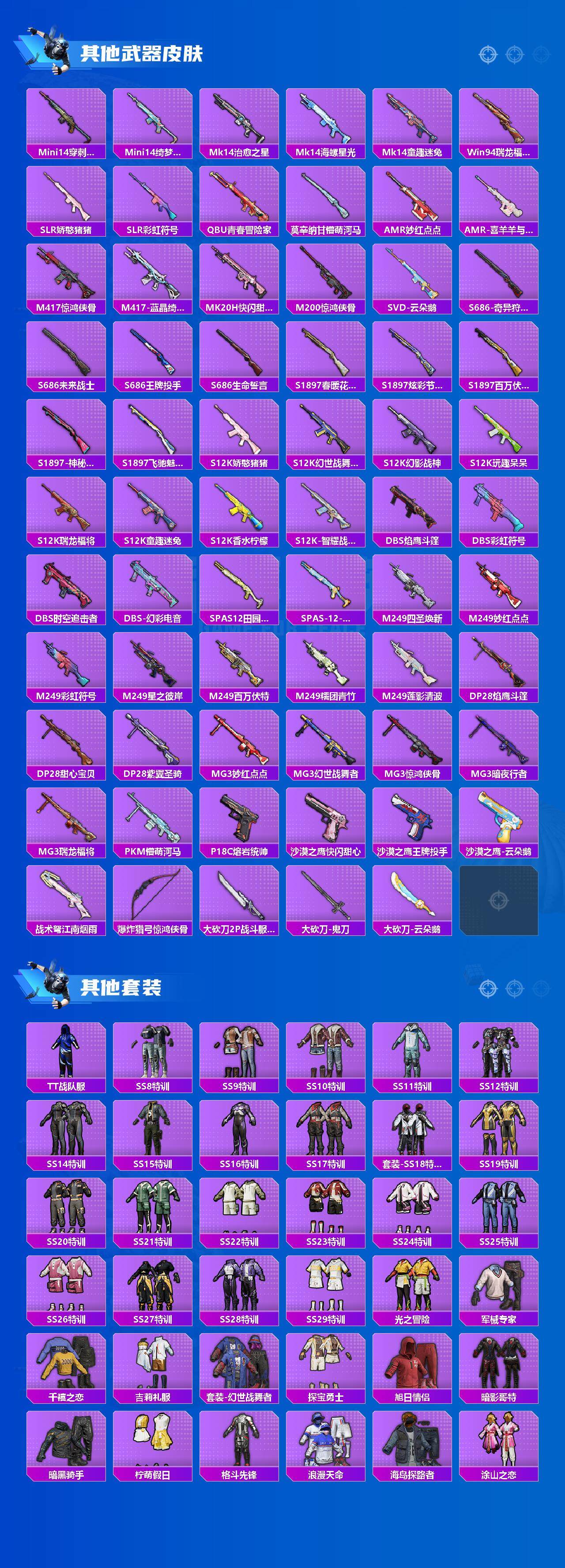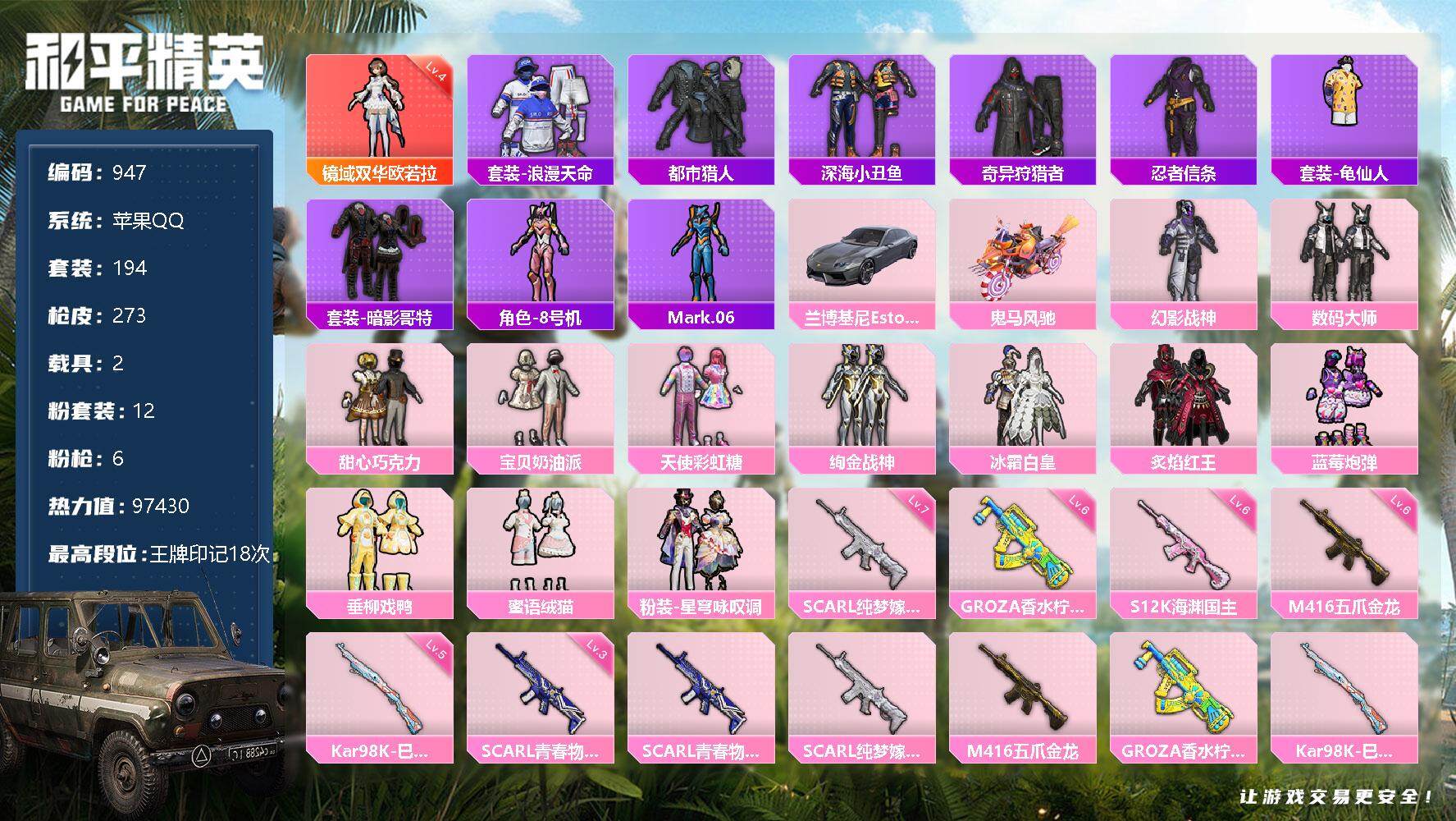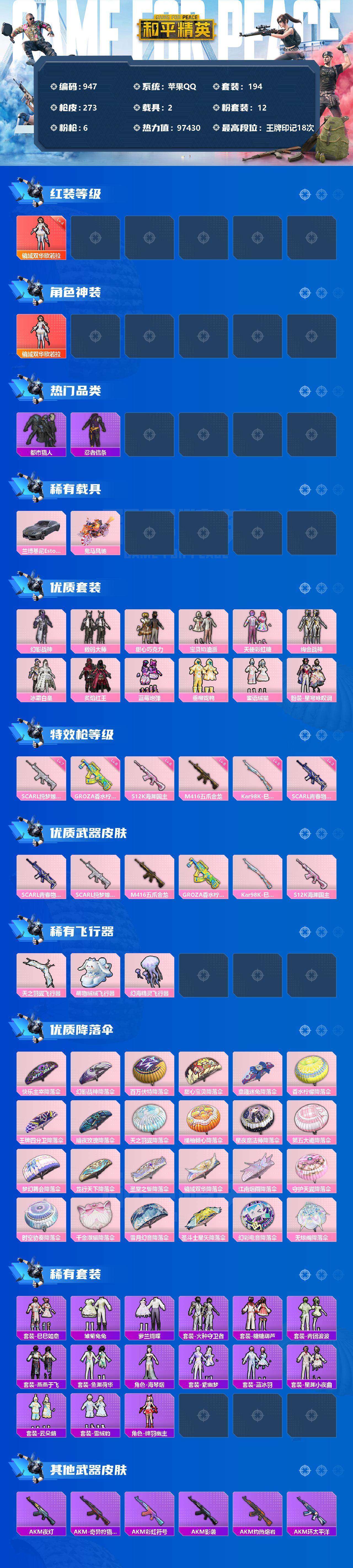 [12485738]【商品标题】:苹果 手q-1神装-12粉装-6特效呛-2载具-3粉色飞行器-97430热力值-18王牌印记-194套装-273呛皮 【红色神装等级】:镜域双华-欧若拉四级 【红色角色神装】:镜域双华-欧若拉 【热门品类】:套装-浪漫天命,套装-都市猎人,套装-深海小丑鱼,套装-奇异狩猎者,套装-忍者信条,套装-龟仙人,套装-暗影哥特,角色-8号机,角色-mark.06 【粉色载具】:兰博基尼estoque(银翼灰),鬼马风驰 【粉色套装】:粉装-幻影战神,粉装-数码大师,粉装-甜心巧克力,粉装-宝贝奶油派,粉装-天使彩虹糖,粉装-绚金战神,粉装-冰霜白皇,粉装-炙焰红王,粉装-蓝莓炮弹,粉装-垂柳戏鸭,粉装-蜜语绒猫,粉装-星穹咏叹调 【粉色呛皮等级】:scar-l-青春物语三级,scar-l-纯梦嫁纱七级,m416-五爪金龙六级,groza-香水柠檬六级,kar98k-巳巳如意五级,s12k-海渊国主六级 【粉色呛皮】:scar-l-青春物语,scar-l-纯梦嫁纱,m416-五爪金龙,groza-香水柠檬,kar98k-巳巳如意,s12k-海渊国主 【粉色飞行器】:天之羽翼飞行器,萌物绒绒飞行器,幻海精灵飞行器 【粉色降落伞】:快乐主宰降落伞,幻影战神降落伞,百万伏特降落伞,甜心宝贝降落伞,童趣迷兔降落伞,香水柠檬降落伞,王牌四分卫降落伞,暗夜玫瑰降落伞,天之羽翼降落伞,橘柚倾心降落伞,星夜魔法师降落伞,第五大道降落伞,梦幻舞会降落伞,龙行天下降落伞,圣堂之誓降落伞,镜域双华降落伞,江南烟雨降落伞,守护天翼降落伞,时空协奏降落伞,千金淑猫降落伞,雪月幻音降落伞,圣斗士星矢降落伞,幻彩电音降落伞,无垠阁降落伞 【稀有套装】:套装-龟仙人,套装-巳巳如意,套装-雏菊兔兔,套装-萝兰蝴蝶,套装-火种守卫者,套装-糖糖葫芦,套装-青团波波,套装-燕燕于飞,套装-鱼渊荷华,角色-海琴烟,套装-紫幽梦,套装-蓝冰羽,套装-星渊小夜曲,套装-云朵鹅,套装-雪绒豹,角色-绛羽幽主 【稀有呛皮】:akm-夜灯,akm-奇异狩猎者,akm-彩虹符号,akm-影袭,akm-灼热熔岩,akm-环太平洋,akm-生命誓言,akm-萌趣颜团子,akm-虎虎生威,akm-霓虹街区,akm-龙的传人,m16a4-幻世战舞者,m16a4-快乐主宰,m16a4-蓝色火