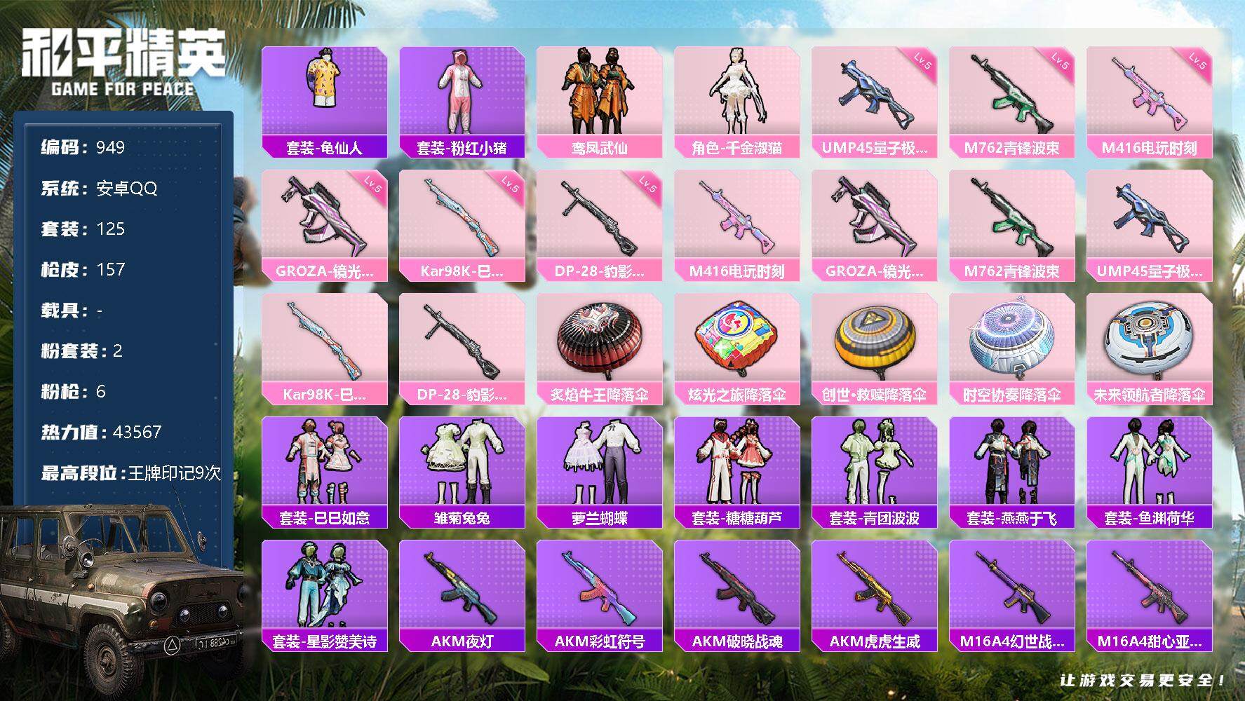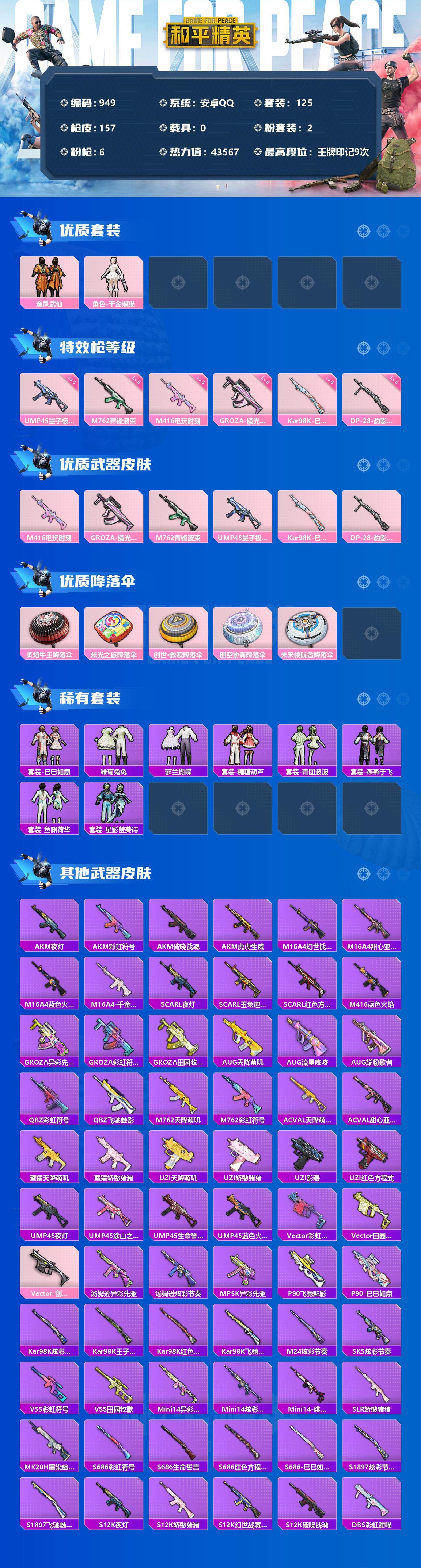 [12485748]【商品标题】:安卓 手q-2粉装-6特效呛-0载具-0粉色飞行器-43567热力值-9王牌印记-125套装-157呛皮 【热门品类】:套装-龟仙人,套装-粉红小猪 【粉色套装】:粉装-鸾凤武仙,角色-千金淑猫 【粉色呛皮等级】:m416-电玩时刻五级,groza-镜光银凌五级,m762-青锋波束五级,ump45-量子极限五级,kar98k-巳巳如意五级,dp-28-豹影疾电五级 【粉色呛皮】:m416-电玩时刻,groza-镜光银凌,m762-青锋波束,ump45-量子极限,kar98k-巳巳如意,dp-28-豹影疾电 【粉色降落伞】:炙焰牛王降落伞,炫光之旅降落伞,创世·救赎降落伞,时空协奏降落伞,未来领航者降落伞 【稀有套装】:套装-龟仙人,套装-巳巳如意,套装-雏菊兔兔,套装-萝兰蝴蝶,套装-糖糖葫芦,套装-青团波波,套装-燕燕于飞,套装-鱼渊荷华,套装-星影赞美诗 【稀有呛皮】:akm-夜灯,akm-彩虹符号,akm-破晓战魂,akm-虎虎生威,m16a4-幻世战舞者,m16a4-甜心亚梦,m16a4-蓝色火焰,m16a4-千金淑猫,scar-l-夜灯,scar-l-玉兔迎春,scar-l-红色方程式,m416-蓝色火焰,groza-异彩先驱,groza-彩虹符号,groza-田园牧歌,aug-天降萌叽,aug-流星咚咚,aug-耀粉歌者,q-彩虹符号,q-飞驰魅影,m762-天降萌叽,m762-彩虹符号,ac-val-天降萌叽,ac-val-甜心亚梦,蜜獾-天降萌叽,蜜獾-娇憨猪猪,uzi-天降萌叽,uzi-娇憨猪猪,uzi-影袭,uzi-红色方程式,ump45-夜灯,ump45-涂山之恋,ump45-生命誓言,ump45-蓝色火焰,vect-彩虹符号,vect-田园牧歌,vect-创世·救赎,汤姆逊-异彩先驱,汤姆逊-炫彩节奏,mp5k-异彩先驱,p90-飞驰魅影,p90-巳巳如意,kar98k-炫彩节奏,kar98k-王子的夏天,kar98k-红色方程式,kar98k-飞驰魅影,m24-炫彩节奏,sks-炫彩节奏,vss-彩虹符号,vss-田园牧歌,mini14-异彩先驱,mini14-炫彩节奏,mini14-绯穹魔姬,slr-娇憨猪猪,mk20-h-墨染幽兰,s686-彩虹符号,s686-生命誓言,s68