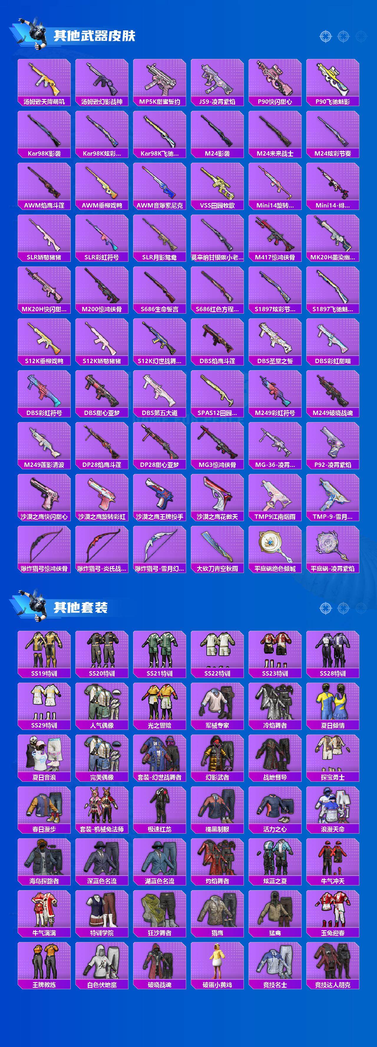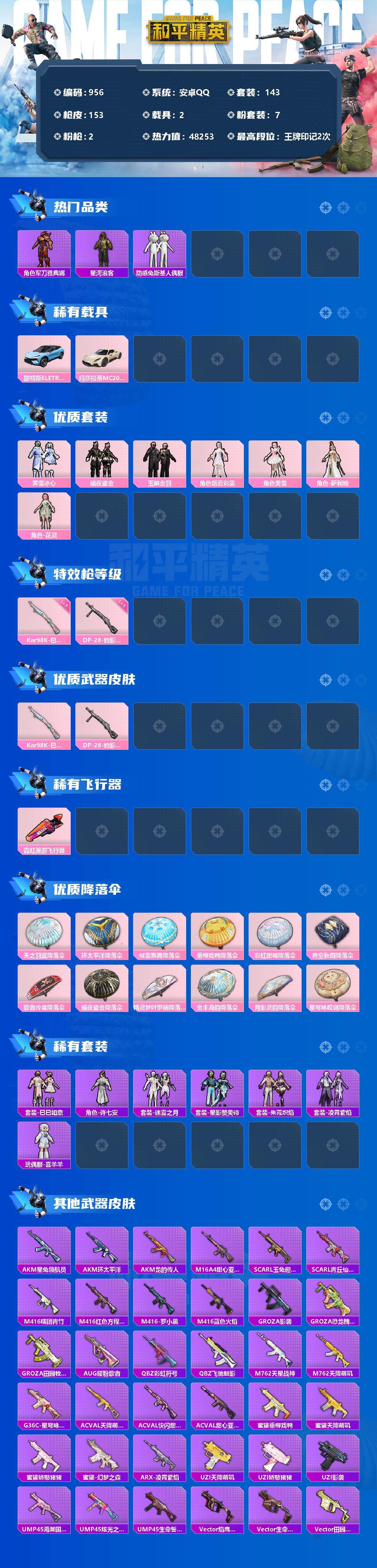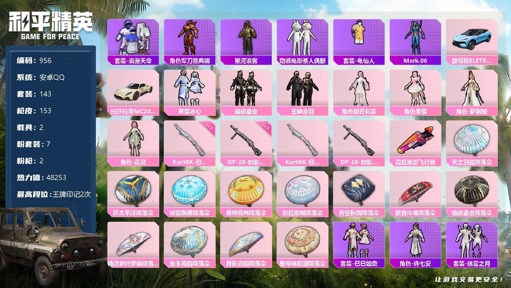 [12485781]【商品标题】:安卓 手q-7粉装-2特效呛-2载具-1粉色飞行器-48253热力值-2王牌印记-143套装-153呛皮 【热门品类】:套装-浪漫天命,角色-军刀雅典娜,套装-星河浪客,套装-动感兔斯基人偶服,套装-龟仙人,角色-mark.06 【粉色载具】:路特斯eletre(冰川蓝),玛莎拉蒂mc20(星石白) 【粉色套装】:粉装-霁雪冰心,粉装-暗夜鎏金,粉装-玉鳞金羽,角色-烟云彩露,角色-美雪,角色-萨利娅,角色-花灵 【粉色呛皮等级】:kar98k-巳巳如意五级,dp-28-豹影疾电五级 【粉色呛皮】:kar98k-巳巳如意,dp-28-豹影疾电 【粉色飞行器】:霓虹漫游飞行器 【粉色降落伞】:天之羽翼降落伞,环太平洋降落伞,绒雪飘舞降落伞,垂柳戏鸭降落伞,彩虹甜喵降落伞,青空秋雨降落伞,歌者泠鸢降落伞,暗夜鎏金降落伞,精灵梦叶罗丽降落伞,金丰海韵降落伞,月影灵韵降落伞,星穹咏叹调降落伞 【稀有套装】:套装-龟仙人,套装-巳巳如意,角色-许七安,套装-迷雾之月,套装-星影赞美诗,套装-朱霞炽焰,套装-凌霄紫焰,玩偶服-喜羊羊 【稀有呛皮】:akm-星兔领航员,akm-环太平洋,akm-龙的传人,m16a4-甜心亚梦,scar-l-玉兔迎春,scar-l-青丘仙客,m416-糯团青竹,m416-红色方程式,m416-罗小黑,m416-蓝色火焰,groza-影袭,groza-恐龙拽拽,groza-田园牧歌,aug-耀粉歌者,q-彩虹符号,q-飞驰魅影,m762-天星战神,m762-天降萌叽,g36c-星穹咏叹调,ac-val-天降萌叽,ac-val-快闪甜心,ac-val-甜心亚梦,蜜獾-垂柳戏鸭,蜜獾-天降萌叽,蜜獾-娇憨猪猪,蜜獾-幻梦之森,arx-凌霄紫焰,uzi-天降萌叽,uzi-娇憨猪猪,uzi-影袭,ump45-海渊国主,ump45-炫光之旅,ump45-生命誓言,vect-焰鹰斗篷,vect-生命誓言,vect-田园牧歌,汤姆逊-天降萌叽,汤姆逊-幻影战神,mp5k-甜蜜誓约,js9-凌霄紫焰,p90-快闪甜心,p90-飞驰魅影,kar98k-影袭,kar98k-炫彩节奏,kar98k-飞驰魅影,m24-影袭,m24-未来战士,m24-炫彩节奏,awm-焰鹰斗篷,awm-垂柳戏鸭,awm-音爆索尼克,vss-田园牧歌