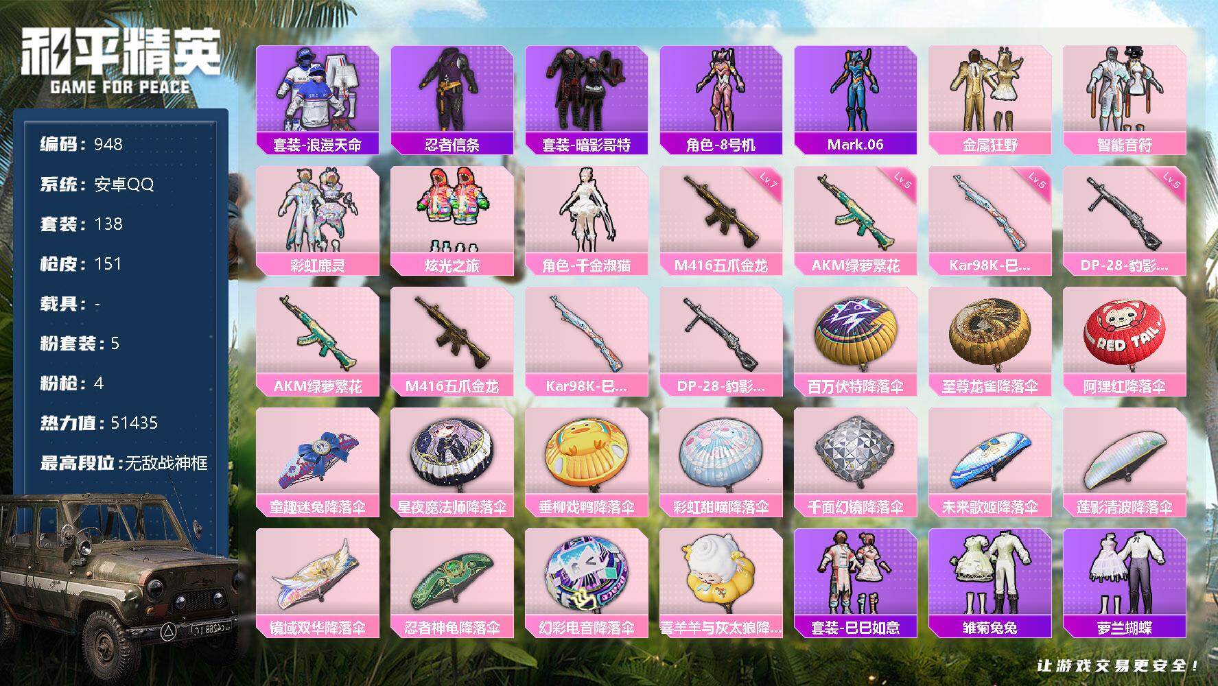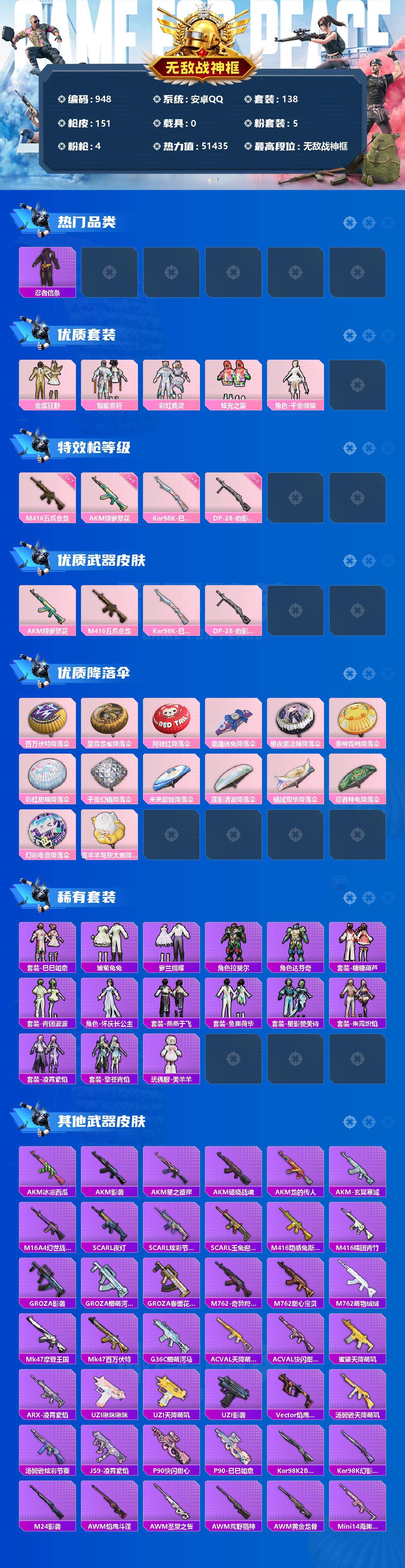 [12485809]【商品标题】:安卓 手q-无敌战神框-5粉装-4特效呛-0载具-1粉色飞行器-51435热力值-12王牌印记-138套装-151呛皮 【热门品类】:套装-浪漫天命,套装-忍者信条,套装-暗影哥特,角色-8号机,角色-mark.06 【粉色套装】:粉装-金属狂野,粉装-智能音符,粉装-彩虹鹿灵,粉装-炫光之旅,角色-千金淑猫 【粉色呛皮等级】:akm-绿萝繁花五级,m416-五爪金龙七级,kar98k-巳巳如意五级,dp-28-豹影疾电五级 【粉色呛皮】:akm-绿萝繁花,m416-五爪金龙,kar98k-巳巳如意,dp-28-豹影疾电 【粉色降落伞】:百万伏特降落伞,至尊龙雀降落伞,阿狸红降落伞,童趣迷兔降落伞,星夜魔法师降落伞,垂柳戏鸭降落伞,彩虹甜喵降落伞,千面幻镜降落伞,未来歌姬降落伞,莲影清波降落伞,镜域双华降落伞,忍者神龟降落伞,幻彩电音降落伞,喜羊羊与灰太狼降落伞 【稀有套装】:套装-巳巳如意,套装-雏菊兔兔,套装-萝兰蝴蝶,角色-拉斐尔,角色-达芬奇,套装-糖糖葫芦,套装-青团波波,角色-怀庆长公主,套装-燕燕于飞,套装-鱼渊荷华,套装-星影赞美诗,套装-朱霞炽焰,套装-凌霄紫焰,套装-擎苍青焰,玩偶服-美羊羊 【稀有呛皮】:akm-冰凉西瓜,akm-影袭,akm-星之彼岸,akm-破晓战魂,akm-龙的传人,akm-玄冥寒域,m16a4-幻世战舞者,scar-l-夜灯,scar-l-炫彩节奏,scar-l-玉兔迎春,m416-动感兔斯基,m416-糯团青竹,groza-影袭,groza-懵萌河马,groza-春暖花开,m762-奇异狩猎者,m762-甜心宝贝,m762-萌物绒绒,mk47-摩登王国,mk47-百万伏特,g36c-懵萌河马,ac-val-天降萌叽,ac-val-快闪甜心,蜜獾-天降萌叽,arx-凌霄紫焰,uzi-啾咪啾咪,uzi-天降萌叽,uzi-影袭,vect-焰鹰斗篷,汤姆逊-天降萌叽,汤姆逊-炫彩节奏,js9-凌霄紫焰,p90-快闪甜心,p90-巳巳如意,kar98k-2b战斗服款,kar98k-幻影战神,m24-影袭,awm-焰鹰斗篷,awm-圣堂之誓,awm-荒野猎神,awm-黄金龙骨,mini14-海渊国主,mini14-耀粉歌者,mk14-是爱神辣,mk14-童趣迷兔,莫辛纳甘-懵萌河马,莫辛纳甘-银