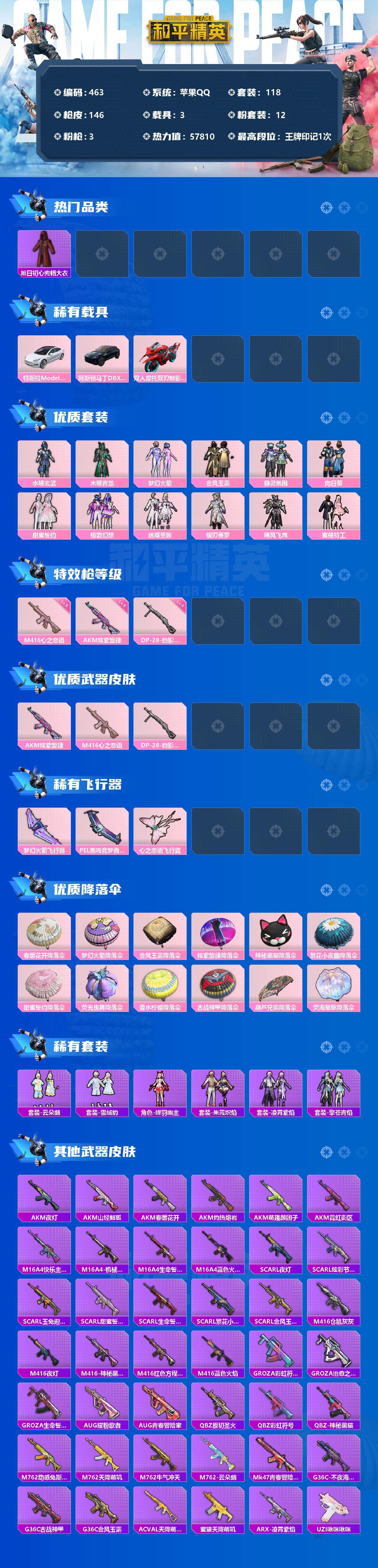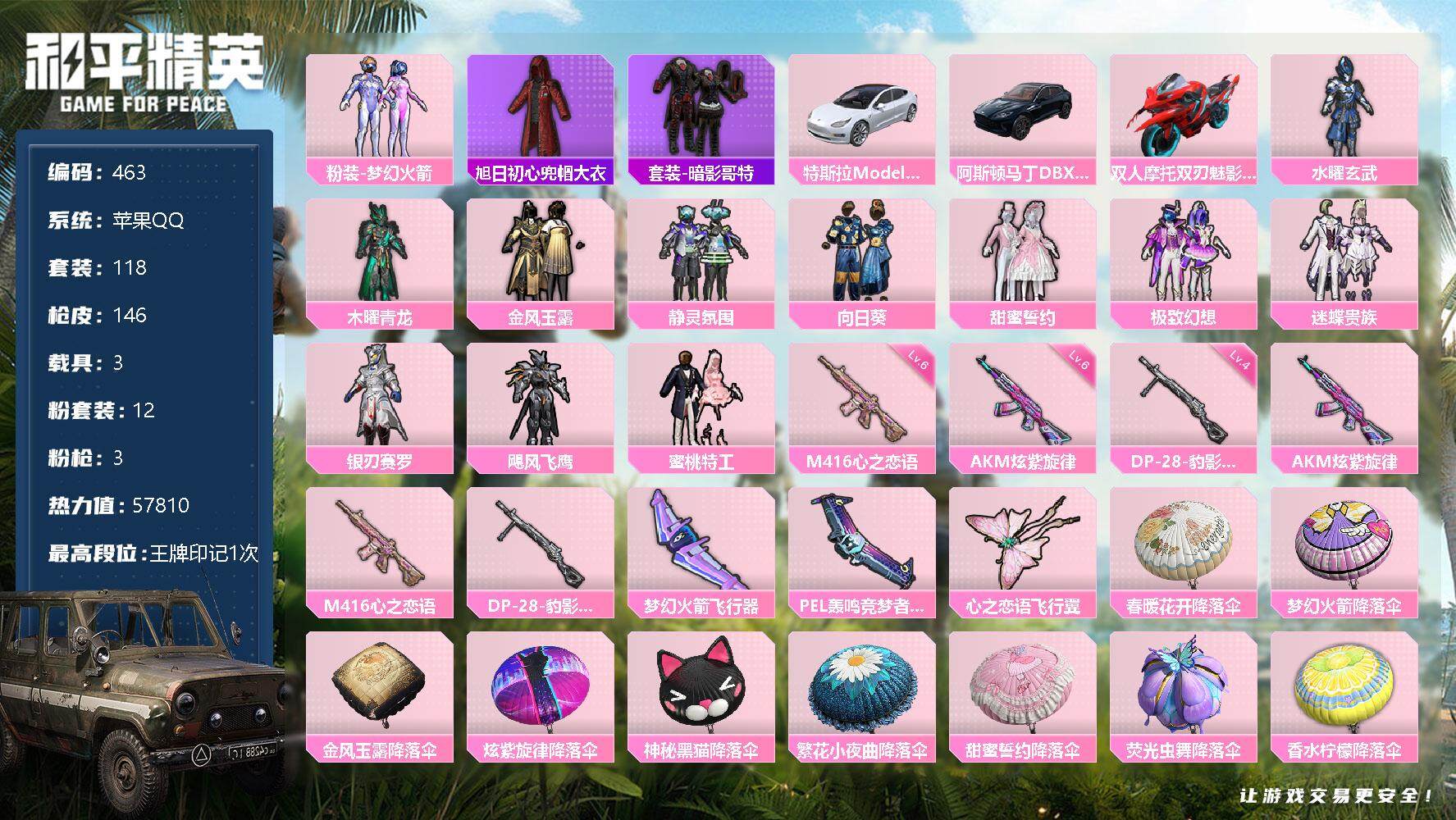 [12598809]苹果 手q-12粉装-3特效呛-3载具-3粉色飞行器-57810热力值-1王牌印记-118套装-146呛皮 【热门品类】:粉装-梦幻火箭,旭日初心兜帽大衣,套装-暗影哥特 【粉色载具】:特斯拉model 3(珍珠白),阿斯顿马丁dbx(蓝),双人摩托-双刃魅影(红) 【粉色套装】:粉装-水曜玄武,粉装-木曜青龙,粉装-梦幻火箭,粉装-金风玉露,粉装-静灵氛围,粉装-向日葵,粉装-甜蜜誓约,粉装-极致幻想,粉装-迷蝶贵族,粉装-银刃赛罗,粉装-飓风飞鹰,粉装-蜜桃特工 【粉色呛皮等级】:akm-炫紫旋律六级,m416-心之恋语六级,dp-28-豹影疾电四级 【粉色呛皮】:akm-炫紫旋律,m416-心之恋语,dp-28-豹影疾电 【粉色飞行器】:梦幻火箭飞行器,pel轰鸣竞梦者飞行器,心之恋语飞行翼 【粉色降落伞】:春暖花开降落伞,梦幻火箭降落伞,金风玉露降落伞,炫紫旋律降落伞,神秘黑猫降落伞,繁花小夜曲降落伞,甜蜜誓约降落伞,荧光虫舞降落伞,香水柠檬降落伞,古战神甲降落伞,葫芦兄弟降落伞,荧海星豚降落伞 【稀有套装】:套装-云朵鹅,套装-雪绒豹,角色-绛羽幽主,套装-朱霞炽焰,套装-凌霄紫焰,套装-擎苍青焰 【稀有呛皮】:akm-夜灯,akm-山经魅狐,akm-春暖花开,akm-灼热熔岩,akm-萌趣颜团子,akm-霓虹街区,m16a4-快乐主宰,m16a4-机械英豪,m16a4-生命誓言,m16a4-蓝色火焰,scar-l-夜灯,scar-l-炫彩节奏,scar-l-玉兔迎春,scar-l-甜蜜誓约,scar-l-生命誓言,scar-l-繁花小夜曲,scar-l-金风玉露,m416-仓鼠灰灰,m416-夜灯,m416-神秘黑猫,m416-红色方程式,m416-蓝色火焰,groza-彩虹符号,groza-治愈之星,groza-生命誓言,aug-耀粉歌者,aug-青春冒险家,q-原初圣火,q-彩虹符号,q-神秘黑猫,m762-动感兔斯基,m762-天降萌叽,m762-牛气冲天,m762-云朵鹅,mk47-青春冒险家,g36c-不夜海上花,g36c-古战神甲,g36c-金风玉露,ac-val-天降萌叽,蜜獾-天降萌叽,arx-凌霄紫焰,uzi-啾咪啾咪,uzi-天降萌叽,uzi-红色方程式,uzi-金风玉露,ump45-蓝色火焰,vect-