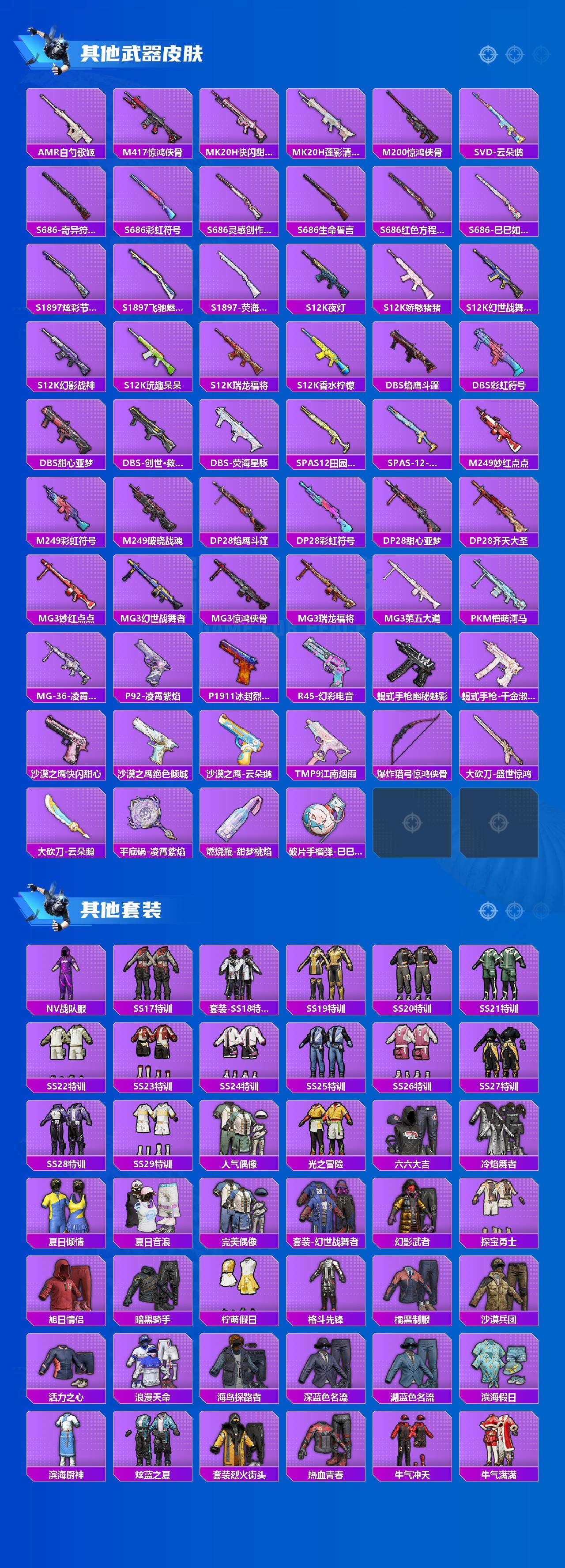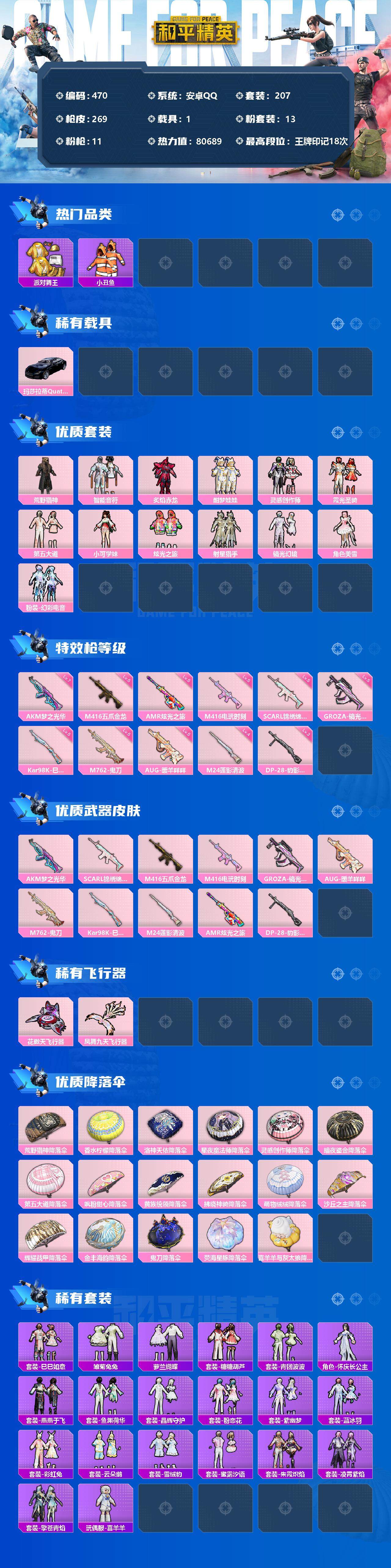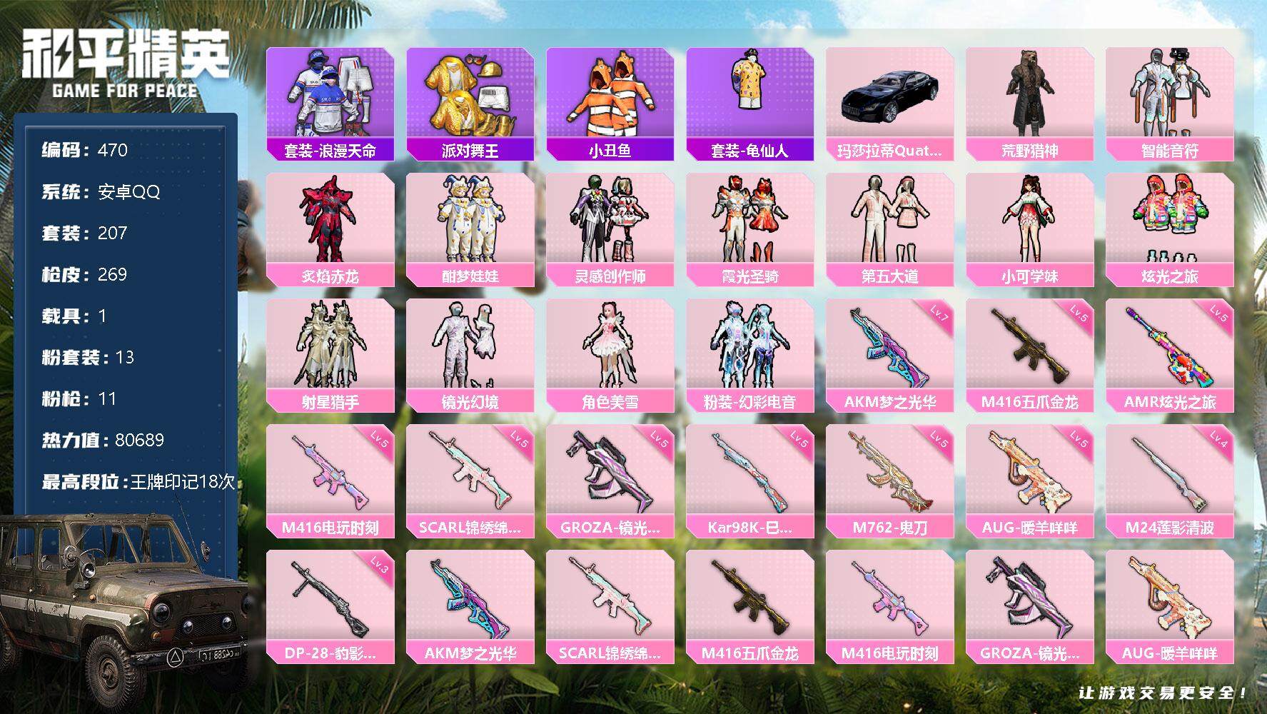 [12598820]安卓 手q-13粉装-11特效呛-1载具-2粉色飞行器-80689热力值-18王牌印记-207套装-269呛皮 【热门品类】:套装-浪漫天命,套装-派对舞王,套装-小丑鱼,套装-龟仙人 【粉色载具】:玛莎拉蒂quattropte(夜幕蓝) 【粉色套装】:粉装-荒野猎神,粉装-智能音符,粉装-炙焰赤龙,粉装-酣梦娃娃,粉装-灵感创作师,粉装-霞光圣骑,粉装-第五大道,角色-小可学妹,粉装-炫光之旅,粉装-射星猎手,粉装-镜光幻境,角色-美雪,粉装-幻彩电音 【粉色呛皮等级】:akm-梦之光华七级,scar-l-锦绣绵绵五级,m416-五爪金龙五级,m416-电玩时刻五级,groza-镜光银凌五级,aug-暖羊咩咩五级,m762-鬼刀五级,kar98k-巳巳如意五级,m24-莲影清波四级,amr-炫光之旅五级,dp-28-豹影疾电三级 【粉色呛皮】:akm-梦之光华,scar-l-锦绣绵绵,m416-五爪金龙,m416-电玩时刻,groza-镜光银凌,aug-暖羊咩咩,m762-鬼刀,kar98k-巳巳如意,m24-莲影清波,amr-炫光之旅,dp-28-豹影疾电 【粉色飞行器】:花傲天飞行器,凤舞九天飞行器 【粉色降落伞】:荒野猎神降落伞,香水柠檬降落伞,洛神天依降落伞,星夜魔法师降落伞,灵感创作师降落伞,暗夜鎏金降落伞,第五大道降落伞,飒粉甜心降落伞,黄族统领降落伞,拂晓神骑降落伞,萌物绒绒降落伞,沙丘之主降落伞,辉耀战甲降落伞,金丰海韵降落伞,鬼刀降落伞,荧海星豚降落伞,喜羊羊与灰太狼降落伞 【稀有套装】:套装-龟仙人,套装-巳巳如意,套装-雏菊兔兔,套装-萝兰蝴蝶,套装-糖糖葫芦,套装-青团波波,角色-怀庆长公主,套装-燕燕于飞,套装-鱼渊荷华,套装-晶辉守护,套装-粉恋花,套装-紫幽梦,套装-蓝冰羽,套装-彩虹兔,套装-云朵鹅,套装-雪绒豹,套装-蜜露汐语,套装-朱霞炽焰,套装-凌霄紫焰,套装-擎苍青焰,玩偶服-喜羊羊 【稀有呛皮】:akm-小鹦鹉bebe,akm-彩虹符号,akm-星兔领航员,akm-灼热熔岩,akm-破晓战魂,akm-缤纷海域,akm-荒野猎神,akm-虎虎生威,akm-霓虹街区,akm-龙的传人,m16a4-幻世战舞者,m16a4-甜心亚梦,m16a4-莲影清波,m16a4-蓝色火焰,sc