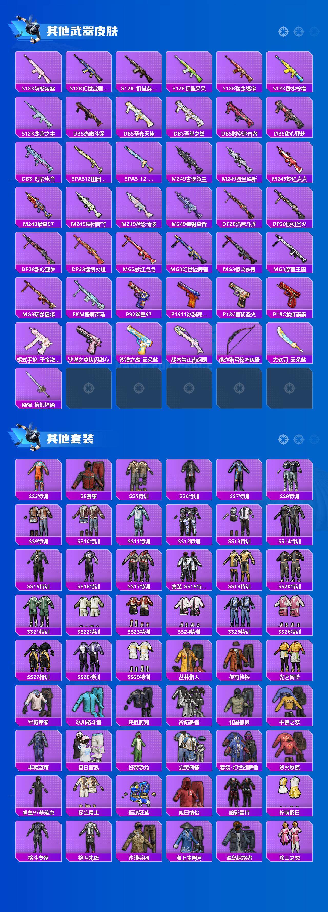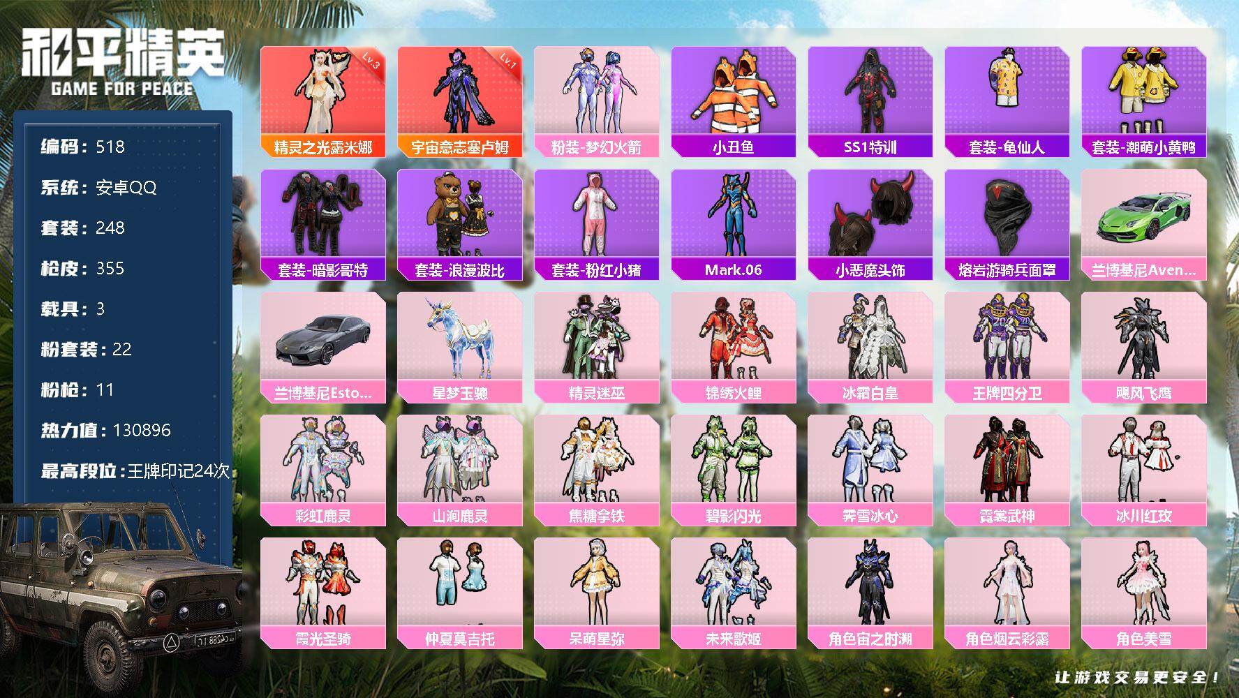 [12598853]安卓 手q-2神装-22粉装-11特效呛-3载具-10粉色飞行器-130896热力值-24王牌印记-248套装-355呛皮 【红色神装等级】:精灵之光-露米娜三级,宇宙意志-塞卢姆一级 【红色角色神装】:精灵之光-露米娜,宇宙意志-塞卢姆 【热门品类】:粉装-梦幻火箭,套装-小丑鱼,套装-ss1特训,套装-龟仙人,套装-潮萌小黄鸭,套装-暗影哥特,套装-浪漫波比,套装-粉红小猪,角色-mark.06,小恶魔头饰,熔岩游骑兵面罩 【粉色载具】:兰博基尼aventad svj(翡翠绿),兰博基尼estoque(银翼灰),星梦玉骢 【粉色套装】:粉装-精灵迷巫,粉装-梦幻火箭,粉装-锦绣火鲤,粉装-冰霜白皇,粉装-王牌四分卫,粉装-飓风飞鹰,粉装-彩虹鹿灵,粉装-山涧鹿灵,粉装-焦糖拿铁,粉装-碧影闪光,粉装-霁雪冰心,粉装-霓裳武神,粉装-冰川红玫,粉装-霞光圣骑,粉装-仲夏莫吉托,角色-呆萌星弥,粉装-未来歌姬,角色-宙之时溯,角色-烟云彩露,角色-美雪,角色-光极星,角色-月影灵韵 【粉色呛皮等级】:akm-炫紫旋律六级,scar-l-童趣迷兔六级,m416-心之恋语七级,groza-巴啦啦小魔仙四级,groza-精灵之光三级,p90-粉樱探戈六级,kar98k-巳巳如意三级,mk14-甜梦熊击五级,dp-28-豹影疾电五级,mg3-洛神天依六级,爆炸猎弓-拳皇·狂花道四级 【粉色呛皮】:akm-炫紫旋律,scar-l-童趣迷兔,m416-心之恋语,groza-巴啦啦小魔仙,groza-精灵之光,p90-粉樱探戈,kar98k-巳巳如意,mk14-甜梦熊击,dp-28-豹影疾电,mg3-洛神天依,爆炸猎弓-拳皇·狂花道 【粉色飞行器】:春暖花开飞行器,梦幻火箭飞行器,辉耀战甲飞行器,龙翔九天飞行器,幻海精灵飞行器,深渊漩涡飞行器,曦光华影飞行器,时光之誓飞行器 【粉色降落伞】:凝视深渊降落伞,至尊龙雀降落伞,春暖花开降落伞,炫紫旋律降落伞,神秘黑猫降落伞,甜蜜誓约降落伞,潮汐统领降落伞,暗夜玫瑰降落伞,洛神天依降落伞,海渊国主降落伞,天之羽翼降落伞,焦糖拿铁降落伞,恐龙拽拽降落伞,橘柚倾心降落伞,筑梦精灵降落伞,环太平洋降落伞,旋转彩虹降落伞,暗夜鎏金降落伞,未来歌姬降落伞,莲影清波降落伞,圣堂之誓降落伞,小