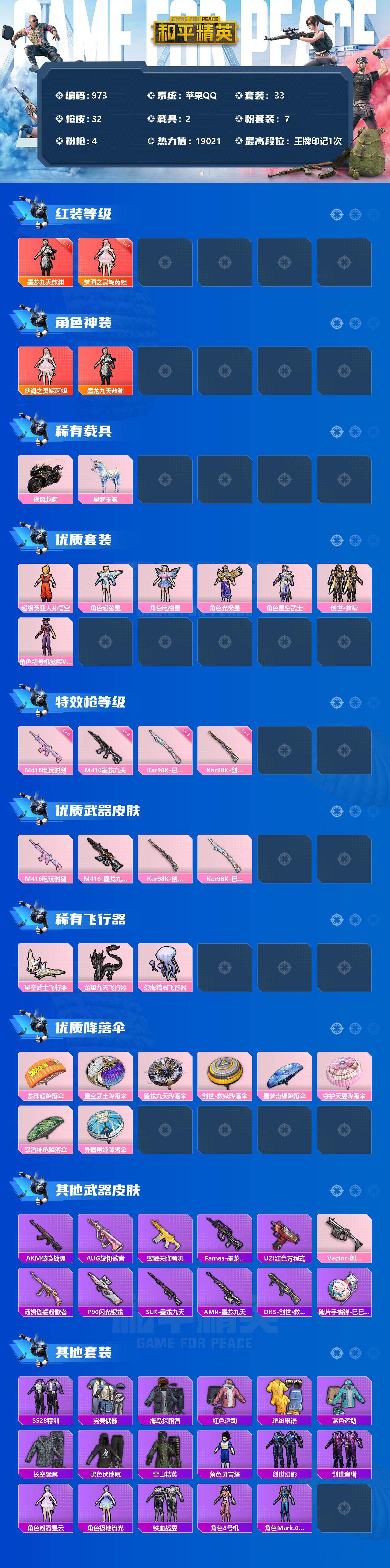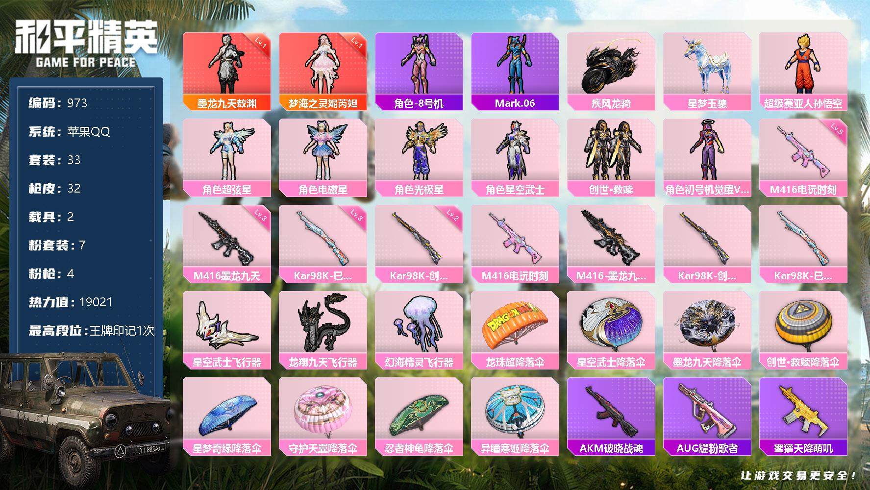 [12599255]苹果 手q-2神装-7粉装-4特效呛-2载具-4粉色飞行器-19021热力值-1王牌印记-33套装-32呛皮 【红色神装等级】:梦海之灵-妮芮妲一级,墨龙九天-敖渊一级 【红色角色神装】:梦海之灵-妮芮妲,墨龙九天-敖渊 【热门品类】:角色-8号机,角色-mark.06 【粉色载具】:疾风龙骑,星梦玉骢 【粉色套装】:超级赛亚人-孙悟空,角色-超弦星,角色-电磁星,角色-光极星,角色-星空武士,套装-创世·救赎,角色-初号机 觉醒ver. 【粉色呛皮等级】:m416-电玩时刻五级,m416-墨龙九天三级,kar98k-创世·救赎二级,kar98k-巳巳如意三级 【粉色呛皮】:m416-电玩时刻,m416-墨龙九天,kar98k-创世·救赎,kar98k-巳巳如意 【粉色飞行器】:星空武士飞行器,龙翔九天飞行器,幻海精灵飞行器 【粉色降落伞】:龙珠超降落伞,星空武士降落伞,墨龙九天降落伞,创世·救赎降落伞,星梦奇缘降落伞,守护天翼降落伞,忍者神龟降落伞,异瞳寒姬降落伞 【稀有呛皮】:akm-破晓战魂,aug-耀粉歌者,蜜獾-天降萌叽,famas-墨龙九天,uzi-红色方程式,vect-创世·救赎,汤姆逊-耀粉歌者,p90-闪光银龙,slr-墨龙九天,amr-墨龙九天,dbs-创世·救赎,破片手留单-巳巳如意 【其他套装】:套装-ss28特训,套装-完美偶像,套装-海岛探路者,套装-红色运动,套装-缤纷果语,套装-蓝色运动,套装-长空猛禽,套装-黑色伏地魔,套装-雪山精英,角色-贝吉塔,套装-创世·幻影,套装-创世·追猎,角色-粉雾星云,角色-极地流光,套装-铁血战翼,角色-8号机,角色-mark.06 【营地id】:967191267