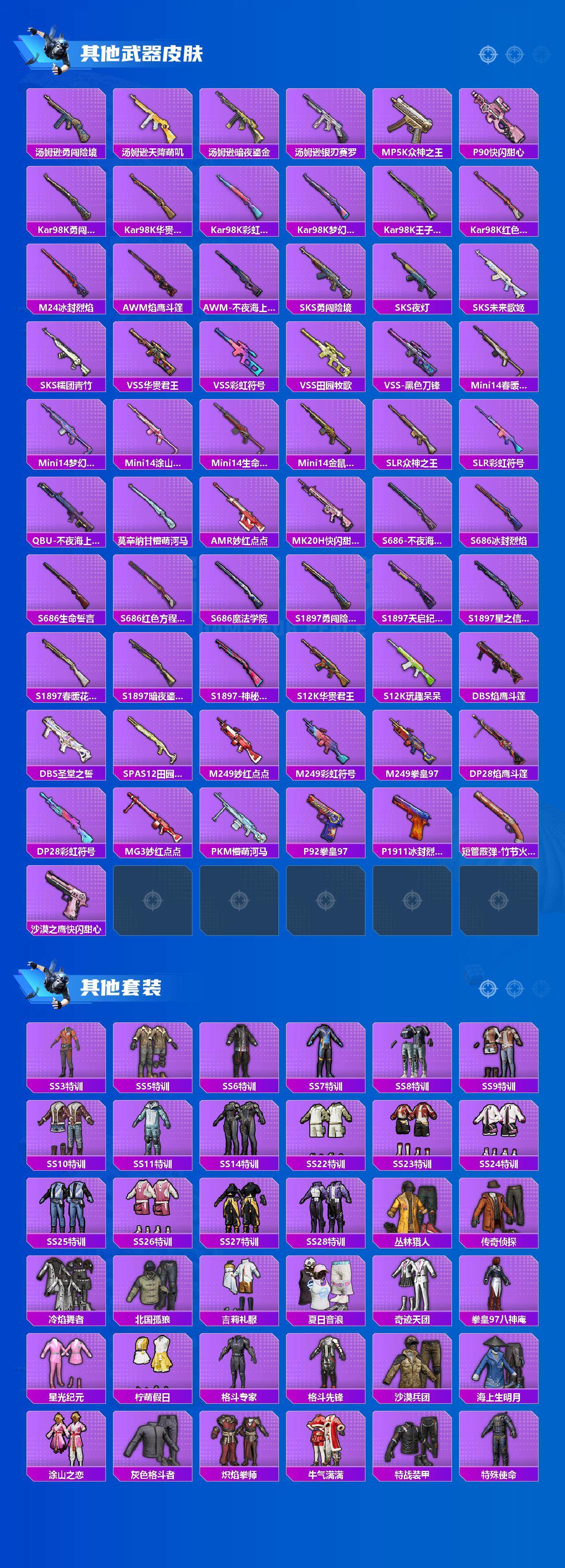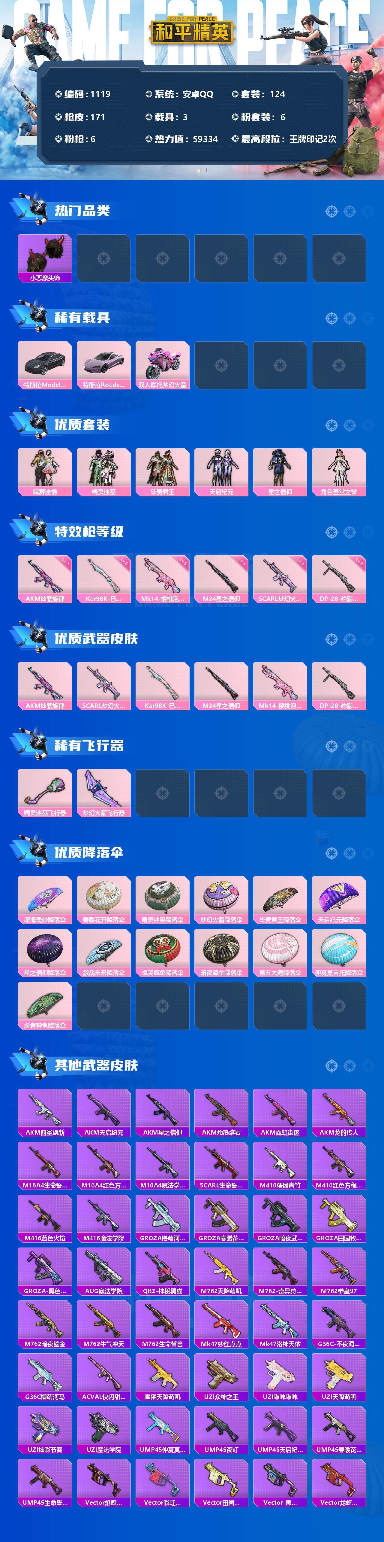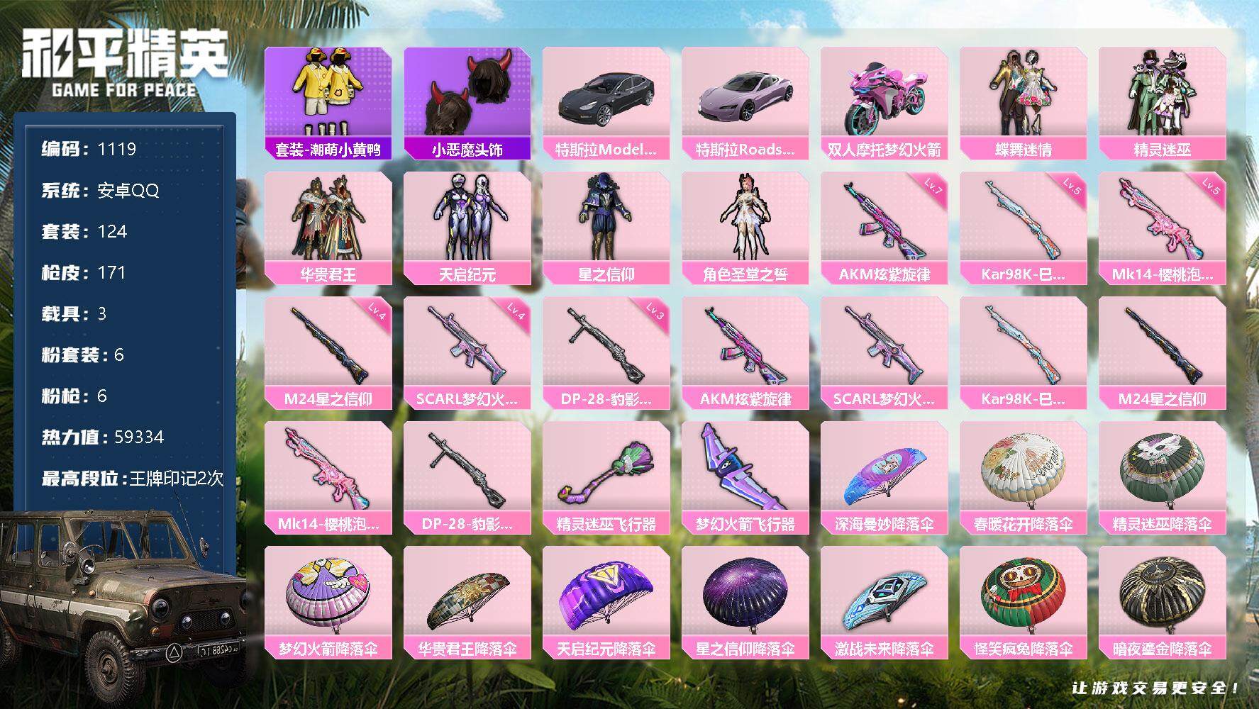 [12599297]安卓 手q-6粉装-6特效呛-3载具-2粉色飞行器-59334热力值-2王牌印记-124套装-171呛皮 【热门品类】:套装-潮萌小黄鸭,小恶魔头饰 【粉色载具】:特斯拉model 3(冷光银),特斯拉roadster(沁心粉),双人摩托-梦幻火箭 【粉色套装】:粉装-蝶舞迷情,粉装-精灵迷巫,粉装-华贵君王,粉装-天启纪元,粉装-星之信仰,角色-圣堂之誓 【粉色呛皮等级】:akm-炫紫旋律七级,scar-l-梦幻火箭四级,kar98k-巳巳如意五级,m24-星之信仰四级,mk14-樱桃泡泡五级,dp-28-豹影疾电三级 【粉色呛皮】:akm-炫紫旋律,scar-l-梦幻火箭,kar98k-巳巳如意,m24-星之信仰,mk14-樱桃泡泡,dp-28-豹影疾电 【粉色飞行器】:精灵迷巫飞行器,梦幻火箭飞行器 【粉色降落伞】:深海曼妙降落伞,春暖花开降落伞,精灵迷巫降落伞,梦幻火箭降落伞,华贵君王降落伞,天启纪元降落伞,星之信仰降落伞,激战未来降落伞,怪笑疯兔降落伞,暗夜鎏金降落伞,第五大道降落伞,仲夏莫吉托降落伞,忍者神龟降落伞 【稀有呛皮】:akm-四圣焕新,akm-天启纪元,akm-星之信仰,akm-灼热熔岩,akm-霓虹街区,akm-龙的传人,m16a4-生命誓言,m16a4-红色方程式,m16a4-魔法学院,scar-l-生命誓言,m416-糯团青竹,m416-红色方程式,m416-蓝色火焰,m416-魔法学院,groza-懵萌河马,groza-春暖花开,groza-暗夜武装,groza-田园牧歌,groza-黑色刀锋,aug-魔法学院,q-神秘黑猫,m762-天降萌叽,m762-奇异狩猎者,m762-拳皇97,m762-暗夜鎏金,m762-牛气冲天,m762-生命誓言,mk47-妙红点点,mk47-洛神天依,g36c-不夜海上花,g36c-懵萌河马,ac-val-快闪甜心,蜜獾-天降萌叽,uzi-众神之王,uzi-啾咪啾咪,uzi-天降萌叽,uzi-炫彩节奏,uzi-魔法学院,ump45-仲夏莫吉托,ump45-夜灯,ump45-天启纪元,ump45-春暖花开,ump45-生命誓言,vect-焰鹰斗篷,vect-彩虹符号,vect-田园牧歌,vect-黑色刀锋,vect-龙虾霸霸,汤姆逊-勇闯险境,汤姆逊-天