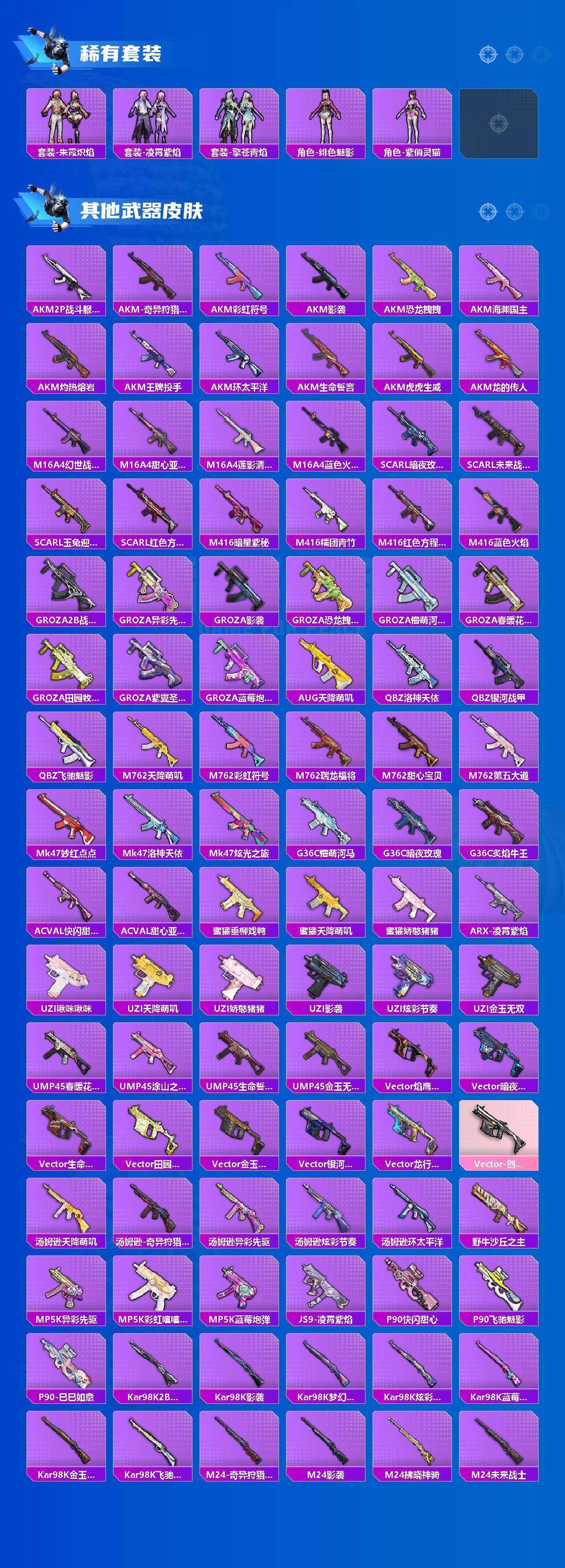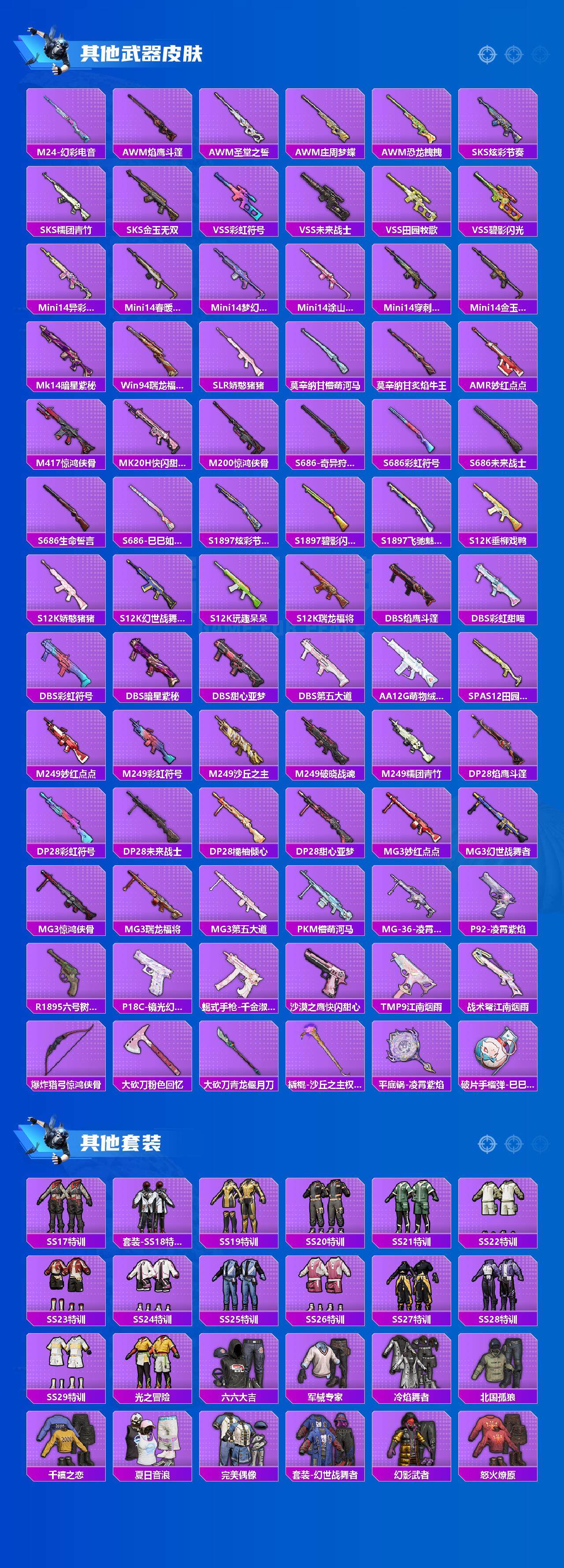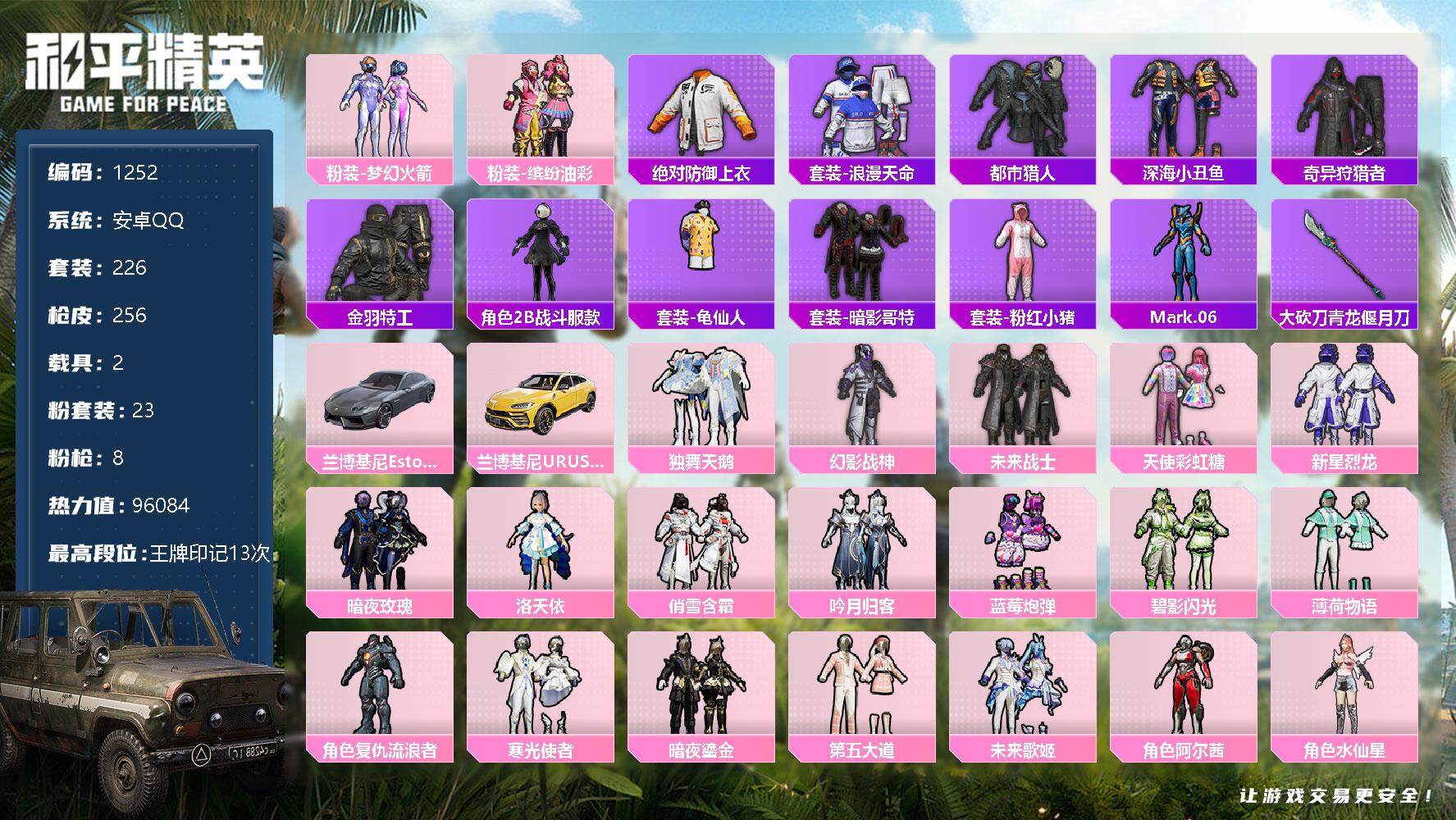 [12599565]安卓 手q-23粉装-8特效呛-2载具-4粉色飞行器-96084热力值-13王牌印记-226套装-256呛皮 【热门品类】:粉装-梦幻火箭,粉装-缤纷油彩,绝对防御上衣,套装-浪漫天命,套装-都市猎人,套装-深海小丑鱼,套装-奇异狩猎者,套装-金羽特工,角色-2b战斗服款,套装-龟仙人,套装-暗影哥特,套装-粉红小猪,角色-mark.06,大砍刀-青龙偃月刀 【粉色载具】:兰博基尼estoque(银翼灰),兰博基尼urus(明艳黄) 【粉色套装】:粉装-独舞天鹅,粉装-幻影战神,粉装-未来战士,粉装-天使彩虹糖,粉装-梦幻火箭,粉装-缤纷油彩,粉装-新星烈龙,粉装-暗夜玫瑰,角色-洛天依,粉装-俏雪含霜,粉装-吟月归客,粉装-蓝莓炮弹,粉装-碧影闪光,粉装-薄荷物语,角色-复仇流浪者,粉装-寒光使者,粉装-暗夜鎏金,粉装-第五大道,粉装-未来歌姬,角色-阿尔茜,角色-水仙星,粉装-金丰海韵,角色-异瞳寒姬 【粉色呛皮等级】:scar-l-青春物语五级,m416-五爪金龙七级,m416-风花雪月五级,ump45-恐龙拽拽七级,kar98k-巳巳如意五级,m24-暗星紫秘五级,slr-暗夜玫瑰五级,dp-28-豹影疾电五级 【粉色呛皮】:scar-l-青春物语,m416-五爪金龙,m416-风花雪月,ump45-恐龙拽拽,kar98k-巳巳如意,m24-暗星紫秘,slr-暗夜玫瑰,dp-28-豹影疾电 【粉色飞行器】:荧光虫舞飞行器,青春物语飞行器,全功率超战飞行器,沙丘之主天马 【粉色降落伞】:极限特训降落伞,百万伏特降落伞,未来战士降落伞,粉色回忆降落伞,春暖花开降落伞,梦幻火箭降落伞,暗夜玫瑰降落伞,洛神天依降落伞,风花雪月降落伞,蓝莓炮弹降落伞,暗星紫秘降落伞,碧影闪光降落伞,恐龙拽拽降落伞,筑梦精灵降落伞,炙焰牛王降落伞,圣光天使降落伞,环太平洋降落伞,垂柳戏鸭降落伞,彩虹甜喵降落伞,第五大道降落伞,沙丘之主降落伞,繁龙极客降落伞,精灵梦叶罗丽降落伞,守护天翼降落伞,忍者神龟降落伞,智耀战神降落伞,幻彩电音降落伞,异瞳寒姬降落伞 【稀有套装】:套装-龟仙人,套装-巳巳如意,套装-雏菊兔兔,套装-萝兰蝴蝶,套装-小熊娃娃,角色-蜜桃派对,角色-乐音,套装-朱霞炽焰,套装-凌霄紫焰,套装-擎苍青焰,角色-绯色魅影,角色-紫俏灵猫