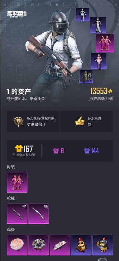 007m:m0943 【安卓q、不可二次】【1粉装,2粉呛,3粉色战备,20套装,时装104,60呛械,53装备,1滑翔尾翼,14降落伞】【无】热力值:13821,;等级:lv.20 历史最高段位:英勇黄金ⅰ 当前段位:英勇.黄金ⅱ; 【粉色套装】霓虹漫游; 【粉色呛械】kar98k-巳巳如意 [5级],dp-28-豹影疾电 [5级]; 【粉色降落伞】桃粉嫣然降落伞,精灵梦叶罗丽降落伞,墨龙九天降落伞; 【其他套装】黑色伏地魔,冰冻风暴,龙魂突击队,疯狂小兔子,战术大师,热情海星,纯真浪花,香榭午后,冰河战士,焰鹰斗篷,幻羽潜行,幽幻花璃,情公主,冰公主,海盐绵绵冰,蝶变,紫俏灵猫,海琴烟,元气之梦; 【其他呛械】m16a4-千金淑猫,m16a4-冰河战士,aug-紫晶流影,aug-耀粉歌者,m416-红色方程式,m416-蓝色火焰,groza-影袭,akm-江南烟雨,akm-霓彩脉冲,akm-涂鸦街区,m762-天降萌叽,q-纯真浪花,scar-l-炫彩节奏,scar-l-海盐豹豹,famas-霓彩脉冲,famas-镜域双华,蜜獾-精灵梦叶罗丽,awm-焰鹰斗篷,awm-纯真浪花,amr-鸡智如我,m200-乌木金纹,win94-乌木金纹,mk20-h-乌木金纹,mini14-香桃花海,mini14-耀粉歌者,mk14-薄荷星砂,mk14-冰河战士,vss-香桃花海,vss-星之彼岸,sks-冠军兔兔,mp5k-乌木金纹,uzi-冰河战士,uzi-影袭,ump45-生命誓言,汤姆逊-天降萌叽,汤姆逊-耀粉歌者,汤姆逊-纯真浪花,aks-74u-乌木金纹,vect-焰鹰斗篷,p90-巳巳如意,aa12-g-纯真浪花,aa12-g-星空武士,s1897-精灵梦叶罗丽,dbs-乌木金纹,dbs-荧海星豚,dbs-焰鹰斗篷,spas-12-乌木金纹,s686-生命誓言,s12k-霓彩脉冲,m249-破晓战魂,m249-绯穹魔姬,dp-28-焰鹰斗篷,mg3-幻世战舞者,平底锅-纯真浪花,平底锅-焰鹰斗篷,平底锅-精灵梦叶罗丽,大砍刀-鬼刀,破片手留单-拽到爆炸; 【其他滑翔尾翼】鸡智如我飞行器; 【其他降落伞】竞逐热浪降落伞,百战成名降落伞,海盐豹豹降落伞,焰鹰斗篷降落伞,冰河战士降落伞,干得pel亮降落伞,纯真浪花降落伞,都市猎人降落伞,钢铁雄心降落伞,香桃花海降落伞,普通降落伞; 【伙伴】伙伴-鸡哥,伙伴-盔仔,详情看图【实际信息请以最终验号结果为准】