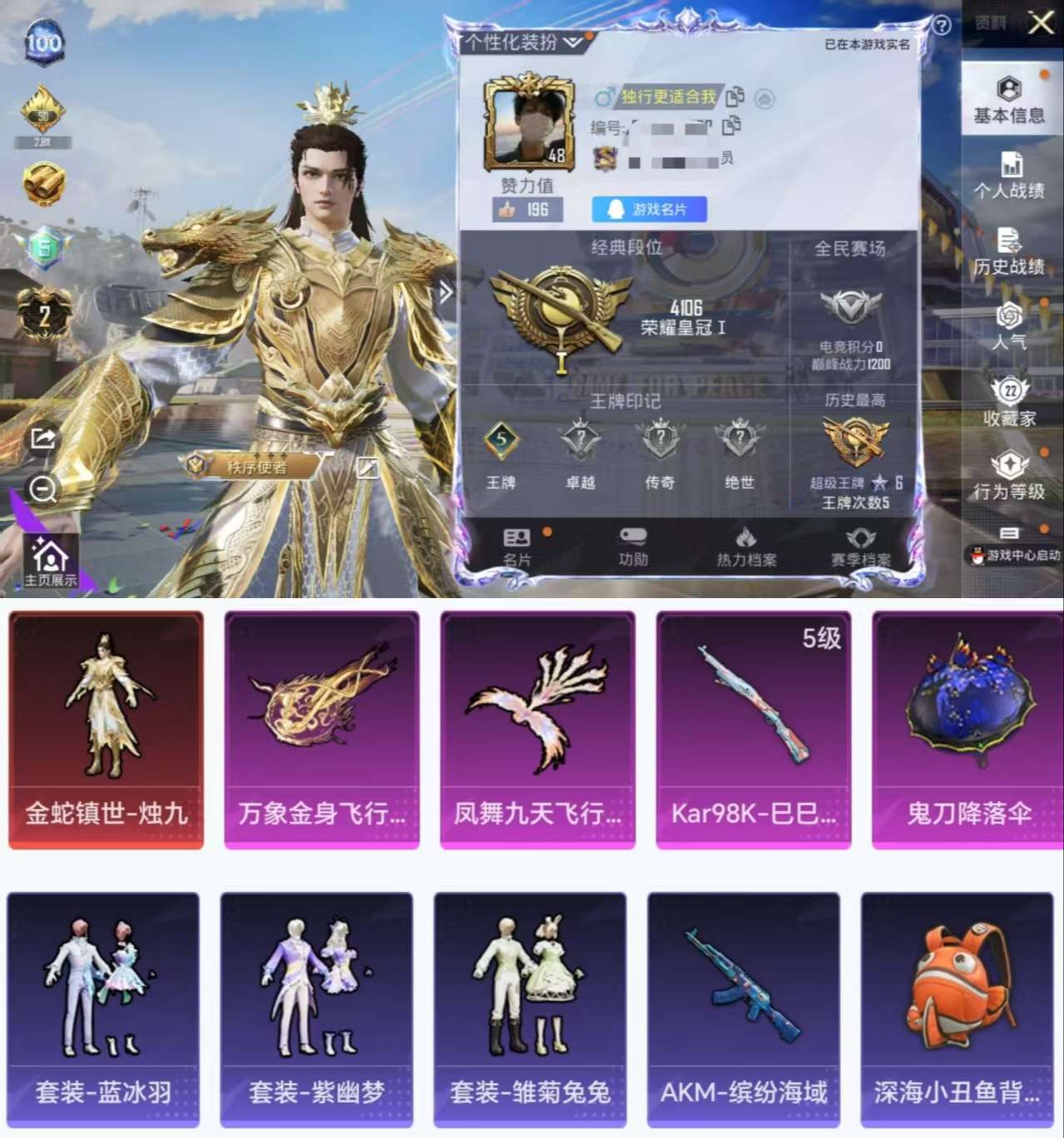 hx6164【2级神装烛九-2飞行器凤舞九天飞行器 万象金身飞行器-深海小丑鱼背包-身法素材号】qq等级25(1太阳)可二次苹果q-13875热力值 5王牌印记 历史超级王牌6星 20套装 43呛皮 【1神装】 金蛇镇世-烛九 【1稀有】 akm-缤纷海域 【1特效呛】 kar98k-巳巳如意 5级 【2飞行器】凤舞九天飞行器 万象金身飞行器【8热门】紫幽梦 蓝冰羽 雏菊兔兔 萝兰蝴蝶 鱼渊荷