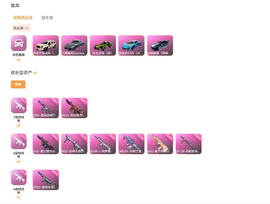 007f:x260苹果q可二次 热力值:62632,8粉装,9粉呛,5载具,15粉色战备,106套装,153呛械,208装备,8滑翔尾翼,51降落伞;等级:lv.67 历史最高段位:超级王牌20星 当前段位:卓越.王牌12星;王牌印记9次 卓越印记2次; 【热门套装】:套装-金羽特工,套装-奇异狩猎者,套装-暗影哥特,套装-龟仙人;【粉色套装】:粉装-梦幻火箭,粉装-新星烈龙,粉装-洛天依,粉装-星之彼岸,粉装-吟月归客,粉装-光明术士,粉装-黄族统领,粉装-幻彩电音;【粉色呛械】:akm-星际浪客[7级],groza-圣辉之星[5级],m762-激战未来[4级],m416-风花雪月[7级],aug-星之彼岸[5级],aug-暖羊咩咩[5级],scar-l-纯梦嫁纱[5级],mg3-洛神天依[5级],dp-28-豹影疾电[5级];【粉色载具】:冰辰御座(神秘蓝),兰博基尼estoque(银翼灰),迈凯伦570s(天际蓝),合金龙骨(绿),乔治巴顿战车(乳石白);【粉色滑翔尾翼】:黄族统领飞行器,星之彼岸飞行器,梦幻火箭飞行器,风花雪月飞行器,圣辉之星飞行器[1级];