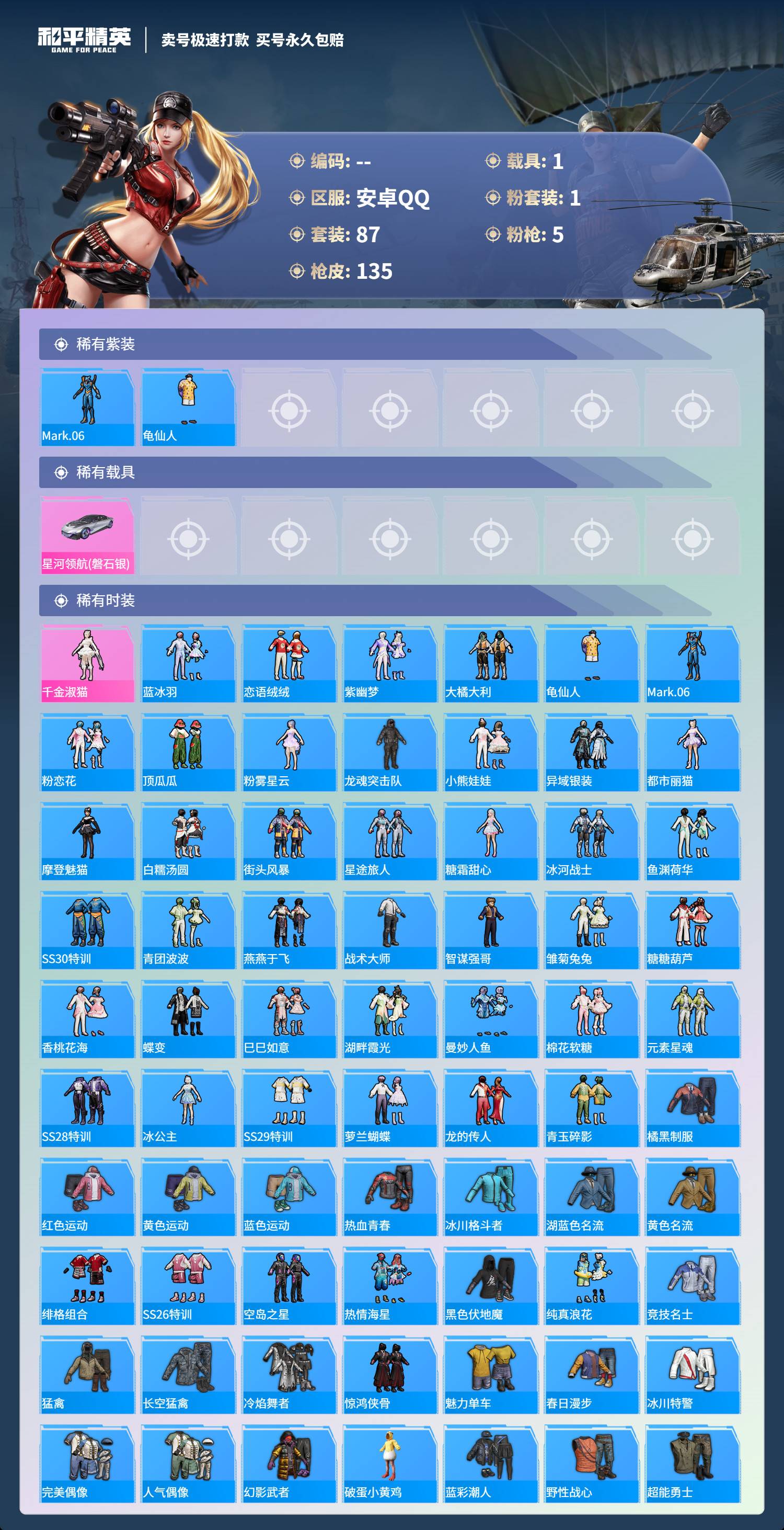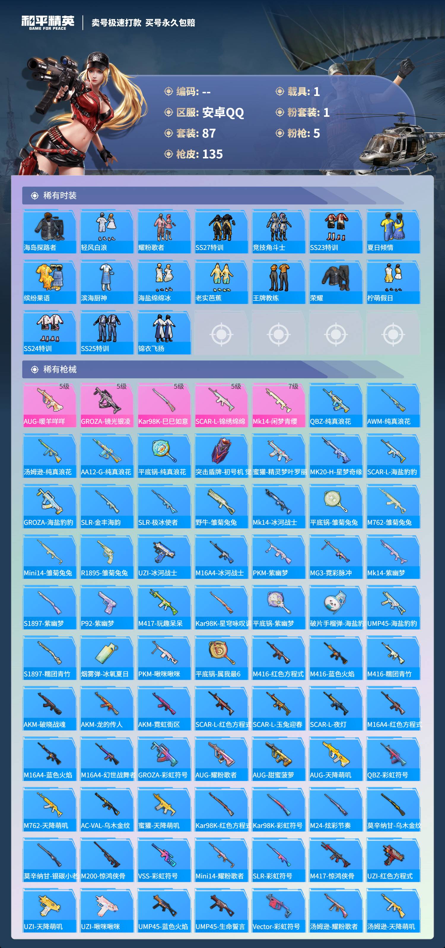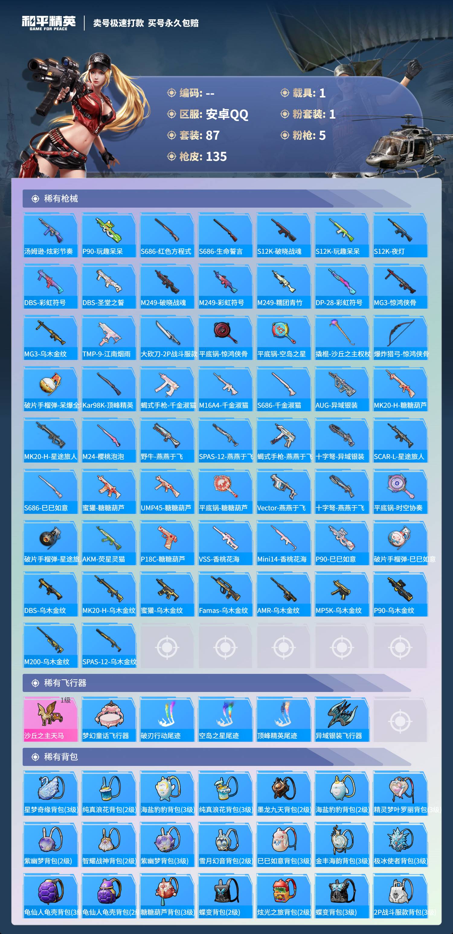 006fs:k1865安卓手q可二次-10王牌印记-1粉装-5特效呛-1载具-39437热力值-87套装-135呛皮-7卓越印记-4传奇印记 【1粉装】千金淑猫 【5特效呛】scar-l-锦绣绵绵-5级 groza-镜光银凌-5级 aug-暖羊咩咩-5级 kar98k-巳巳如意-5级 mk14-闲梦青缨-7级 【2稀有紫装】mark.06龟仙人 【1稀有载具】星河领航磐石银 【87稀有时装】蓝冰羽恋语绒绒紫幽梦大橘大利龟仙人mark.06粉恋花顶瓜瓜粉雾星云龙魂突击队小熊娃娃异域银装都市丽猫摩登魅猫白糯汤圆街头风暴星途旅人糖霜甜心冰河战士鱼渊荷华ss30特训青团波波燕燕于飞战术大师智谋强哥雏菊兔兔糖糖葫芦香桃花海蝶变巳巳如意湖畔霞光曼妙人鱼棉花软糖元素星魂ss28特训冰公主ss29特训萝兰蝴蝶龙的传人青玉碎影橘黑制服红色运动黄色运动蓝色运动热血青春冰川格斗者湖蓝色名流黄色名流绯格组合ss26特训空岛之星热情海星黑色伏地魔纯真浪花竞技名士猛禽长空猛禽冷焰舞者惊鸿侠骨魅力单车春日漫步冰川特警完美偶像人气偶像幻影武者破蛋小黄鸡蓝彩潮人野性战心超能勇士海岛探路者轻风白浪耀粉歌者ss27特训竞技角斗士ss23特训夏日倾情缤纷果语滨海厨神海盐绵绵冰老实芭蕉王牌教练荣耀柠萌假日ss24特训ss25特训锦衣飞扬 【135稀有呛械】q-纯真浪花awm-纯真浪花汤姆逊-纯真浪花dbs-乌木金纹aa12-g-纯真浪花平底锅-纯真浪花突击盾牌-初号机 觉醒ver.蜜獾-精灵梦叶罗丽mk20-h-星梦奇缘scar-l-海盐豹豹groza-海盐豹豹aug-暖羊咩咩/5级groza-镜光银凌/5级kar98k-巳巳如意/5级slr-金丰海韵slr-极冰使者野牛-雏菊兔兔mk14-冰河战士平底锅-雏菊兔兔m762-雏菊兔兔mini14-雏菊兔兔r1895-雏菊兔兔uzi-冰河战士m16a4-冰河战士mk20-h-乌木金纹scar-l-锦绣绵绵/5级mk14-闲梦青缨/7级pkm-紫幽梦mg3-霓彩脉冲mk14-紫幽梦蜜獾-乌木金纹s1897-紫幽梦p92-紫幽梦m417-玩趣呆呆kar98k-星穹咏叹调平底锅-紫幽梦破片手留单-海盐豹豹ump45-海盐豹豹famas-乌木金纹s1897-糯团青竹盐雾蛋-冰氧夏日pkm-啾咪啾咪平底锅-属我最6m416-红色方程式m416-蓝色火焰m416-糯团青竹akm-破晓战魂akm-龙的传人akm-霓虹街区scar-l-红色方程式scar-l-玉兔迎春scar-l-夜灯m16a4-红色方程式m16a4-蓝色火焰m16a4-幻世战舞者groza-彩虹符号aug-耀粉歌者aug-甜蜜菠萝aug-天降萌叽q-彩虹符号m762-天降萌叽ac-val-乌木金纹蜜獾-天降萌叽kar98k-红色方程式kar98k-彩虹符号m24-炫彩节奏莫辛纳甘-乌木金纹莫辛纳甘-银碳小老虎amr-乌木金纹m200-惊鸿侠骨vss-彩虹符号mini14-耀粉歌者slr-彩虹符号m417-惊鸿侠骨uzi-红色方程式uzi-天降萌叽uzi-啾咪啾咪ump45-蓝色火焰ump45-生命誓言vect-彩虹符号汤姆逊-耀粉歌者汤姆逊-天降萌叽汤姆逊-炫彩节奏mp5k-乌木金纹p90-乌木金纹p90-玩趣呆呆s686-红色方程式s686-生命誓言s12k-破晓战魂s12k-玩趣呆呆s12k-夜灯dbs-彩虹符号dbs-圣堂之誓m249-破晓战魂m249-彩虹符号m249-糯团青竹dp-28-彩虹符号mg3-惊鸿侠骨mg3-乌木金纹tmp-9-江南烟雨大砍刀-2p战斗服款平底锅-惊鸿侠骨平底锅-空岛之星撬棍-沙丘之主权杖爆炸猎弓-惊鸿侠骨破片手留单-呆爆全场kar98k-顶峰精英蝎式手呛-千金淑猫m16a4-千金淑猫s686-千金淑猫aug-异域银装mk20-h-糖糖葫芦mk20-h-星途旅人m24-樱桃泡泡野牛-燕燕于飞m200-乌木金纹spas-12-燕燕于飞蝎式手呛-燕燕于飞十子怒-异域银装scar-l-星途旅人s686-巳巳如意蜜獾-糖糖葫芦ump45-糖糖葫芦spas-12-乌木金纹平底锅-糖糖葫芦vect-燕燕于飞十子怒-燕燕于飞平底锅-时空协奏破片手留单-星途旅人akm-荧星灵猫p18c-糖糖葫芦vss-香桃花海mini14-香桃花海p90-巳巳如意破片手留单-巳巳如意 【6稀有飞行器】沙丘之主天马/1级梦幻童话飞行器破刃行动尾迹空岛之星尾迹顶峰精英尾迹异域银装飞行器 【49稀有背包】星梦奇缘背包3级纯真浪花背包2级海盐豹豹背包3级纯真浪花背包3级墨龙九天背包2级海盐豹豹背包2级精灵梦叶罗丽背包3级紫幽梦背包2级智耀战神背包2级紫幽梦背包3级雪月幻音背包2级巳巳如意背包3级金丰海韵背包3级极冰使者背包3级龟仙人龟壳背包3级龟仙人龟壳背包2级糖糖葫芦背包3级蝶变背包2级炫光之旅背包2级蝶变背包3级2p战斗服款背包3级千金淑猫背包2级2p战斗服款背包2级千金淑猫背包3级异域银装背包2级巳巳如意背包2级霓虹街区背包3级异域银装背包3级龙的传人背包3级甜蜜菠萝背包3级燕燕于飞背包3级燕燕于飞背包2级龙的传人背包2级临安公主背包3级智谋强哥背包2级雏菊兔兔背包3级雏菊兔兔背包2级智谋强哥背包3级糖糖葫芦背包2级甜蜜菠萝背包2级香桃花海背包2级2b战斗服款背包2级香桃花海背包3级极冰使者背包2级音爆索尼克背包2级玉兔迎春背包3级冰河战士背包3级冰河战士背包2级金丰海韵背包2级