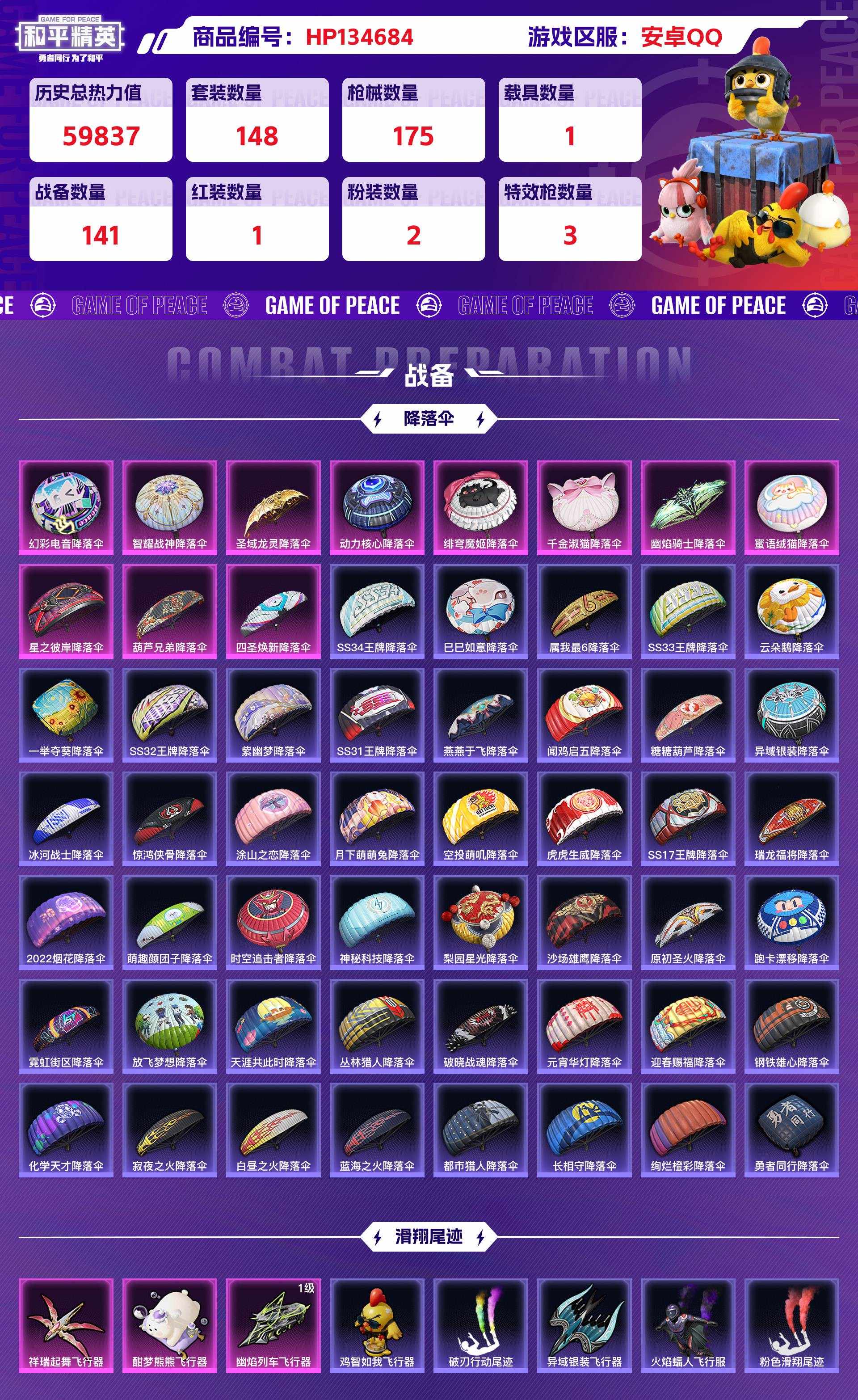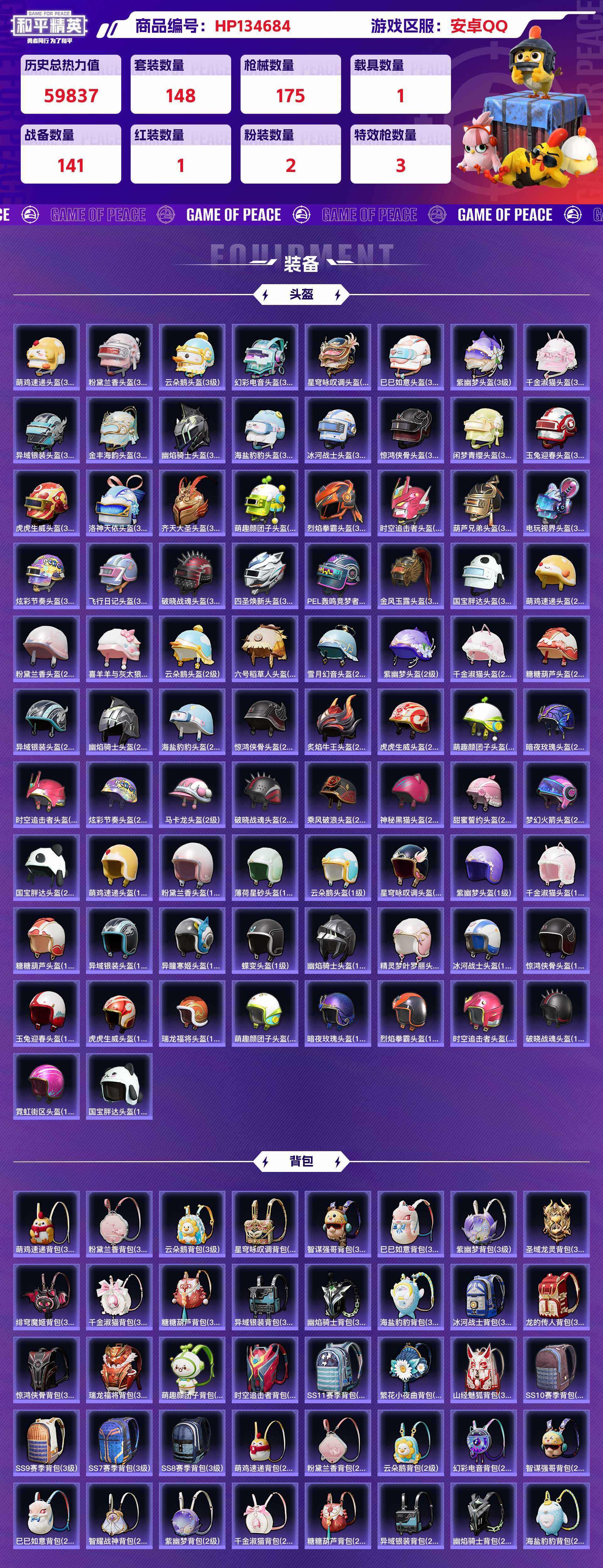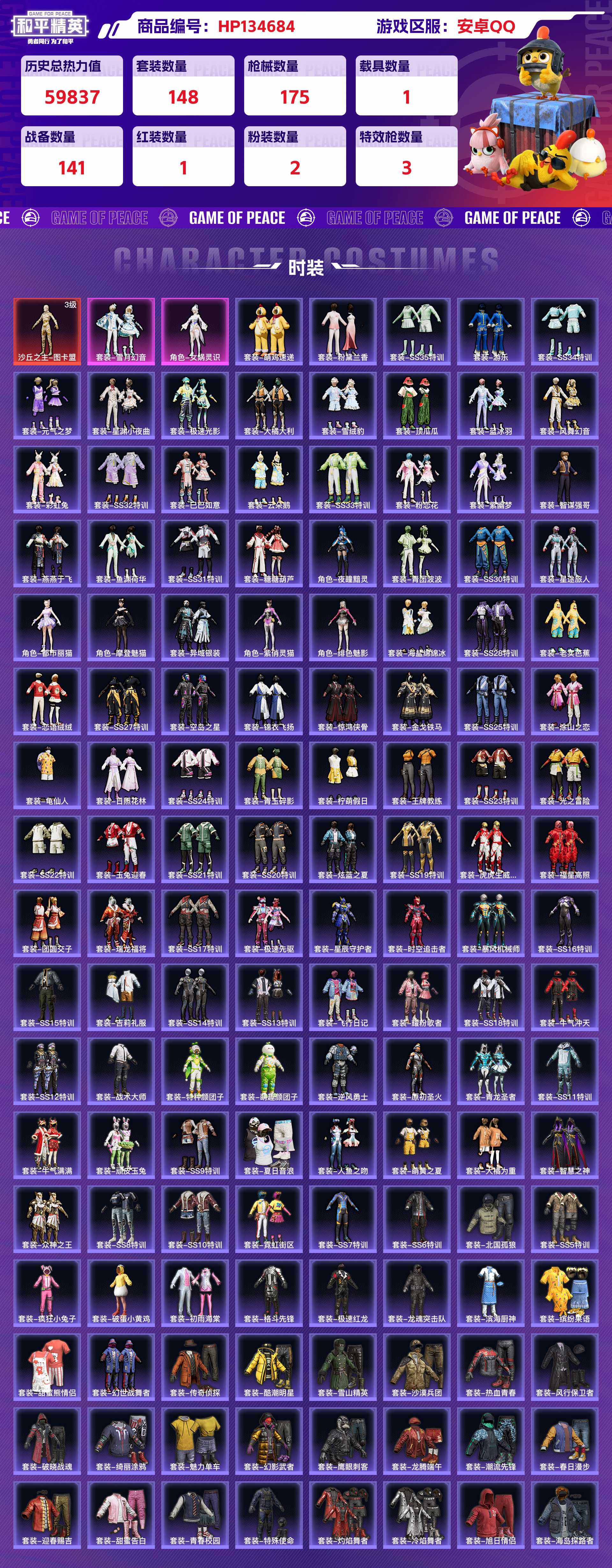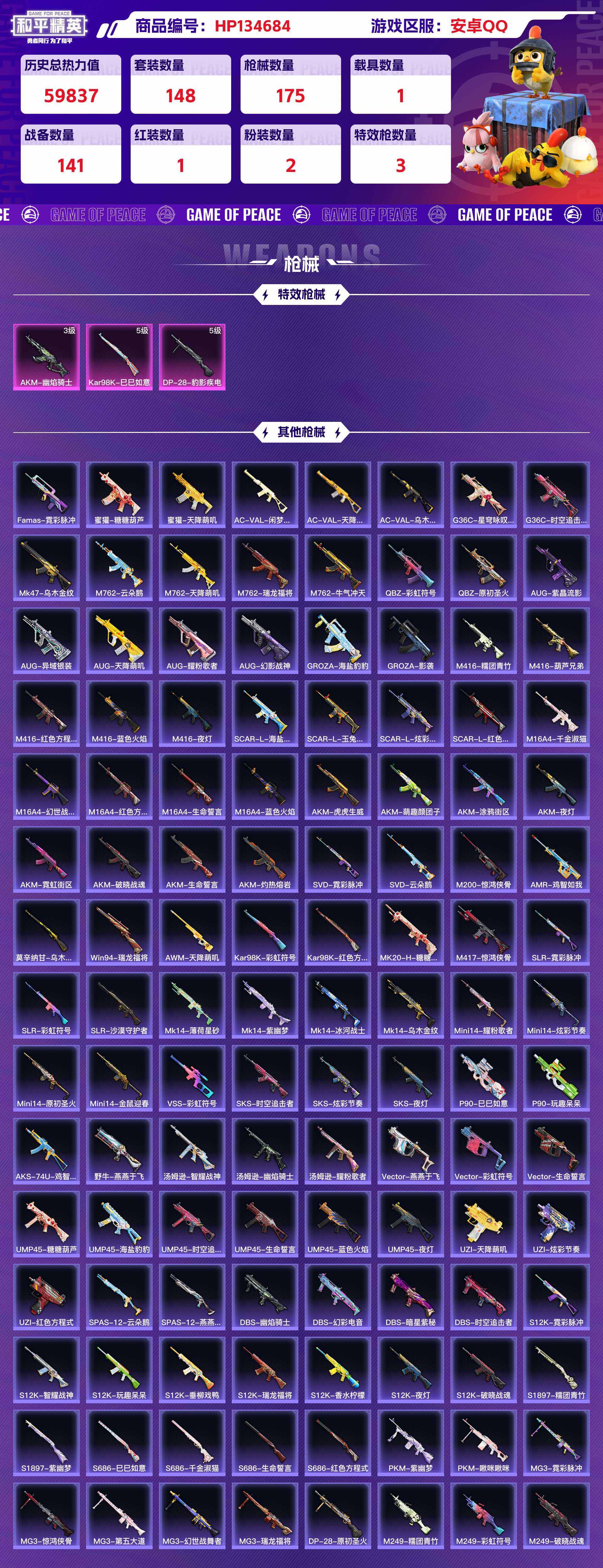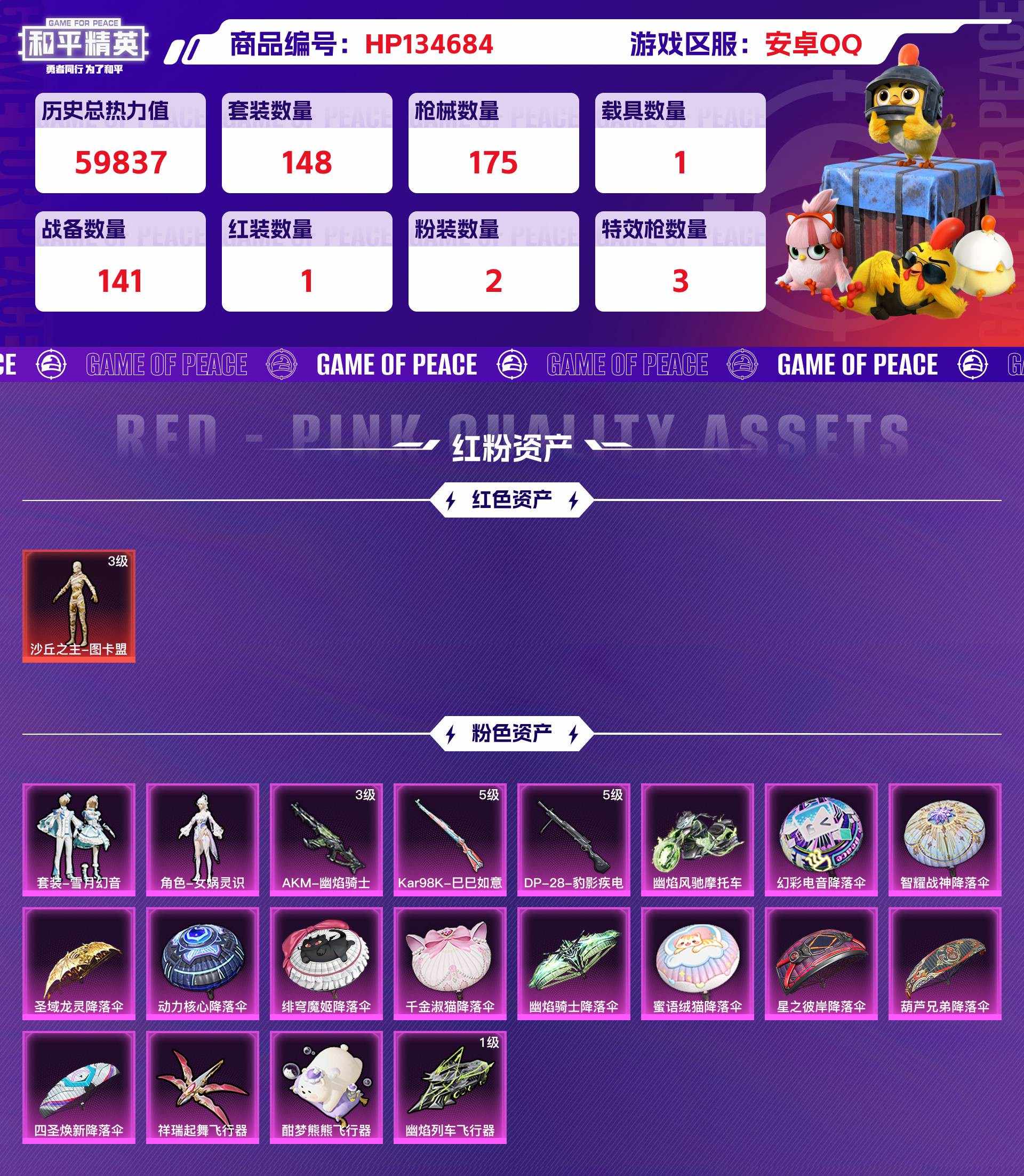 hp134684|精品号安卓qq红装1(沙丘之主-图卡盟)粉装2(女娲灵识 雪月幻音)粉呛3(akm-幽焰骑士 kar98k-巳巳如意 等)载具1(幽焰风驰摩托车)