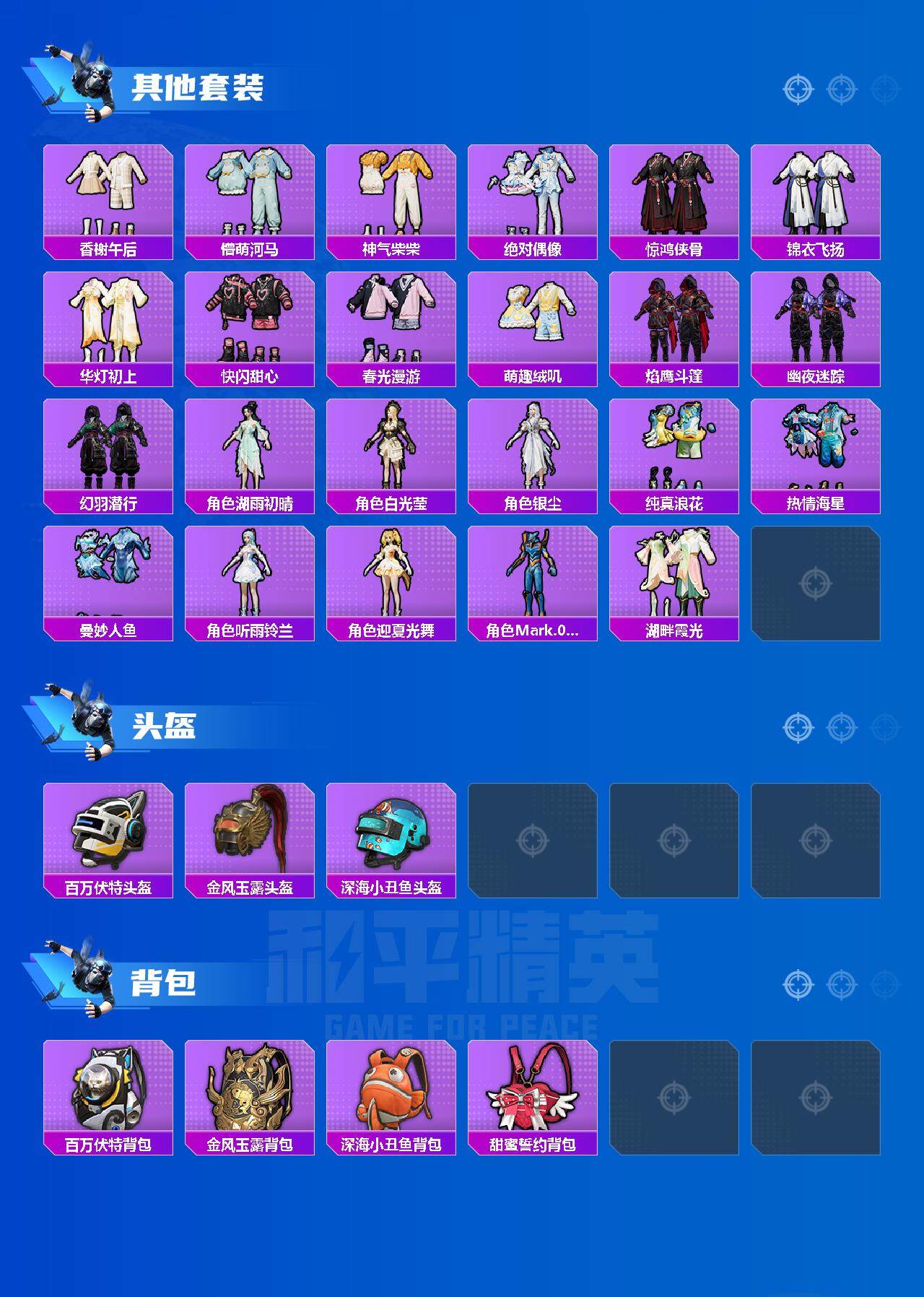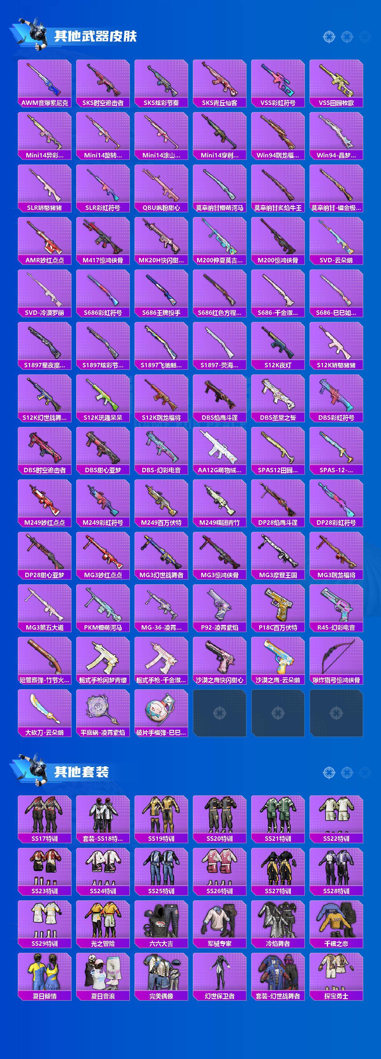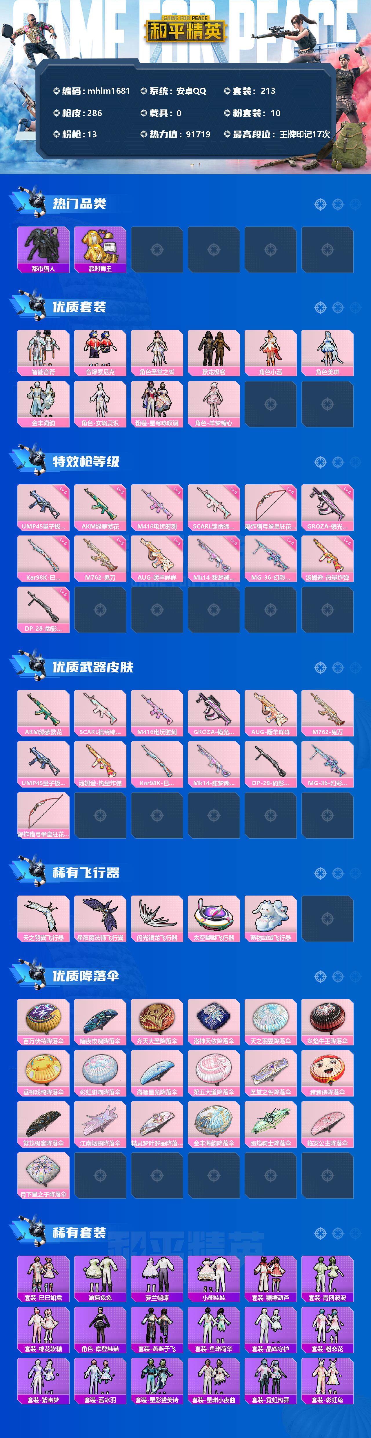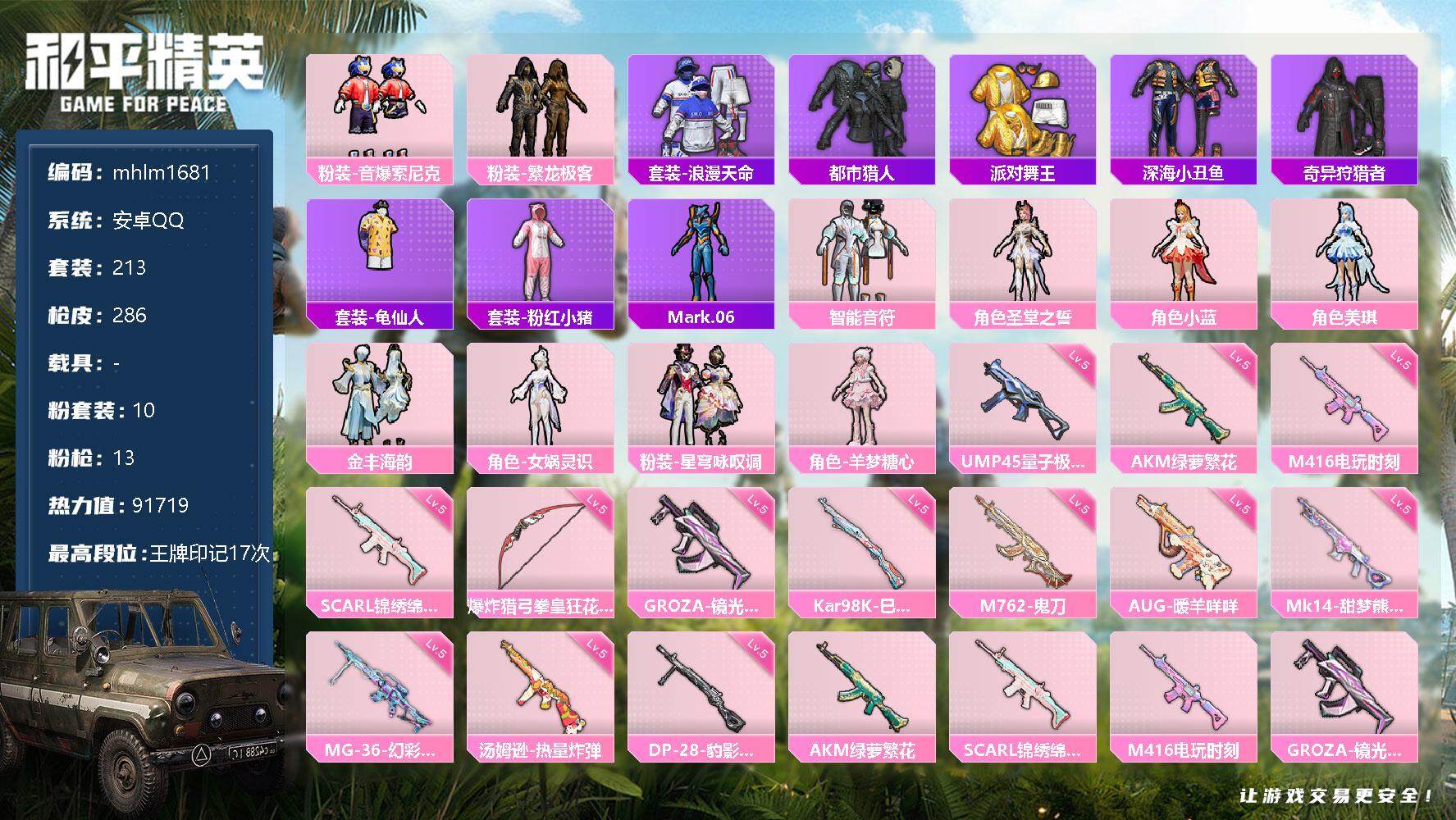 [13097908]安卓 手q-10粉装-13特效呛-0载具-7粉色飞行器-91719热力值-17王牌印记-213套装-286呛皮 【热门品类】:粉装-音爆索尼克,粉装-繁龙极客,套装-浪漫天命,套装-都市猎人,套装-派对舞王,套装-深海小丑鱼,套装-奇异狩猎者,套装-龟仙人,套装-粉红小猪,角色-mark.06 【粉色套装】:粉装-智能音符,粉装-音爆索尼克,角色-圣堂之誓,粉装-繁龙极客,角色-小蓝,角色-美琪,粉装-金丰海韵,角色-女娲灵识,粉装-星穹咏叹调,角色-羊梦糖心 【粉色呛皮等级】:akm-绿萝繁花五级,scar-l-锦绣绵绵五级,m416-电玩时刻五级,groza-镜光银凌五级,aug-暖羊咩咩五级,m762-鬼刀五级,ump45-量子极限五级,汤姆逊-热量炸弹五级,kar98k-巳巳如意五级,mk14-甜梦熊击五级,dp-28-豹影疾电五级,mg-36-幻彩电音五级,爆炸猎弓-拳皇·狂花道五级 【粉色呛皮】:akm-绿萝繁花,scar-l-锦绣绵绵,m416-电玩时刻,groza-镜光银凌,aug-暖羊咩咩,m762-鬼刀,ump45-量子极限,汤姆逊-热量炸弹,kar98k-巳巳如意,mk14-甜梦熊击,dp-28-豹影疾电,mg-36-幻彩电音,爆炸猎弓-拳皇·狂花道 【粉色飞行器】:天之羽翼飞行器,星夜魔法师飞行翼,闪光银龙飞行器,太空嘟嘟飞行器,萌物绒绒飞行器 【粉色降落伞】:百万伏特降落伞,暗夜玫瑰降落伞,齐天大圣降落伞,洛神天依降落伞,天之羽翼降落伞,炙焰牛王降落伞,垂柳戏鸭降落伞,彩虹甜喵降落伞,海螺星光降落伞,第五大道降落伞,圣堂之誓降落伞,猪猪侠降落伞,繁龙极客降落伞,江南烟雨降落伞,精灵梦叶罗丽降落伞,金丰海韵降落伞,幽焰骑士降落伞,临安公主降落伞,月下星之子降落伞 【稀有套装】:套装-龟仙人,套装-巳巳如意,套装-雏菊兔兔,套装-萝兰蝴蝶,套装-小熊娃娃,套装-糖糖葫芦,套装-青团波波,套装-棉花软糖,角色-摩登魅猫,套装-燕燕于飞,套装-鱼渊荷华,套装-晶辉守护,套装-粉恋花,套装-紫幽梦,套装-蓝冰羽,套装-星影赞美诗,套装-星渊小夜曲,套装-霓虹热舞,套装-彩虹兔,套装-云朵鹅,套装-雪绒豹,角色-乐音,角色-夜瞳黯灵,套装-朱霞炽焰,套装-凌霄紫焰,套装-擎苍青焰 【稀有呛皮】:ak