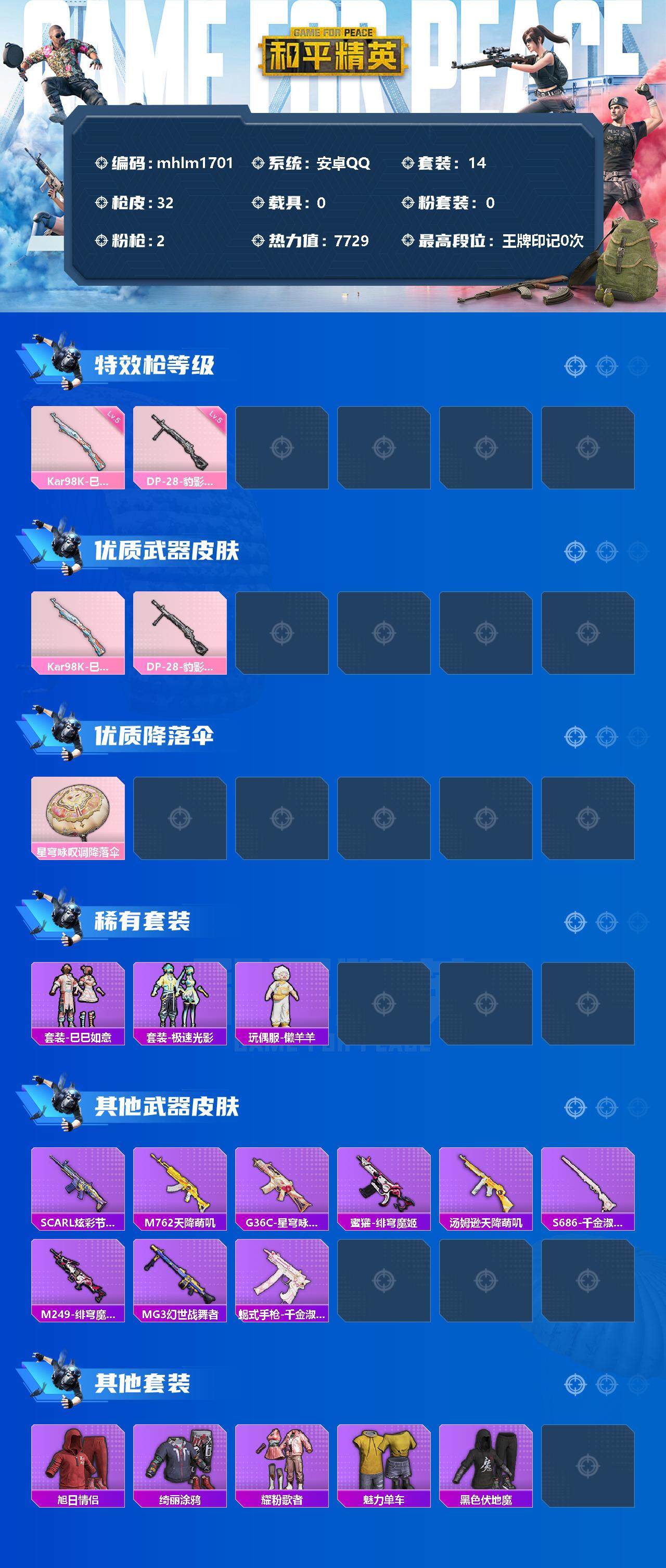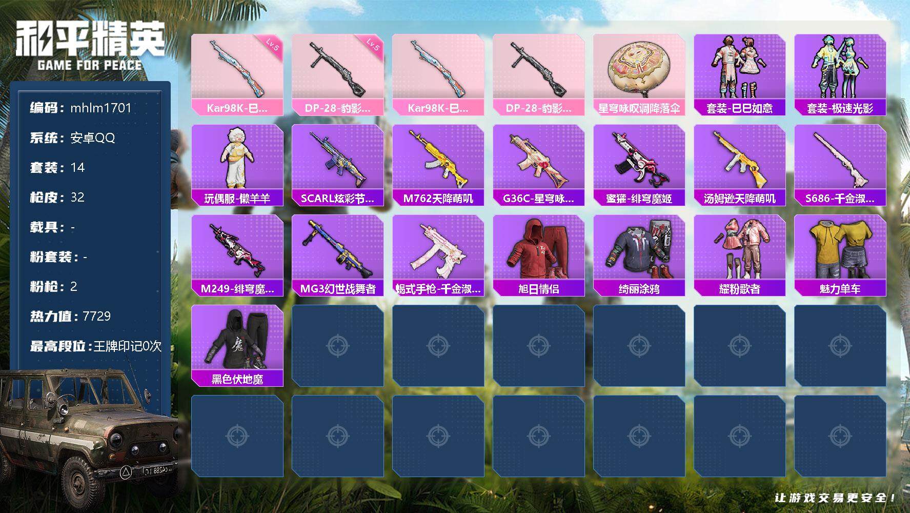 [13099796]安卓 手q-0粉装-2特效呛-0载具-0粉色飞行器-7729热力值-0王牌印记-14套装-32呛皮 【粉色呛皮等级】:kar98k-巳巳如意五级,dp-28-豹影疾电五级 【粉色呛皮】:kar98k-巳巳如意,dp-28-豹影疾电 【粉色降落伞】:星穹咏叹调降落伞 【稀有套装】:套装-巳巳如意,套装-极速光影,玩偶服-懒羊羊 【稀有呛皮】:scar-l-炫彩节奏,m762-天降萌叽,g36c-星穹咏叹调,蜜獾-绯穹魔姬,汤姆逊-天降萌叽,s686-千金淑猫,m249-绯穹魔姬,mg3-幻世战舞者,蝎式手呛-千金淑猫 【其他套装】:套装-旭日情侣,套装-绮丽涂鸦,套装-耀粉歌者,套装-魅力单车,套装-黑色伏地魔 【营地id】:951001690