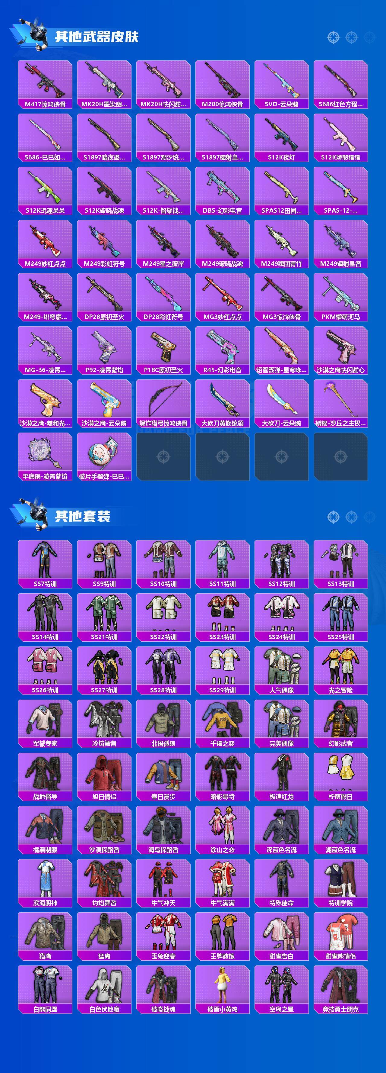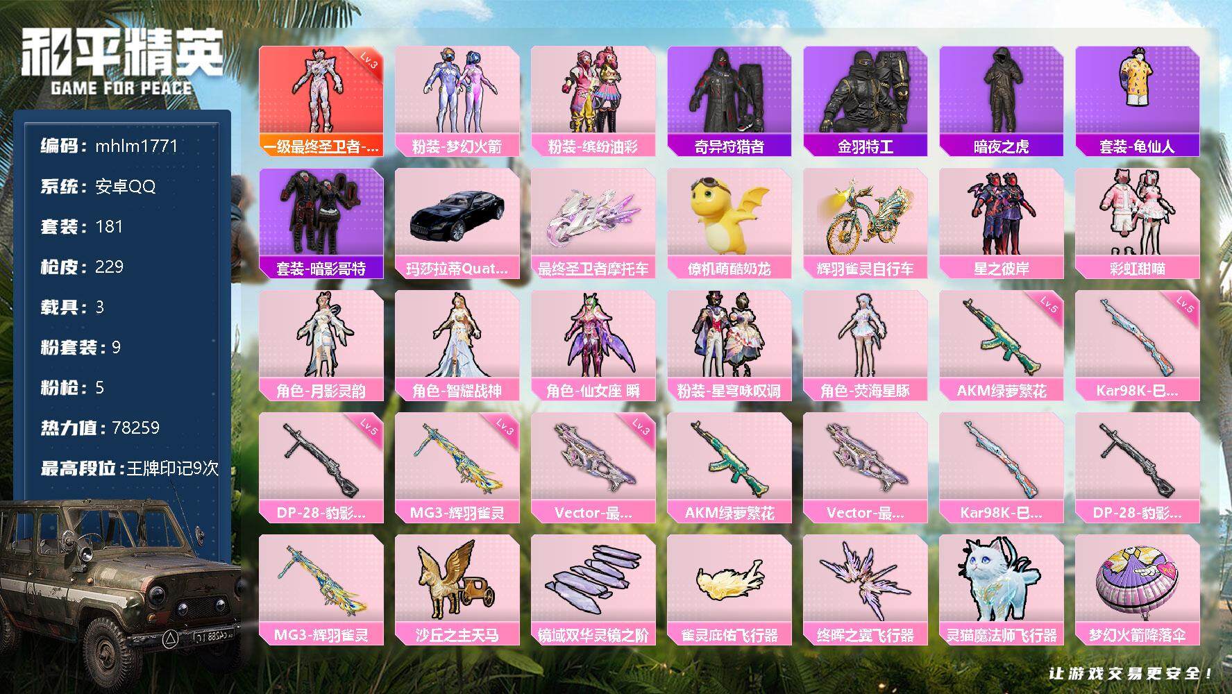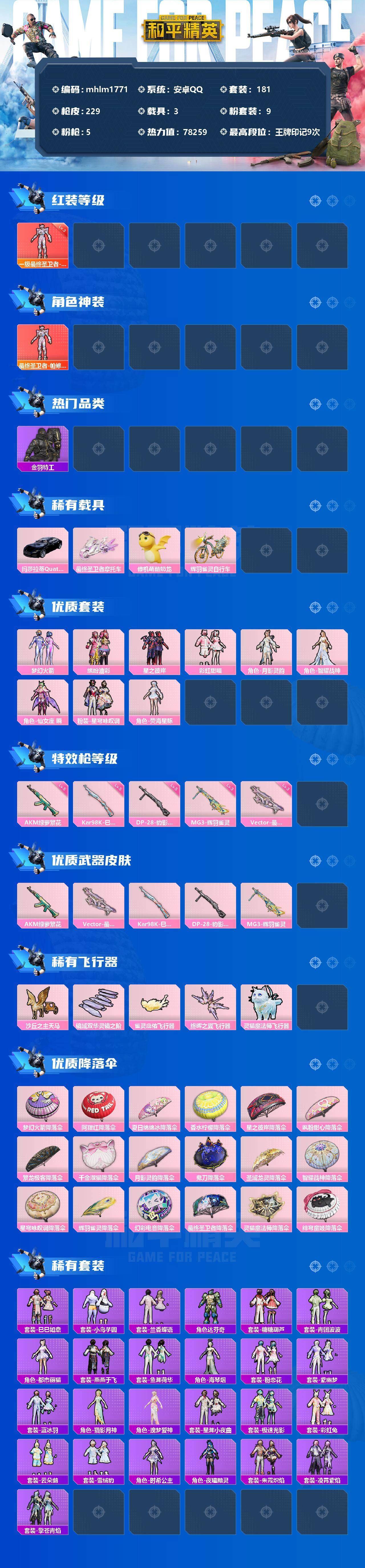 [13192941]安卓 手q-1神装-9粉装-5特效呛-3载具-5粉色飞行器-78259热力值-9王牌印记-181套装-229呛皮 【红色神装等级】:最终圣卫者-帕修斯三级 【红色角色神装】:最终圣卫者-帕修斯 【热门品类】:粉装-梦幻火箭,粉装-缤纷油彩,套装-奇异狩猎者,套装-金羽特工,套装-暗夜之虎,套装-龟仙人,套装-暗影哥特 【粉色载具】:玛莎拉蒂quattropte(夜幕蓝),最终圣卫者摩托车,僚机-萌酷奶龙,辉羽雀灵自行车 【粉色套装】:粉装-梦幻火箭,粉装-缤纷油彩,粉装-星之彼岸,粉装-彩虹甜喵,角色-月影灵韵,角色-智耀战神,角色-仙女座 瞬,粉装-星穹咏叹调,角色-荧海星豚 【粉色呛皮等级】:akm-绿萝繁花五级,vect-最终圣卫者三级,kar98k-巳巳如意五级,dp-28-豹影疾电五级,mg3-辉羽雀灵三级 【粉色呛皮】:akm-绿萝繁花,vect-最终圣卫者,kar98k-巳巳如意,dp-28-豹影疾电,mg3-辉羽雀灵 【粉色飞行器】:沙丘之主天马,镜域双华-灵镜之阶,雀灵庇佑飞行器,终晖之翼飞行器,灵猫魔法师飞行器 【粉色降落伞】:梦幻火箭降落伞,阿狸红降落伞,夏日绵绵冰降落伞,香水柠檬降落伞,星之彼岸降落伞,飒粉甜心降落伞,繁龙极客降落伞,千金淑猫降落伞,月影灵韵降落伞,鬼刀降落伞,圣域龙灵降落伞,智耀战神降落伞,星穹咏叹调降落伞,辉羽雀灵降落伞,幻彩电音降落伞,最终圣卫者降落伞,灵猫魔法师降落伞,绯穹魔姬降落伞 【稀有套装】:套装-龟仙人,套装-巳巳如意,套装-小鸟芋圆,套装-兰香蝶语,角色-达芬奇,套装-糖糖葫芦,套装-青团波波,角色-都市丽猫,套装-燕燕于飞,套装-鱼渊荷华,角色-海琴烟,套装-粉恋花,套装-紫幽梦,套装-蓝冰羽,角色-猎影月神,角色-瑰梦爱神,套装-星渊小夜曲,套装-极速光影,套装-彩虹兔,套装-云朵鹅,套装-雪绒豹,角色-时希公主,角色-夜瞳黯灵,套装-朱霞炽焰,套装-凌霄紫焰,套装-擎苍青焰 【稀有呛皮】:akm-夜灯,akm-星之彼岸,akm-灼热熔岩,akm-破晓战魂,akm-缤纷海域,akm-霓虹街区,akm-龙的传人,m16a4-红色方程式,m16a4-蓝色火焰,m16a4-最终圣卫者,scar-l-夜灯,scar-l-炫彩节奏,scar-l-玉兔迎春,scar-l-红色方程