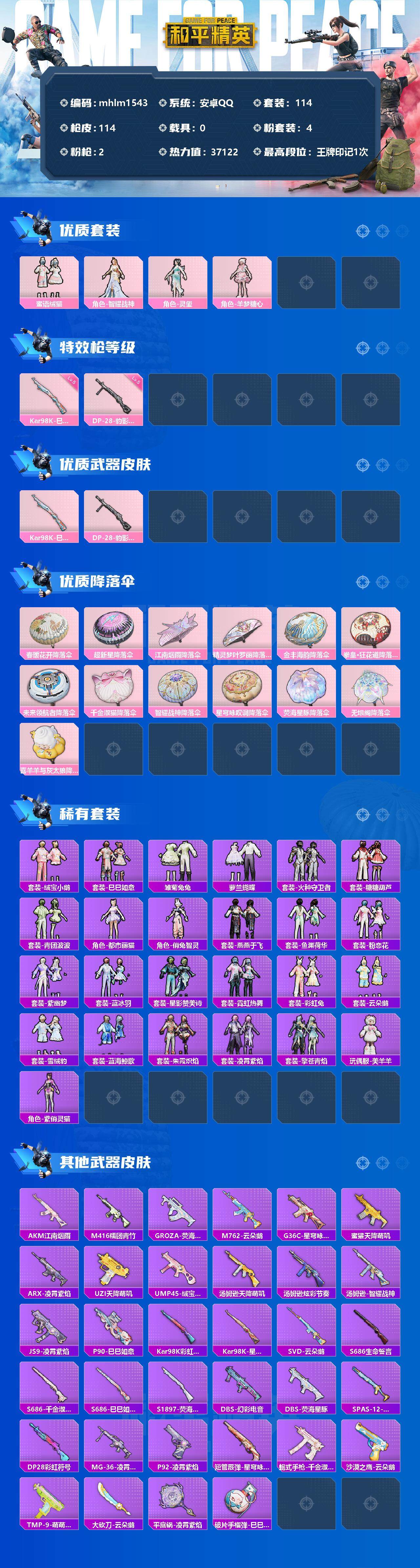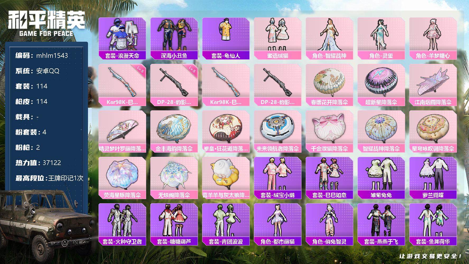[12932798]安卓 手q-4粉装-2特效呛-0载具-0粉色飞行器-37122热力值-1王牌印记-114套装-114呛皮 【热门品类】:套装-浪漫天命,套装-深海小丑鱼,套装-龟仙人 【粉色套装】:粉装-蜜语绒猫,角色-智耀战神,角色-灵玺,角色-羊梦糖心 【粉色呛皮等级】:kar98k-巳巳如意五级,dp-28-豹影疾电五级 【粉色呛皮】:kar98k-巳巳如意,dp-28-豹影疾电 【粉色降落伞】:春暖花开降落伞,超新星降落伞,江南烟雨降落伞,精灵梦叶罗丽降落伞,金丰海韵降落伞,拳皇·狂花道降落伞,未来领航者降落伞,千金淑猫降落伞,智耀战神降落伞,星穹咏叹调降落伞,荧海星豚降落伞,无垠阁降落伞,喜羊羊与灰太狼降落伞 【稀有套装】:套装-龟仙人,套装-绒宝小鹅,套装-巳巳如意,套装-雏菊兔兔,套装-萝兰蝴蝶,套装-火种守卫者,套装-糖糖葫芦,套装-青团波波,角色-都市丽猫,角色-俏兔智灵,套装-燕燕于飞,套装-鱼渊荷华,套装-粉恋花,套装-紫幽梦,套装-蓝冰羽,套装-星影赞美诗,套装-霓虹热舞,套装-彩虹兔,套装-云朵鹅,套装-雪绒豹,套装-蓝海鲸歌,套装-朱霞炽焰,套装-凌霄紫焰,套装-擎苍青焰,玩偶服-美羊羊,角色-紫俏灵猫 【稀有呛皮】:akm-江南烟雨,m416-糯团青竹,groza-荧海星豚,m762-云朵鹅,g36c-星穹咏叹调,蜜獾-天降萌叽,arx-凌霄紫焰,uzi-天降萌叽,ump45-绒宝小鹅,汤姆逊-天降萌叽,汤姆逊-炫彩节奏,汤姆逊-智耀战神,js9-凌霄紫焰,p90-巳巳如意,kar98k-彩虹符号,kar98k-星穹咏叹调,svd-云朵鹅,s686-生命誓言,s686-巳巳如意,s686-千金淑猫,s1897-荧海星豚,dbs-荧海星豚,dbs-幻彩电音,spas-12-云朵鹅,dp-28-彩虹符号,mg-36-凌霄紫焰,p92-凌霄紫焰,短管霰弹-星穹咏叹调,蝎式手呛-千金淑猫,沙墨之鹦-云朵鹅,tmp-9-萌萌史莱姆,大砍刀-云朵鹅,平底锅-凌霄紫焰,破片手留单-巳巳如意 【其他套装】:套装-ss27特训,套装-ss28特训,套装-ss29特训,套装-人气偶像,套装-甜酷狙击,套装-光之冒险,套装-冷焰舞者,套装-吉莉礼服,套装-夏日倾情,套装-完美偶像,套装-幻影武者,套装-战地督导,套装-旭日情侣,套装-春日漫步,套装-极速红龙,套装
