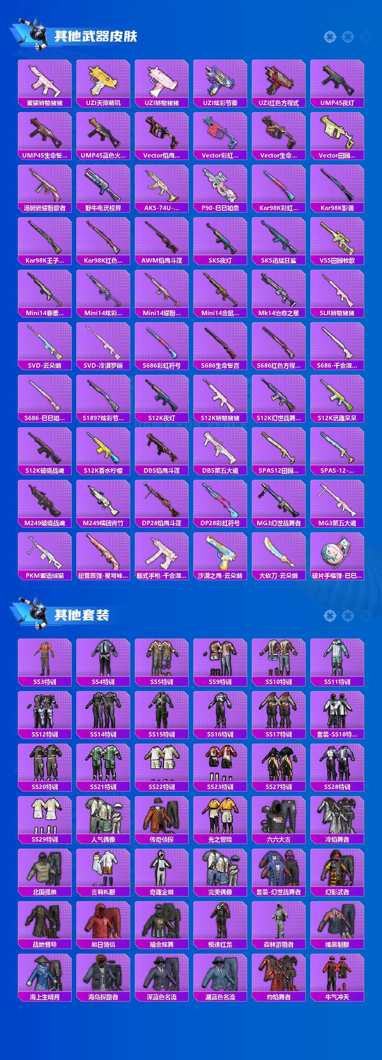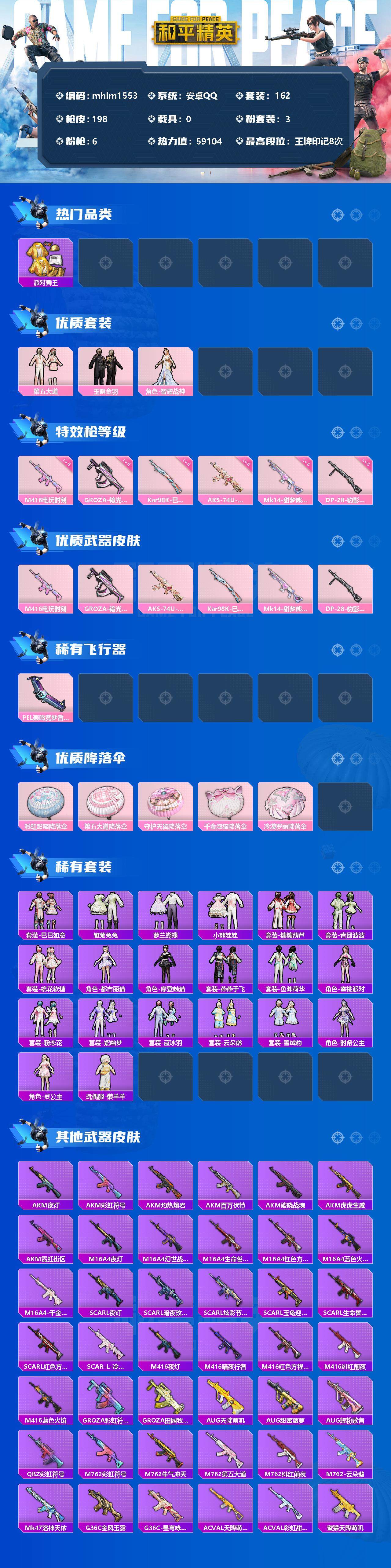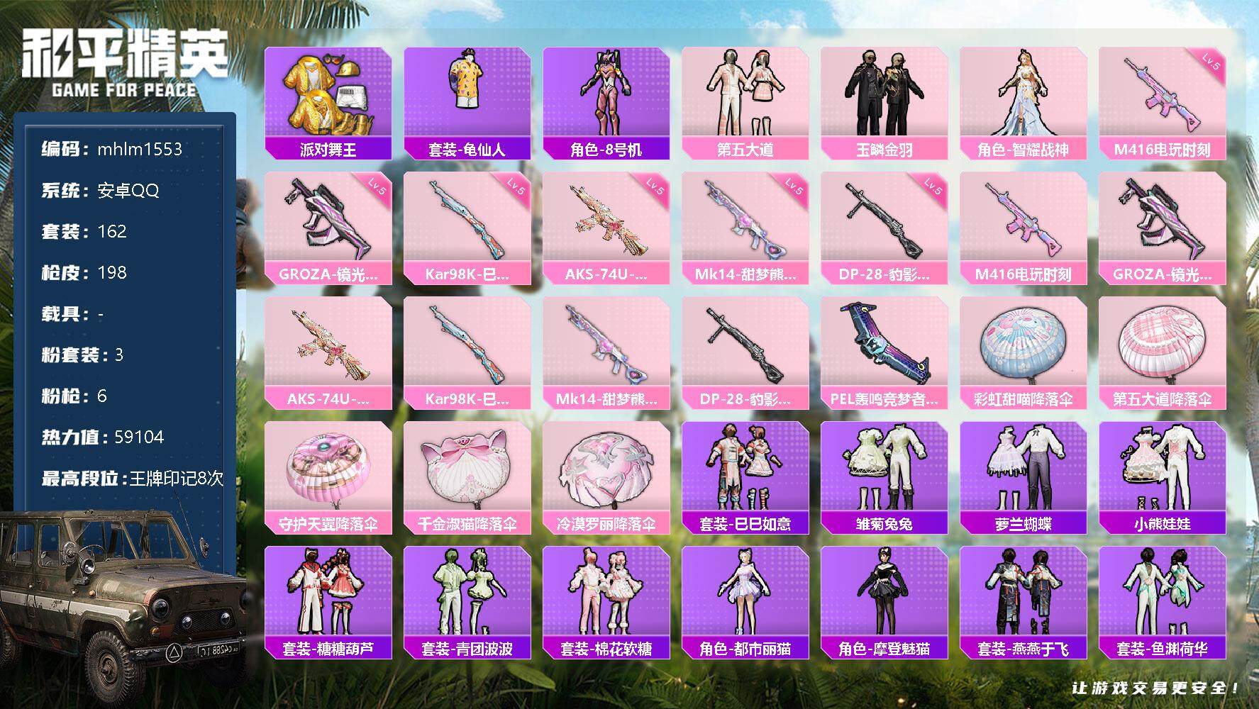 [13039549]安卓 手q-3粉装-6特效呛-0载具-2粉色飞行器-59104热力值-8王牌印记-162套装-198呛皮 【热门品类】:套装-派对舞王,套装-龟仙人,角色-8号机 【粉色套装】:粉装-第五大道,粉装-玉鳞金羽,角色-智耀战神 【粉色呛皮等级】:m416-电玩时刻五级,groza-镜光银凌五级,aks-74u-星穹咏叹调五级,kar98k-巳巳如意五级,mk14-甜梦熊击五级,dp-28-豹影疾电五级 【粉色呛皮】:m416-电玩时刻,groza-镜光银凌,aks-74u-星穹咏叹调,kar98k-巳巳如意,mk14-甜梦熊击,dp-28-豹影疾电 【粉色飞行器】:pel轰鸣竞梦者飞行器 【粉色降落伞】:彩虹甜喵降落伞,第五大道降落伞,守护天翼降落伞,千金淑猫降落伞,冷漠罗丽降落伞 【稀有套装】:套装-龟仙人,套装-巳巳如意,套装-雏菊兔兔,套装-萝兰蝴蝶,套装-小熊娃娃,套装-糖糖葫芦,套装-青团波波,套装-棉花软糖,角色-都市丽猫,角色-摩登魅猫,套装-燕燕于飞,套装-鱼渊荷华,角色-蜜桃派对,套装-粉恋花,套装-紫幽梦,套装-蓝冰羽,套装-云朵鹅,套装-雪绒豹,角色-时希公主,角色-灵公主,玩偶服-懒羊羊 【稀有呛皮】:akm-夜灯,akm-彩虹符号,akm-灼热熔岩,akm-百万伏特,akm-破晓战魂,akm-虎虎生威,akm-霓虹街区,m16a4-夜灯,m16a4-幻世战舞者,m16a4-生命誓言,m16a4-红色方程式,m16a4-蓝色火焰,m16a4-千金淑猫,scar-l-夜灯,scar-l-暗夜玫瑰,scar-l-炫彩节奏,scar-l-玉兔迎春,scar-l-生命誓言,scar-l-红色方程式,scar-l-冷漠罗丽,m416-夜灯,m416-暗夜行者,m416-红色方程式,m416-绯红前夜,m416-蓝色火焰,groza-彩虹符号,groza-田园牧歌,aug-天降萌叽,aug-甜蜜菠萝,aug-耀粉歌者,q-彩虹符号,m762-彩虹符号,m762-牛气冲天,m762-第五大道,m762-绯红前夜,m762-云朵鹅,mk47-洛神天依,g36c-金风玉露,g36c-星穹咏叹调,ac-val-天降萌叽,ac-val-彩虹甜喵,蜜獾-天降萌叽,蜜獾-娇憨猪猪,uzi-天降萌叽,uzi-娇憨猪猪,uzi-炫彩节奏,uzi