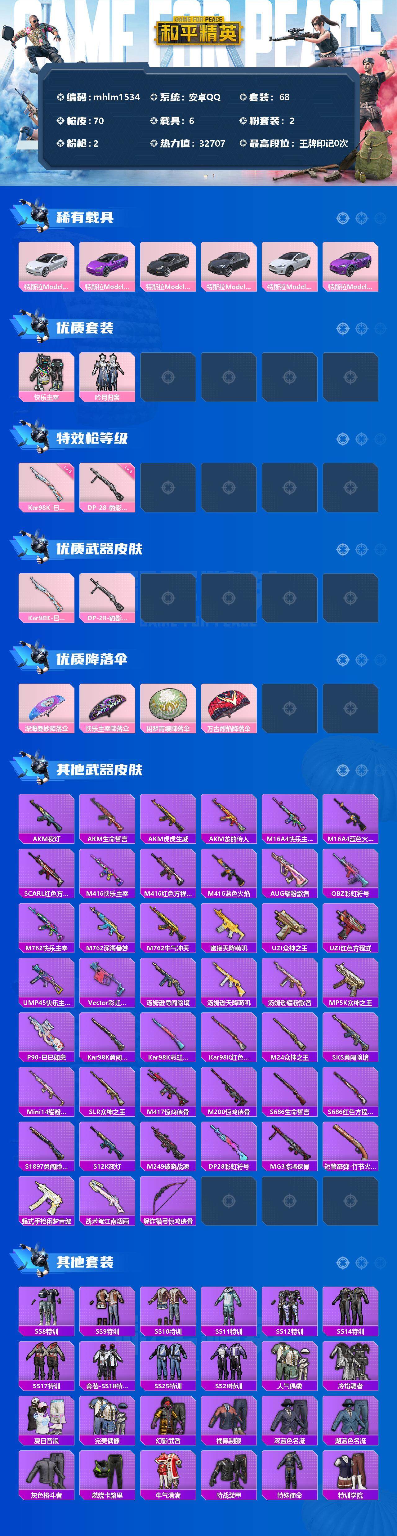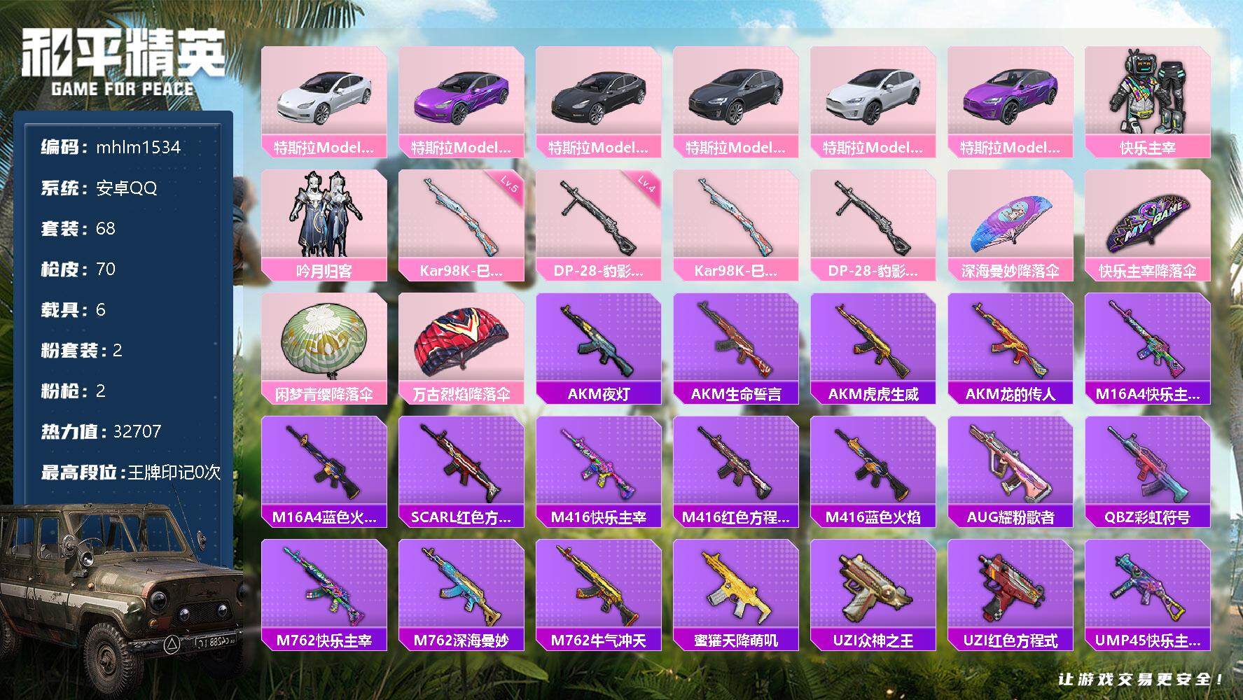 [12933807]安卓 手q-2粉装-2特效呛-6载具-0粉色飞行器-32707热力值-1王牌印记-68套装-70呛皮 【粉色载具】:特斯拉model 3(珍珠白),特斯拉model 3(奇幻紫),特斯拉model 3(冷光银),特斯拉model x(冷光银),特斯拉model x(珍珠白),特斯拉model x(奇幻紫) 【粉色套装】:粉装-快乐主宰,粉装-吟月归客 【粉色呛皮等级】:kar98k-巳巳如意五级,dp-28-豹影疾电四级 【粉色呛皮】:kar98k-巳巳如意,dp-28-豹影疾电 【粉色降落伞】:深海曼妙降落伞,快乐主宰降落伞,闲梦青缨降落伞,万古烈焰降落伞 【稀有呛皮】:akm-夜灯,akm-生命誓言,akm-虎虎生威,akm-龙的传人,m16a4-快乐主宰,m16a4-蓝色火焰,scar-l-红色方程式,m416-快乐主宰,m416-红色方程式,m416-蓝色火焰,aug-耀粉歌者,q-彩虹符号,m762-快乐主宰,m762-深海曼妙,m762-牛气冲天,蜜獾-天降萌叽,uzi-众神之王,uzi-红色方程式,ump45-快乐主宰,vect-彩虹符号,汤姆逊-勇闯险境,汤姆逊-天降萌叽,汤姆逊-耀粉歌者,mp5k-众神之王,p90-巳巳如意,kar98k-勇闯险境,kar98k-彩虹符号,kar98k-红色方程式,m24-众神之王,sks-勇闯险境,mini14-耀粉歌者,slr-众神之王,m417-惊鸿侠骨,m200-惊鸿侠骨,s686-生命誓言,s686-红色方程式,s1897-勇闯险境,s12k-夜灯,m249-破晓战魂,dp-28-彩虹符号,mg3-惊鸿侠骨,短管霰弹-竹节火铳,蝎式手呛-闲梦青缨,战术弩-江南烟雨,爆炸猎弓-惊鸿侠骨 【其他套装】:套装-ss8特训,套装-ss9特训,套装-ss10特训,套装-ss11特训,套装-ss12特训,套装-ss14特训,套装-ss17特训,套装-ss18特训,套装-ss25特训,套装-ss28特训,套装-人气偶像,套装-冷焰舞者,套装-夏日音浪,套装-完美偶像,套装-幻影武者,套装-橘黑制服,套装-深蓝色名流,套装-湖蓝色名流,套装-灰色格斗者,套装-燃烧卡路里,套装-牛气满满,套装-特战装甲,套装-特殊使命,套装-特训学院,套装-猎鹰,套装-猛禽,套装-白色伏地魔,套装-破蛋小黄鸡,套装-竞技