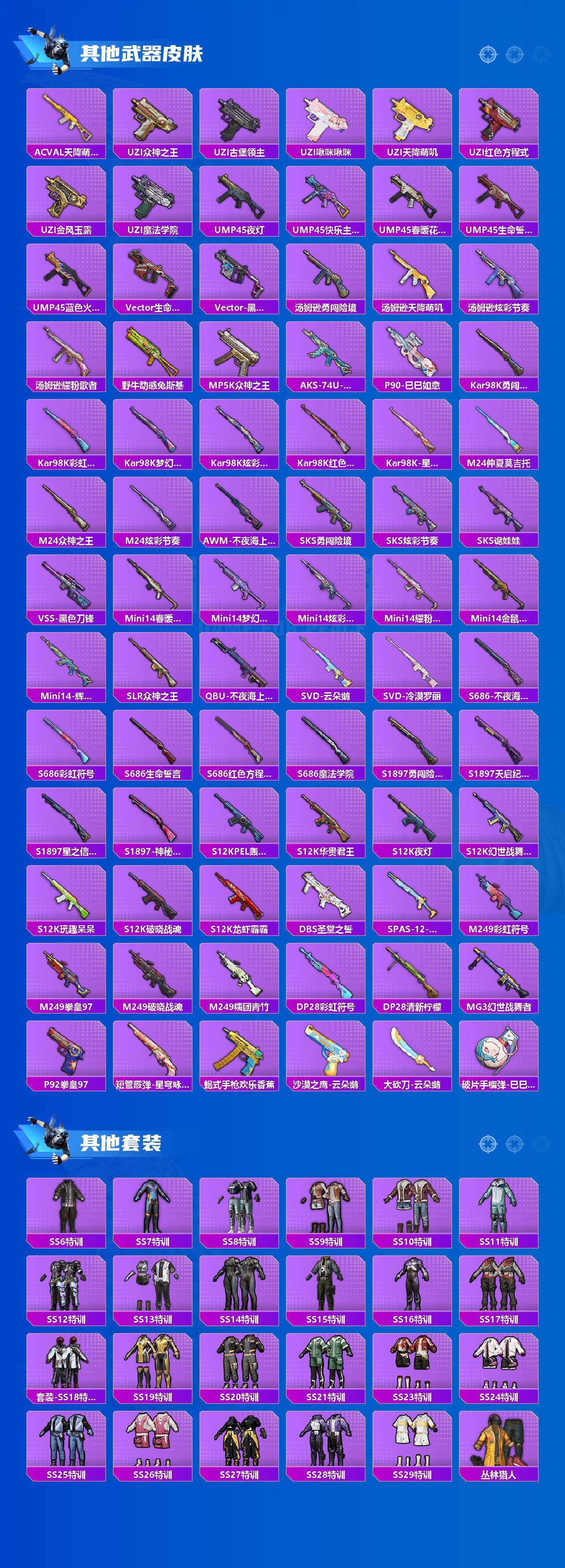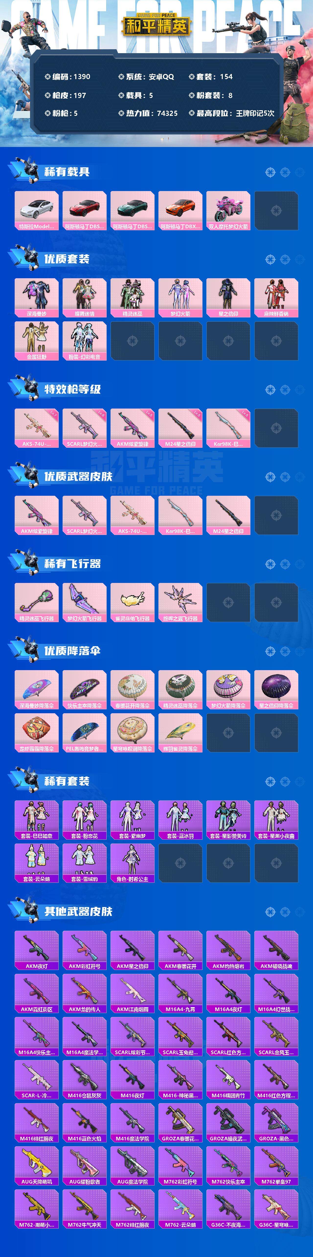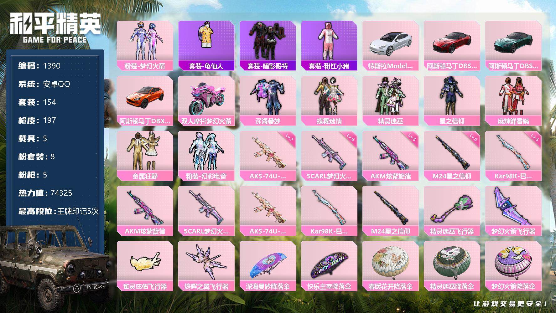 [12743178]安卓 手q-8粉装-5特效呛-5载具-4粉色飞行器-74325热力值-5王牌印记-154套装-197呛皮 【热门品类】:粉装-梦幻火箭,套装-龟仙人,套装-暗影哥特,套装-粉红小猪 【粉色载具】:特斯拉model 3(珍珠白),阿斯顿马丁dbs(红),阿斯顿马丁dbs(绿),阿斯顿马丁dbx(橙),双人摩托-梦幻火箭 【粉色套装】:粉装-深海曼妙,粉装-蝶舞迷情,粉装-精灵迷巫,粉装-梦幻火箭,粉装-星之信仰,粉装-麻辣鲜香锅,粉装-金属狂野,粉装-幻彩电音 【粉色呛皮等级】:akm-炫紫旋律五级,scar-l-梦幻火箭六级,aks-74u-星穹咏叹调七级,kar98k-巳巳如意五级,m24-星之信仰五级 【粉色呛皮】:akm-炫紫旋律,scar-l-梦幻火箭,aks-74u-星穹咏叹调,kar98k-巳巳如意,m24-星之信仰 【粉色飞行器】:精灵迷巫飞行器,梦幻火箭飞行器,雀灵庇佑飞行器,终晖之翼飞行器 【粉色降落伞】:深海曼妙降落伞,快乐主宰降落伞,春暖花开降落伞,精灵迷巫降落伞,梦幻火箭降落伞,星之信仰降落伞,龙虾霸霸降落伞,pel轰鸣竞梦者降落伞,星穹咏叹调降落伞,辉羽雀灵降落伞 【稀有套装】:套装-龟仙人,套装-巳巳如意,套装-粉恋花,套装-紫幽梦,套装-蓝冰羽,套装-星影赞美诗,套装-星渊小夜曲,套装-云朵鹅,套装-雪绒豹,角色-时希公主 【稀有呛皮】:akm-夜灯,akm-彩虹符号,akm-星之信仰,akm-春暖花开,akm-江南烟雨,akm-灼热熔岩,akm-破晓战魂,akm-霓虹街区,akm-龙的传人,m16a4-九霄,m16a4-夜灯,m16a4-幻世战舞者,m16a4-快乐主宰,m16a4-魔法学院,scar-l-炫彩节奏,scar-l-玉兔迎春,scar-l-红色方程式,scar-l-金风玉露,scar-l-冷漠罗丽,m416-仓鼠灰灰,m416-夜灯,m416-神秘黑猫,m416-糯团青竹,m416-红色方程式,m416-绯红前夜,m416-蓝色火焰,m416-魔法学院,groza-春暖花开,groza-暗夜武装,groza-黑色刀锋,aug-天降萌叽,aug-耀粉歌者,aug-魔法学院,m762-彩虹符号,m762-快乐主宰,m762-拳皇97,m762-潮萌小黄鸭,m762-牛气冲天,m762-绯红前夜,m762