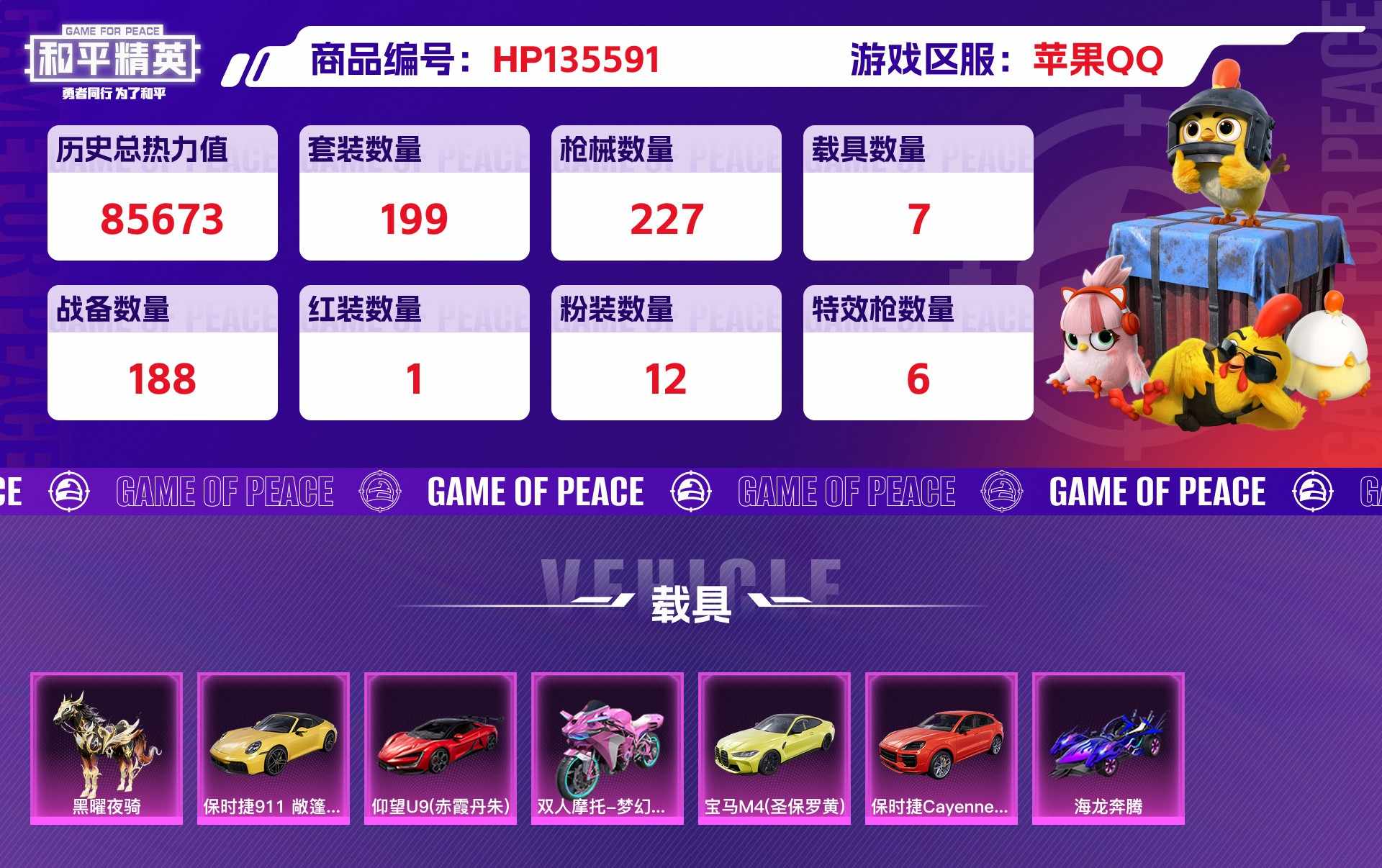 hp135591|极品素材号苹果q1红装(3级图卡盟) 12粉装 6粉呛(7级风花雪月)7载具(保时捷911 仰望 宝马m4)梦幻火箭 冥河战士 深海小丑鱼