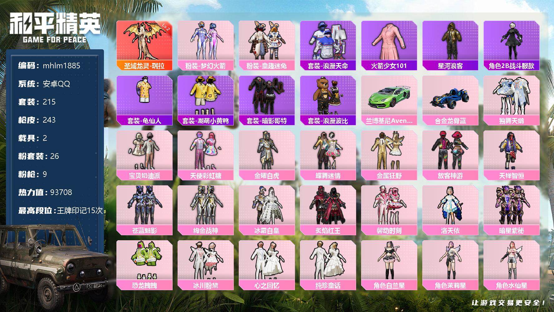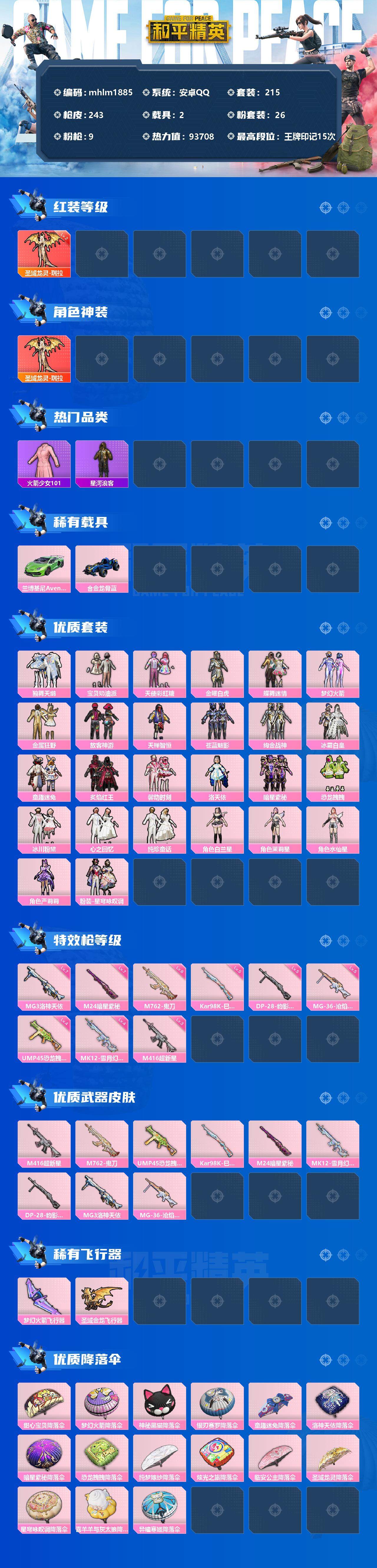 [13321514]【mhlm1885】安卓 手q-1神装-26粉装-9特效呛-2载具-2粉色飞行器-93708热力值-15王牌印记-215套装-243呛皮 【红色神装等级】:圣域龙灵-瑞拉二级 【红色角色神装】:圣域龙灵-瑞拉 【热门品类】:粉装-梦幻火箭,粉装-童趣迷兔,套装-浪漫天命,套装-火箭少女101,套装-星河浪客,角色-2b战斗服款,套装-龟仙人,套装-潮萌小黄鸭,套装-暗影哥特,套装-浪漫波比 【粉色载具】:兰博基尼aventad svj(翡翠绿),合金龙骨(蓝) 【粉色套装】:粉装-独舞天鹅,粉装-宝贝奶油派,粉装-天使彩虹糖,粉装-金曜白虎,粉装-蝶舞迷情,粉装-梦幻火箭,粉装-金属狂野,粉装-放客神游,粉装-天禅智恒,粉装-苍蓝魅影,粉装-绚金战神,粉装-冰霜白皇,粉装-童趣迷兔,粉装-炙焰红王,粉装-馨动时刻,角色-洛天依,粉装-暗星紫秘,粉装-恐龙拽拽,粉装-冰川粉黛,粉装-心之回忆,粉装-纯珍童话,角色-白兰星,角色-茉莉星,角色-水仙星,角色-严莉莉,粉装-星穹咏叹调 【粉色呛皮等级】:m416-超新星三级,m762-鬼刀六级,ump45-恐龙拽拽四级,kar98k-巳巳如意五级,m24-暗星紫秘七级,mk12-雪月幻音四级,dp-28-豹影疾电五级,mg3-洛神天依七级,mg-36-沧焰双生五级 【粉色呛皮】:m416-超新星,m762-鬼刀,ump45-恐龙拽拽,kar98k-巳巳如意,m24-暗星紫秘,mk12-雪月幻音,dp-28-豹影疾电,mg3-洛神天依,mg-36-沧焰双生 【粉色飞行器】:梦幻火箭飞行器,圣域金龙飞行器 【粉色降落伞】:甜心宝贝降落伞,梦幻火箭降落伞,神秘黑猫降落伞,银刃赛罗降落伞,童趣迷兔降落伞,洛神天依降落伞,暗星紫秘降落伞,恐龙拽拽降落伞,纯梦嫁纱降落伞,炫光之旅降落伞,临安公主降落伞,圣域龙灵降落伞,星穹咏叹调降落伞,喜羊羊与灰太狼降落伞,异瞳寒姬降落伞 【稀有套装】:套装-龟仙人,套装-糖糖葫芦,套装-青团波波,套装-棉花软糖,角色-都市丽猫,套装-燕燕于飞,套装-鱼渊荷华,套装-晶辉守护,套装-粉恋花,套装-紫幽梦,套装-蓝冰羽,角色-猎影月神,套装-星影赞美诗,套装-霓虹热舞,套装-极速光影,套装-彩虹兔,套装-云朵鹅,套装-雪绒豹,角色-乐音,套装-朱霞炽焰,套装