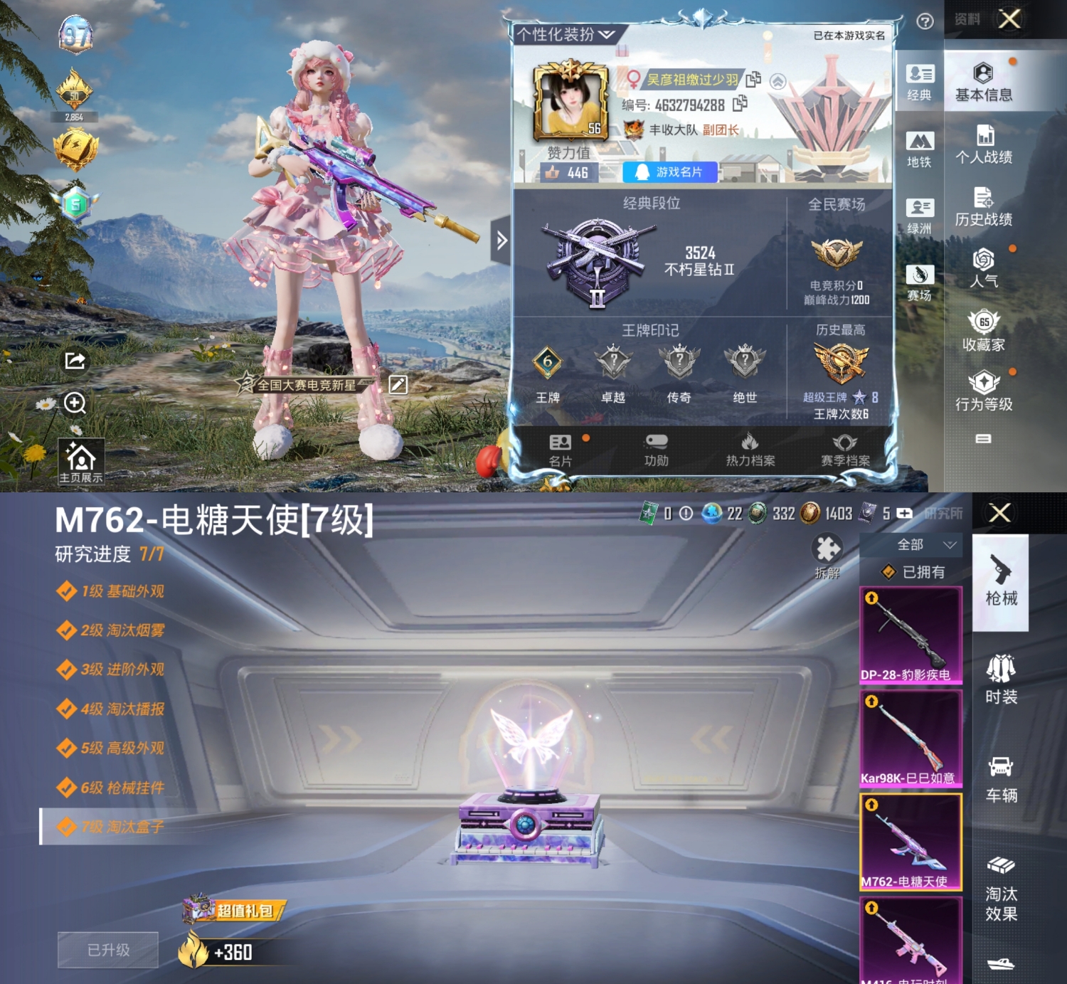 [13416428]和平 可二次 都市猎人 身法号素材号 5粉5呛 羊梦糖心 千金淑猫 圣堂之誓 傲傲奶龙 未来歌姬 懒羊羊 满级m762电糖天使 6级dp28暗夜鎏金 满级dp28豹影疾电 满级m416电玩时刻 满级98k巳巳如意 暗影哥特 幽秘之星 东方飞龙 迅捷狂鲨 小丑鱼 aw套装 临安公主 冰公主 浪漫天命 pkm紫幽梦淘汰盒子 scr海盐假日淘汰盒子 mg3惊鸿侠骨淘汰盒子 镜光幻镜飞行翼 戏水时光飞行器 实名: 可修改 时装数: 588 呛械数: 207 战备数: 161 热门装扮: 迅捷狂鲨鹰眼刺客都市猎人东方飞龙星兔领航员未来歌姬傲傲奶龙圣堂之誓千金淑猫羊梦糖心 稀有呛皮: dp-28暗夜鎏金m762-电糖天使m416电玩时刻kar98k-巳巳如意dp-28-豹影疾电