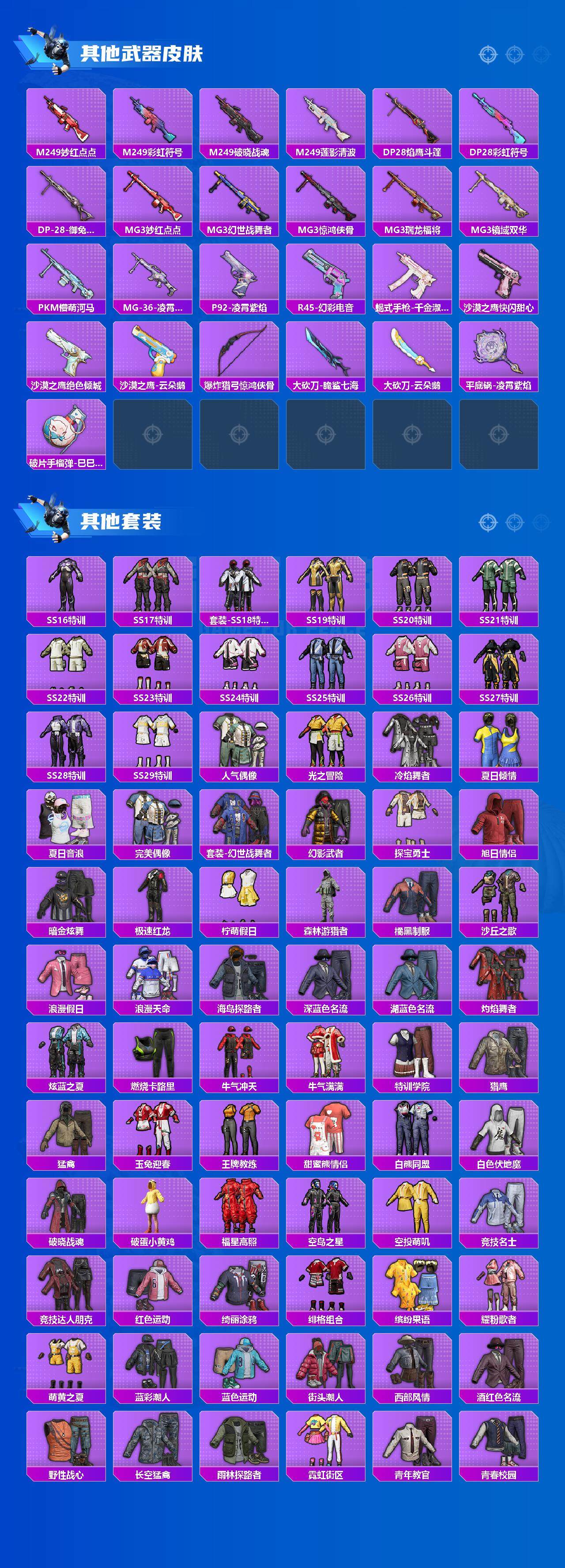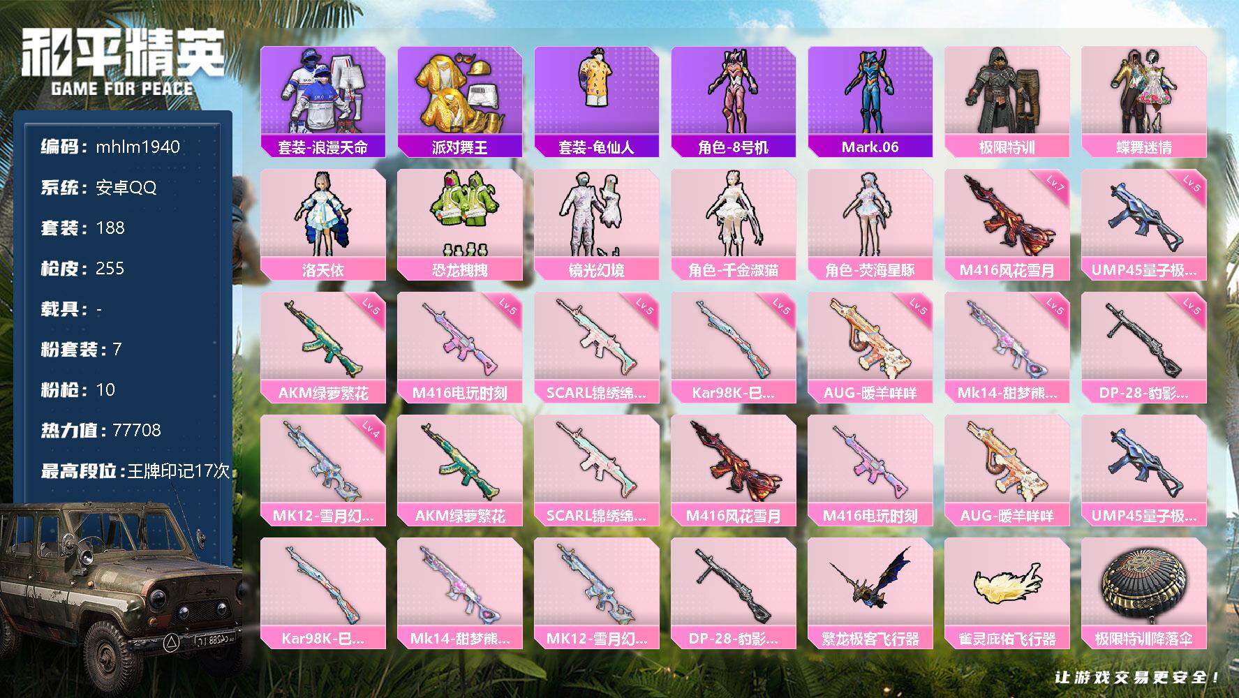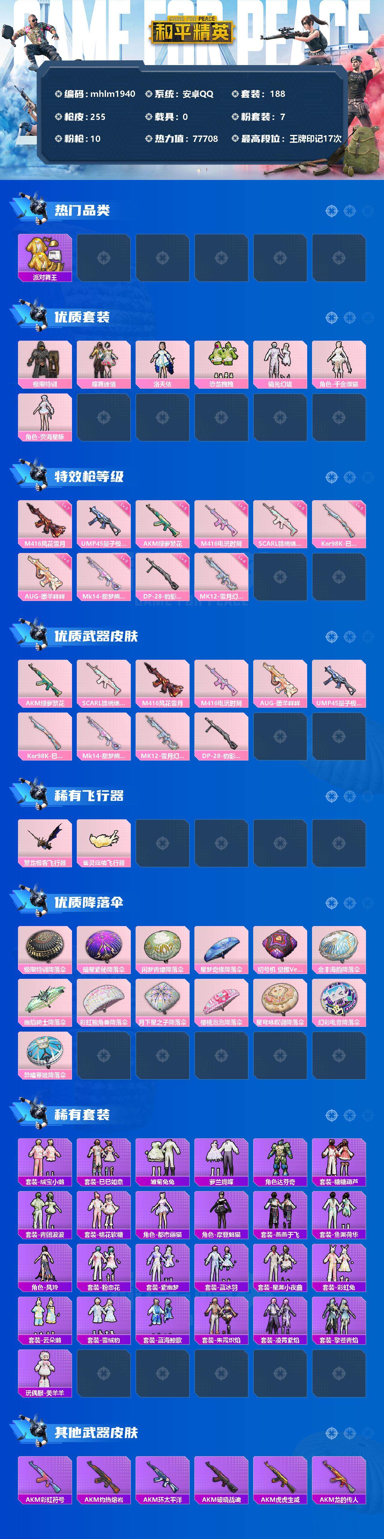 [13424895]【mhlm1940】安卓 手q-7粉装-10特效呛-0载具-5粉色飞行器-77708热力值-17王牌印记-188套装-255呛皮 【热门品类】:套装-浪漫天命,套装-派对舞王,套装-龟仙人,角色-8号机,角色-mark.06 【粉色套装】:粉装-极限特训,粉装-蝶舞迷情,角色-洛天依,粉装-恐龙拽拽,粉装-镜光幻境,角色-千金淑猫,角色-荧海星豚 【粉色呛皮等级】:akm-绿萝繁花五级,scar-l-锦绣绵绵五级,m416-风花雪月七级,m416-电玩时刻五级,aug-暖羊咩咩五级,ump45-量子极限五级,kar98k-巳巳如意五级,mk14-甜梦熊击五级,mk12-雪月幻音四级,dp-28-豹影疾电五级 【粉色呛皮】:akm-绿萝繁花,scar-l-锦绣绵绵,m416-风花雪月,m416-电玩时刻,aug-暖羊咩咩,ump45-量子极限,kar98k-巳巳如意,mk14-甜梦熊击,mk12-雪月幻音,dp-28-豹影疾电 【粉色飞行器】:繁龙极客飞行器,雀灵庇佑飞行器 【粉色降落伞】:极限特训降落伞,暗星紫秘降落伞,闲梦青缨降落伞,星梦奇缘降落伞,初号机 觉醒ver.降落伞,金丰海韵降落伞,幽焰骑士降落伞,彩虹独角兽降落伞,月下星之子降落伞,樱桃泡泡降落伞,星穹咏叹调降落伞,幻彩电音降落伞,异瞳寒姬降落伞 【稀有套装】:套装-龟仙人,套装-绒宝小鹅,套装-巳巳如意,套装-雏菊兔兔,套装-萝兰蝴蝶,角色-达芬奇,套装-糖糖葫芦,套装-青团波波,套装-棉花软糖,角色-都市丽猫,角色-摩登魅猫,套装-燕燕于飞,套装-鱼渊荷华,角色-风玲,套装-粉恋花,套装-紫幽梦,套装-蓝冰羽,套装-星渊小夜曲,套装-彩虹兔,套装-云朵鹅,套装-雪绒豹,套装-蓝海鲸歌,套装-朱霞炽焰,套装-凌霄紫焰,套装-擎苍青焰,玩偶服-美羊羊 【稀有呛皮】:akm-彩虹符号,akm-灼热熔岩,akm-环太平洋,akm-破晓战魂,akm-虎虎生威,akm-龙的传人,akm-灵猫魔法师,m16a4-幻世战舞者,m16a4-蓝色火焰,m16a4-千金淑猫,scar-l-夜灯,scar-l-玉兔迎春,scar-l-红色方程式,m416-糯团青竹,m416-红色方程式,m416-蓝色火焰,groza-异彩先驱,groza-影袭,groza-恐龙拽拽,groza-懵