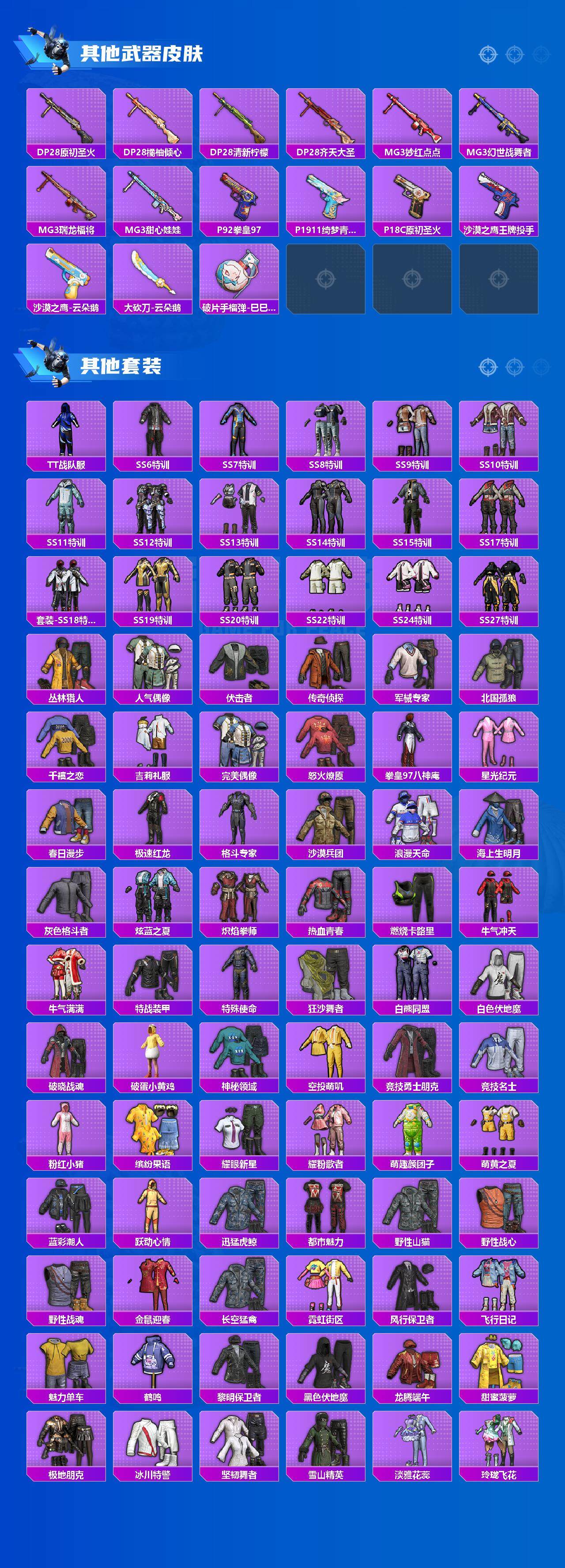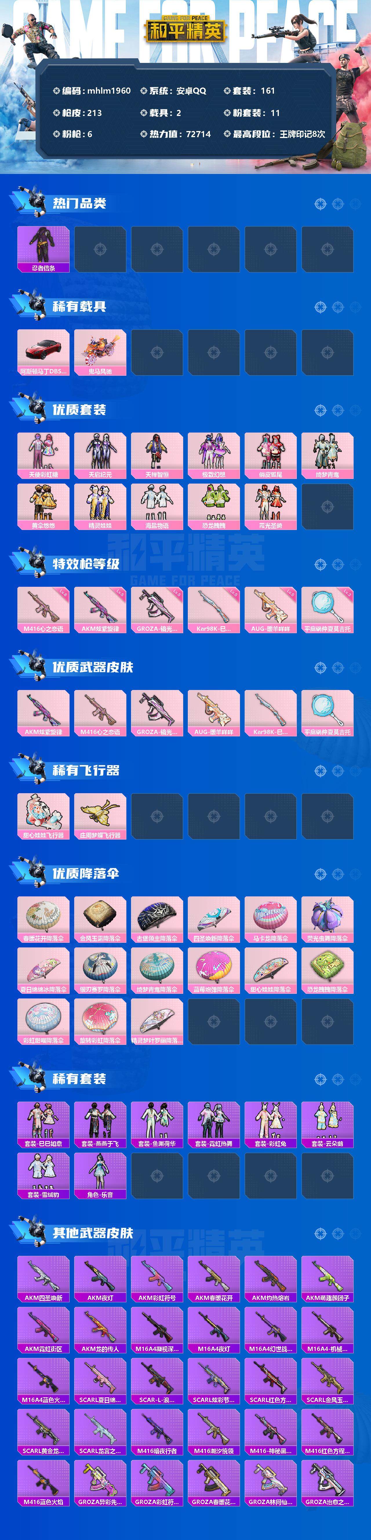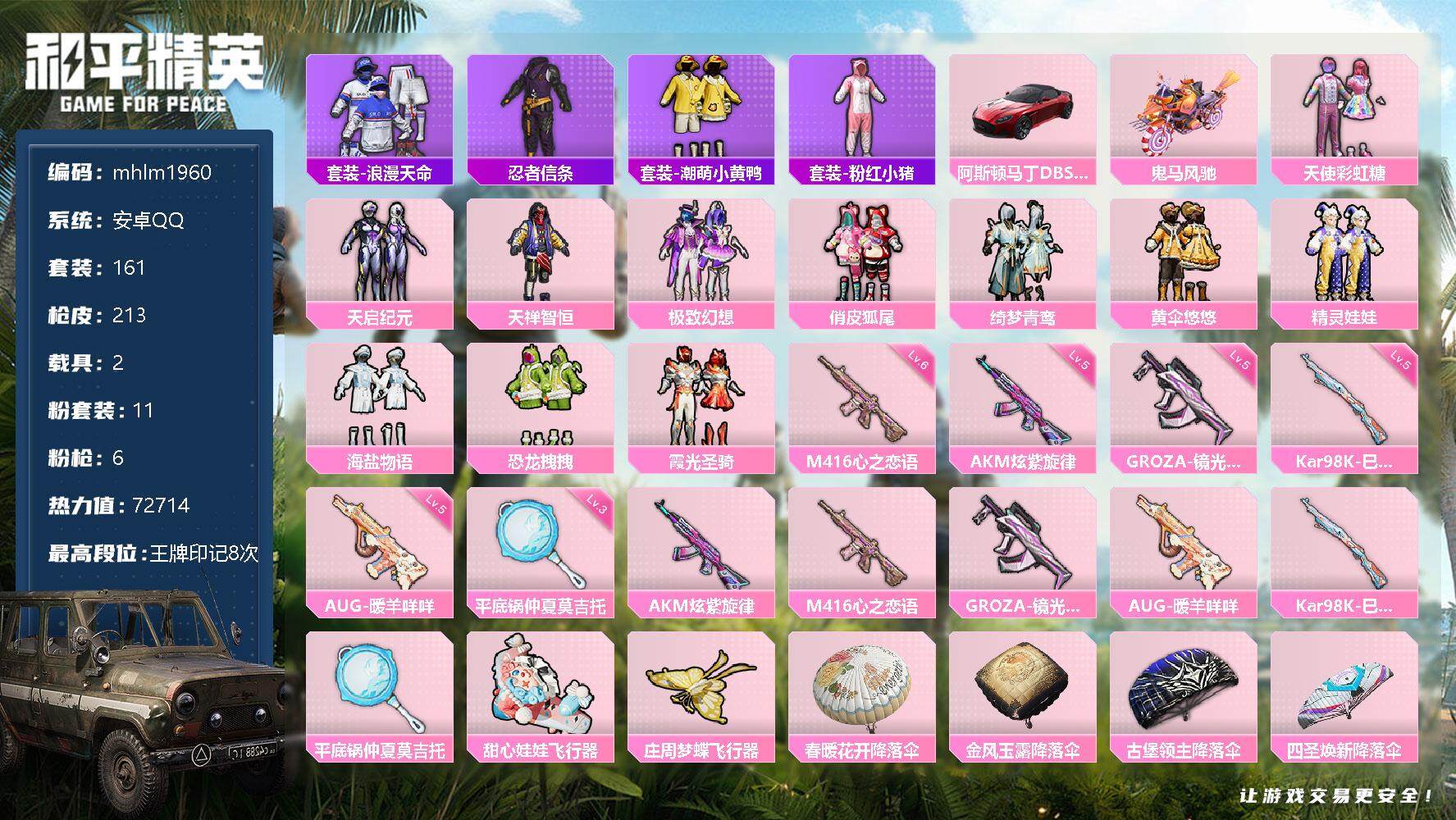 [13425854]【mhlm1960】安卓 手q-11粉装-6特效呛-2载具-2粉色飞行器-72714热力值-8王牌印记-161套装-213呛皮 【热门品类】:套装-浪漫天命,套装-忍者信条,套装-潮萌小黄鸭,套装-粉红小猪 【粉色载具】:阿斯顿马丁dbs(红),鬼马风驰 【粉色套装】:粉装-天使彩虹糖,粉装-天启纪元,粉装-天禅智恒,粉装-极致幻想,粉装-俏皮狐尾,粉装-绮梦青鸾,粉装-黄伞悠悠,粉装-精灵娃娃,粉装-海盐物语,粉装-恐龙拽拽,粉装-霞光圣骑 【粉色呛皮等级】:akm-炫紫旋律五级,m416-心之恋语六级,groza-镜光银凌五级,aug-暖羊咩咩五级,kar98k-巳巳如意五级,平底锅-仲夏莫吉托三级 【粉色呛皮】:akm-炫紫旋律,m416-心之恋语,groza-镜光银凌,aug-暖羊咩咩,kar98k-巳巳如意,平底锅-仲夏莫吉托 【粉色飞行器】:甜心娃娃飞行器,庄周梦蝶飞行器 【粉色降落伞】:春暖花开降落伞,金风玉露降落伞,古堡领主降落伞,四圣焕新降落伞,马卡龙降落伞,荧光虫舞降落伞,夏日绵绵冰降落伞,银刃赛罗降落伞,绮梦青鸾降落伞,蓝莓炮弹降落伞,甜心娃娃降落伞,恐龙拽拽降落伞,彩虹甜喵降落伞,旋转彩虹降落伞,精灵梦叶罗丽降落伞 【稀有套装】:套装-巳巳如意,套装-燕燕于飞,套装-鱼渊荷华,套装-霓虹热舞,套装-彩虹兔,套装-云朵鹅,套装-雪绒豹,角色-乐音 【稀有呛皮】:akm-四圣焕新,akm-夜灯,akm-彩虹符号,akm-春暖花开,akm-灼热熔岩,akm-萌趣颜团子,akm-霓虹街区,akm-龙的传人,m16a4-凝视深渊,m16a4-夜灯,m16a4-幻世战舞者,m16a4-机械英豪,m16a4-蓝色火焰,scar-l-夏日绵绵冰,scar-l-浪客战士,scar-l-炫彩节奏,scar-l-红色方程式,scar-l-金风玉露,scar-l-黄金龙骨,scar-l-龙宫之主,m416-暗夜行者,m416-潮汐统领,m416-神秘黑猫,m416-红色方程式,m416-蓝色火焰,groza-异彩先驱,groza-彩虹符号,groza-春暖花开,groza-林间仙鹿,groza-治愈之星,groza-田园牧歌,groza-黑色刀锋,aug-天降萌叽,aug-耀粉歌者,aug-青春冒险家,aug-魔法学院,q-原初圣火,q