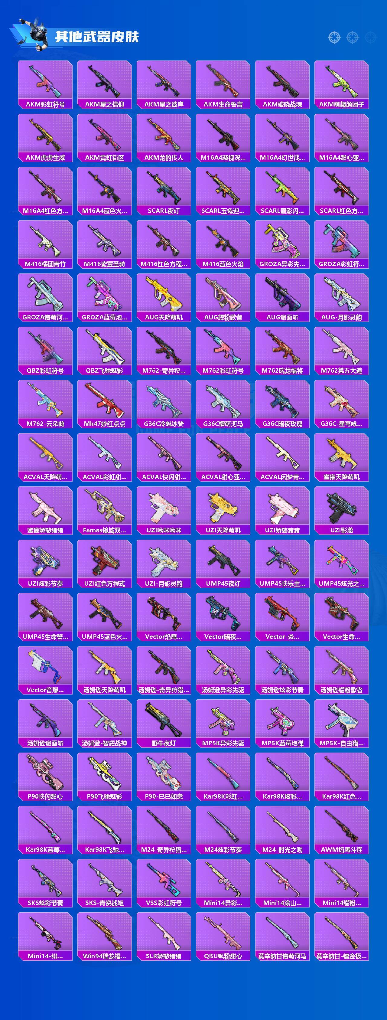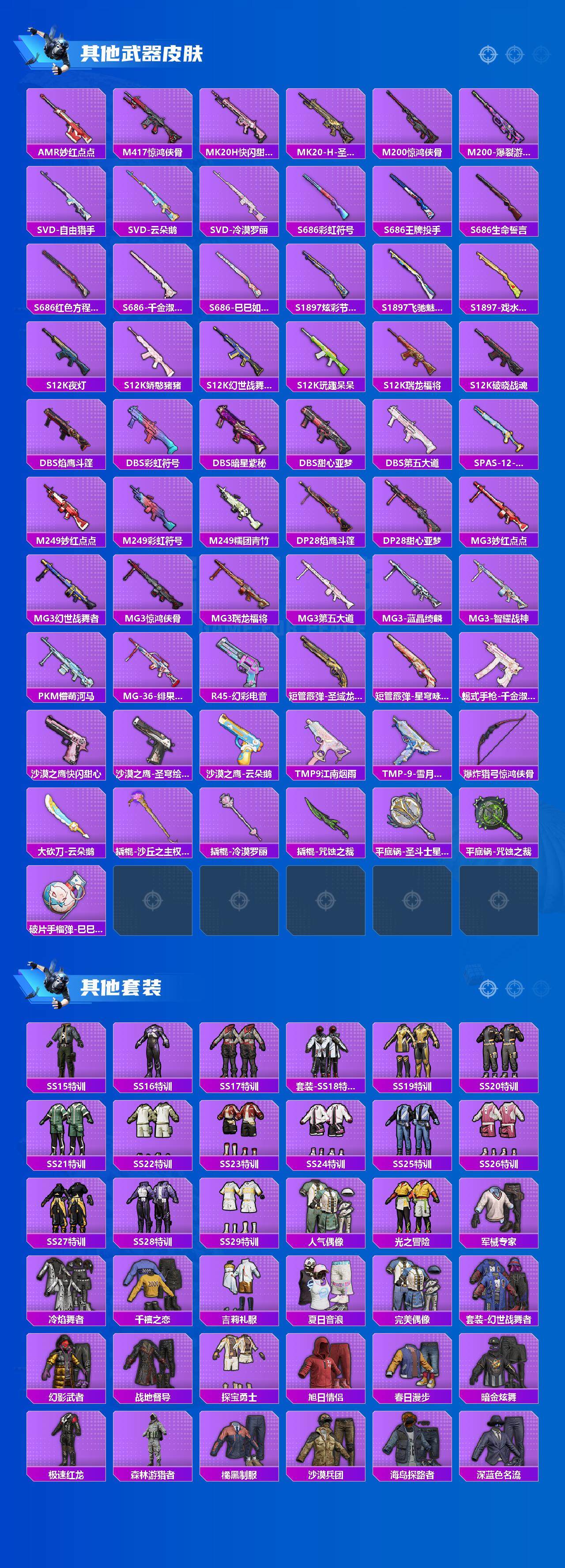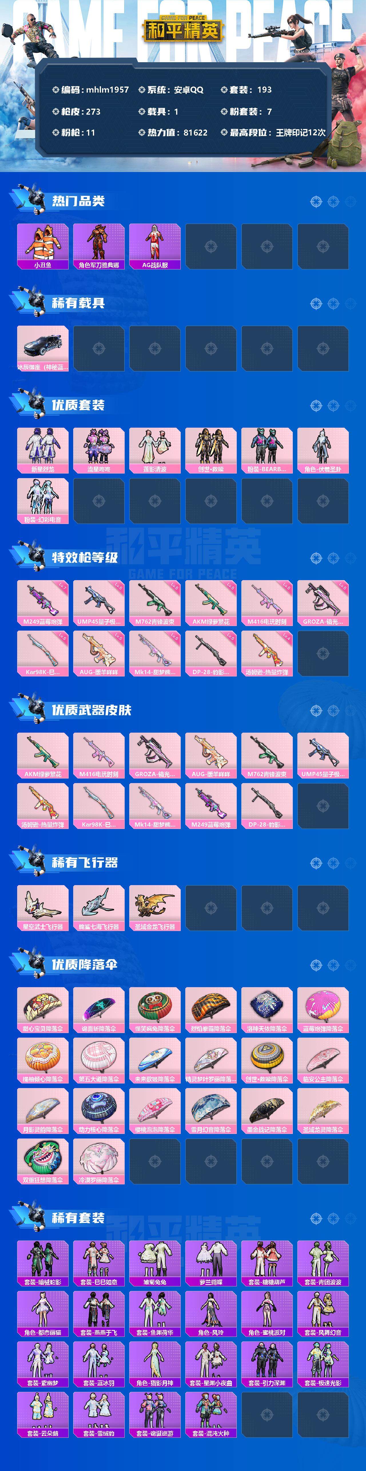 [13426045]【mhlm1957】安卓 手q-7粉装-11特效呛-1载具-3粉色飞行器-81622热力值-12王牌印记-193套装-273呛皮 【热门品类】:套装-小丑鱼,套装-奇异狩猎者,角色-军刀雅典娜,套装-ag战队服,套装-龟仙人 【粉色载具】:冰辰御座(神秘蓝) 【粉色套装】:粉装-新星烈龙,粉装-流星咚咚,粉装-莲影清波,套装-创世·救赎,粉装-bearbrick,角色-伏羲圣卦,粉装-幻彩电音 【粉色呛皮等级】:akm-绿萝繁花五级,m416-电玩时刻五级,groza-镜光银凌五级,aug-暖羊咩咩五级,m762-青锋波束五级,ump45-量子极限五级,汤姆逊-热量炸弹四级,kar98k-巳巳如意五级,mk14-甜梦熊击五级,m249-蓝莓炮弹七级,dp-28-豹影疾电五级 【粉色呛皮】:akm-绿萝繁花,m416-电玩时刻,groza-镜光银凌,aug-暖羊咩咩,m762-青锋波束,ump45-量子极限,汤姆逊-热量炸弹,kar98k-巳巳如意,mk14-甜梦熊击,m249-蓝莓炮弹,dp-28-豹影疾电 【粉色飞行器】:星空武士飞行器,脆鲨七海飞行器,圣域金龙飞行器 【粉色降落伞】:甜心宝贝降落伞,诡面斩降落伞,怪笑疯兔降落伞,烈焰拳霸降落伞,洛神天依降落伞,蓝莓炮弹降落伞,橘柚倾心降落伞,第五大道降落伞,未来歌姬降落伞,精灵梦叶罗丽降落伞,创世·救赎降落伞,临安公主降落伞,月影灵韵降落伞,动力核心降落伞,樱桃泡泡降落伞,雪月幻音降落伞,墨金战记降落伞,圣域龙灵降落伞,双重狂想降落伞,冷漠罗丽降落伞 【稀有套装】:套装-龟仙人,套装-暗械蛇影,套装-巳巳如意,套装-雏菊兔兔,套装-萝兰蝴蝶,套装-糖糖葫芦,套装-青团波波,角色-都市丽猫,套装-燕燕于飞,套装-鱼渊荷华,角色-风玲,角色-蜜桃派对,套装-风舞幻音,套装-紫幽梦,套装-蓝冰羽,角色-猎影月神,套装-星渊小夜曲,套装-引力深渊,套装-极速光影,套装-云朵鹅,套装-雪绒豹,套装-诡诞巡游,套装-混沌火种 【稀有呛皮】:akm-彩虹符号,akm-星之信仰,akm-星之彼岸,akm-生命誓言,akm-破晓战魂,akm-萌趣颜团子,akm-虎虎生威,akm-霓虹街区,akm-龙的传人,m16a4-凝视深渊,m16a4-幻世战舞者,m16a4-甜心亚梦,m16a4-