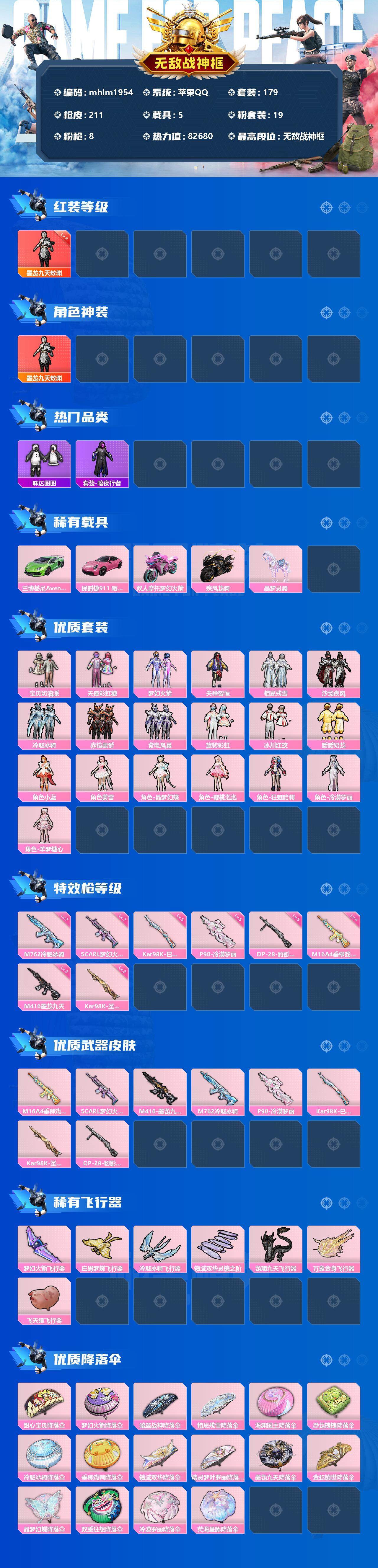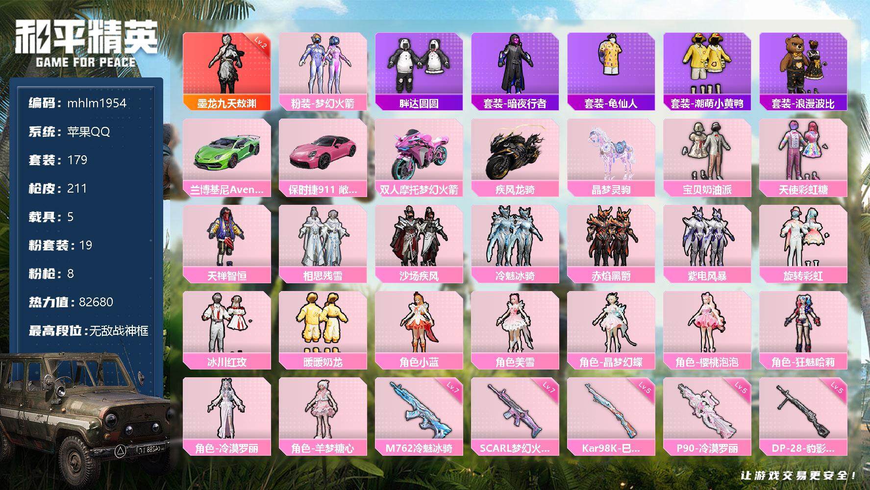 [13426171]【mhlm1954】苹果 手q-无敌战神框-1神装-19粉装-8特效呛-5载具-8粉色飞行器-82680热力值-19王牌印记-179套装-211呛皮 【红色神装等级】:墨龙九天-敖渊二级 【红色角色神装】:墨龙九天-敖渊 【热门品类】:粉装-梦幻火箭,套装-胖达圆圆,套装-暗夜行者,套装-龟仙人,套装-潮萌小黄鸭,套装-浪漫波比 【粉色载具】:兰博基尼aventad svj(翡翠绿),保时捷911 敞篷版(星珀红),双人摩托-梦幻火箭,疾风龙骑,晶梦灵驹 【粉色套装】:粉装-宝贝奶油派,粉装-天使彩虹糖,粉装-梦幻火箭,粉装-天禅智恒,粉装-相思残雪,粉装-沙场疾风,粉装-冷魅冰骑,粉装-赤焰黑爵,粉装-紫电风暴,粉装-旋转彩虹,粉装-冰川红玫,粉装-暖暖奶龙,角色-小蓝,角色-美雪,角色-晶梦幻蝶,角色-樱桃泡泡,角色-狂魅哈莉,角色-冷漠罗丽,角色-羊梦糖心 【粉色呛皮等级】:m16a4-垂柳戏鸭四级,scar-l-梦幻火箭七级,m416-墨龙九天三级,m762-冷魅冰骑七级,p90-冷漠罗丽五级,kar98k-巳巳如意五级,kar98k-圣域龙灵三级,dp-28-豹影疾电五级 【粉色呛皮】:m16a4-垂柳戏鸭,scar-l-梦幻火箭,m416-墨龙九天,m762-冷魅冰骑,p90-冷漠罗丽,kar98k-巳巳如意,kar98k-圣域龙灵,dp-28-豹影疾电 【粉色飞行器】:梦幻火箭飞行器,庄周梦蝶飞行器,冷魅冰骑飞行器,镜域双华-灵镜之阶,龙翔九天飞行器,万象金身飞行器,飞天猪飞行器 【粉色降落伞】:甜心宝贝降落伞,梦幻火箭降落伞,暗翼战神降落伞,相思残雪降落伞,海渊国主降落伞,恐龙拽拽降落伞,冷魅冰骑降落伞,垂柳戏鸭降落伞,镜域双华降落伞,精灵梦叶罗丽降落伞,墨龙九天降落伞,金蛇镇世降落伞,晶梦幻蝶降落伞,双重狂想降落伞,冷漠罗丽降落伞,荧海星豚降落伞 【稀有套装】:套装-龟仙人,套装-巳巳如意,角色-都市丽猫,角色-摩登魅猫,角色-光矢逐梦,套装-燕燕于飞,套装-鱼渊荷华,角色-风玲,套装-晶灵使者,套装-晶辉守护,套装-极速光影,套装-彩虹兔,套装-云朵鹅,套装-雪绒豹,套装-诡诞巡游,角色-灵公主,套装-蜜露汐语,套装-蓝海鲸歌,套装-朱霞炽焰,套装-凌霄紫焰,套装-擎苍青焰,玩偶服-懒羊羊,玩偶服-美羊羊