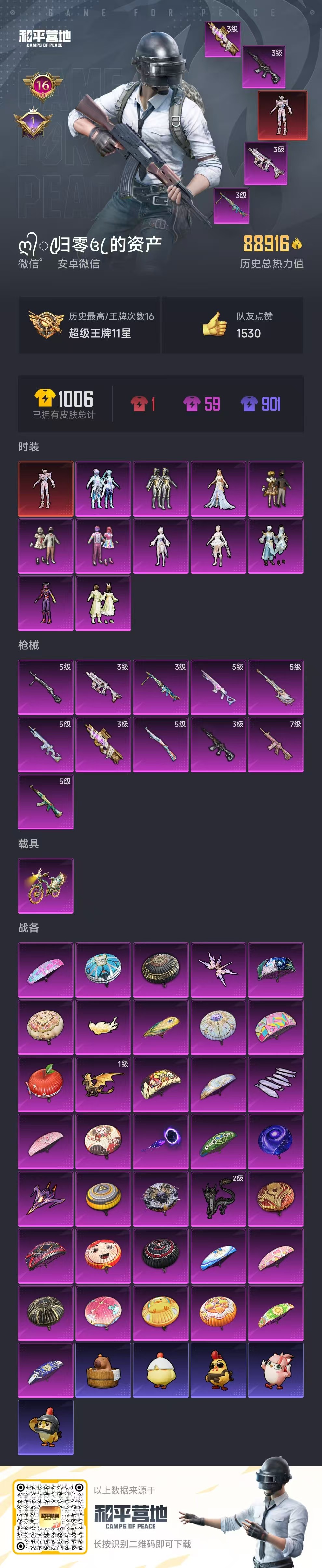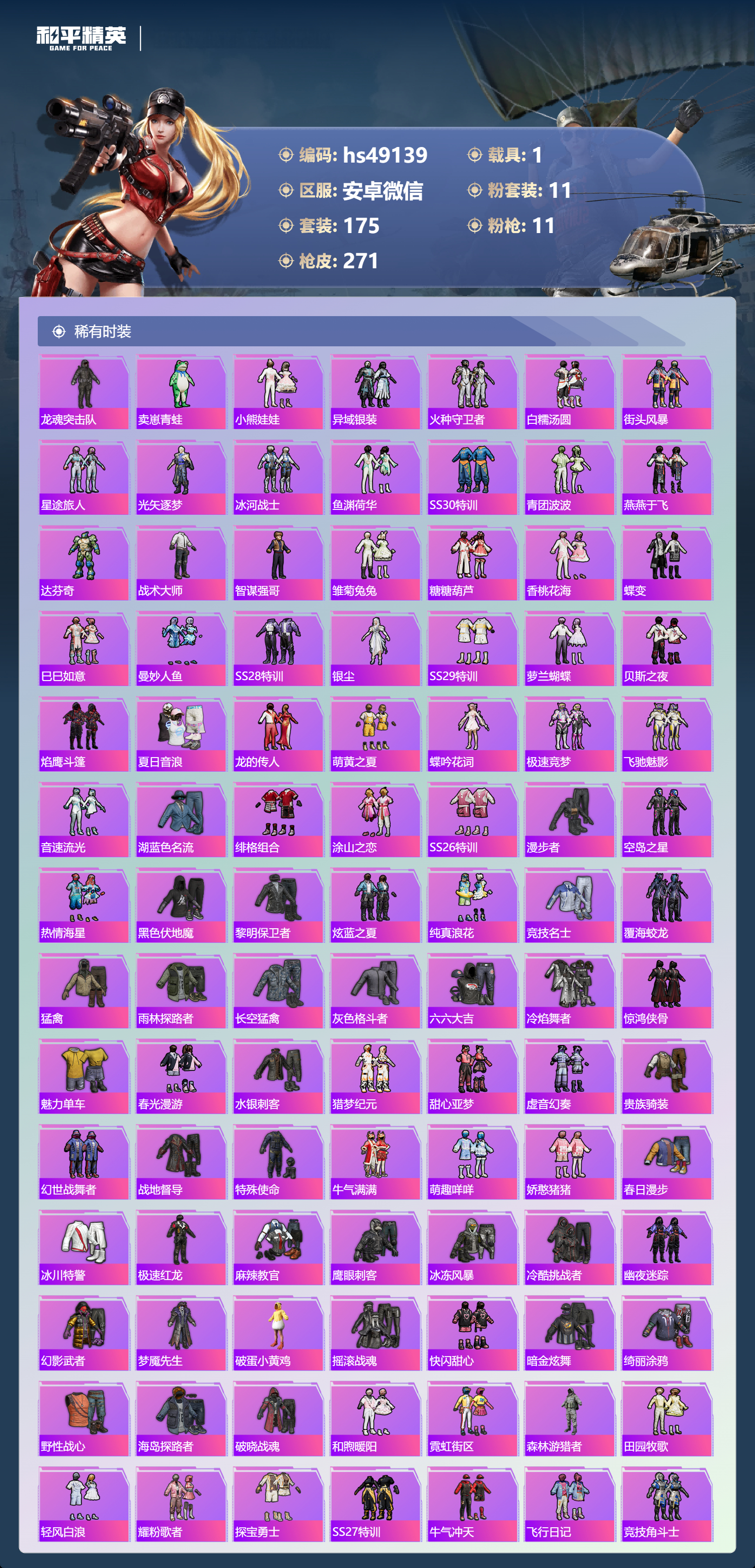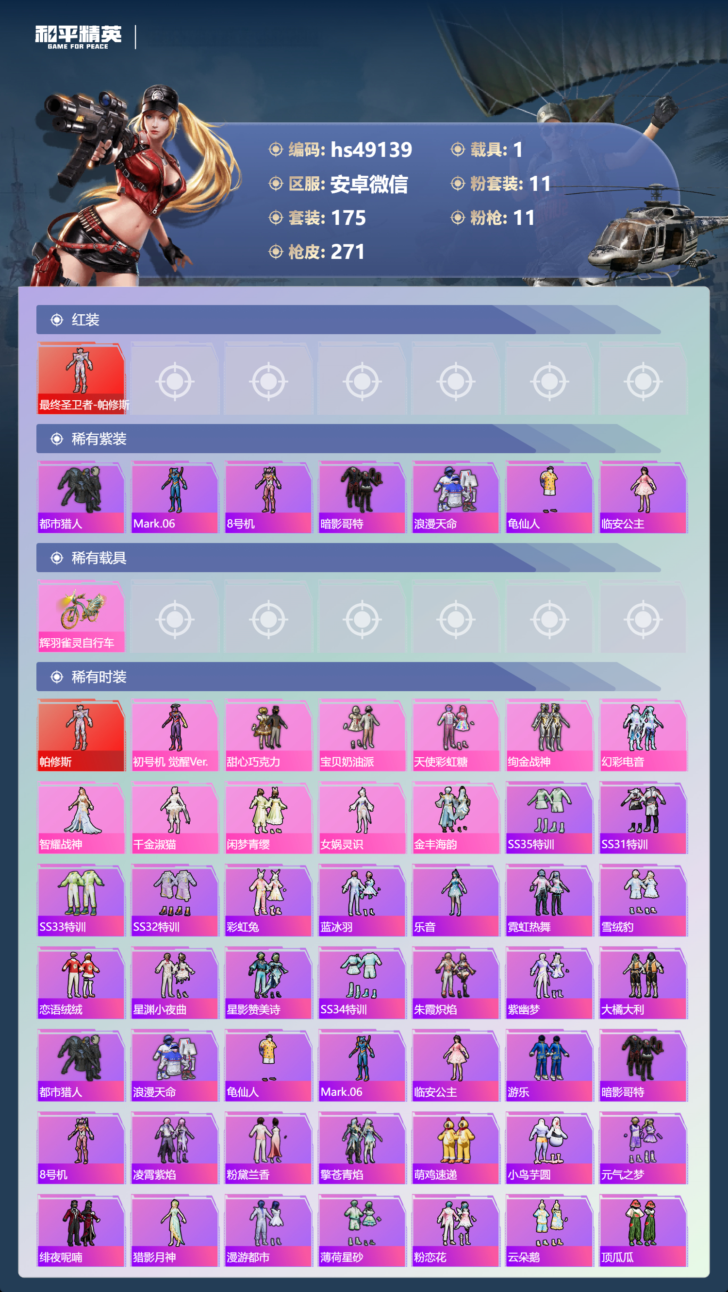 hs49139 安卓微信-16王牌印记-1红装-11粉装-11特效呛-1载具-88951热力值-175套装-271呛皮-1卓越印记【1红装】最终圣卫者-帕修斯【11粉装】角色-初号机 觉醒ver.套装-闲梦青缨角色-千金淑猫角色-女娲灵识套装-金丰海韵套装-天使彩虹糖角色-智耀战神套装-幻彩电音套装-甜心巧克力套装-绚金战神套装-宝贝奶油派【11特效呛】kar98k-巳巳