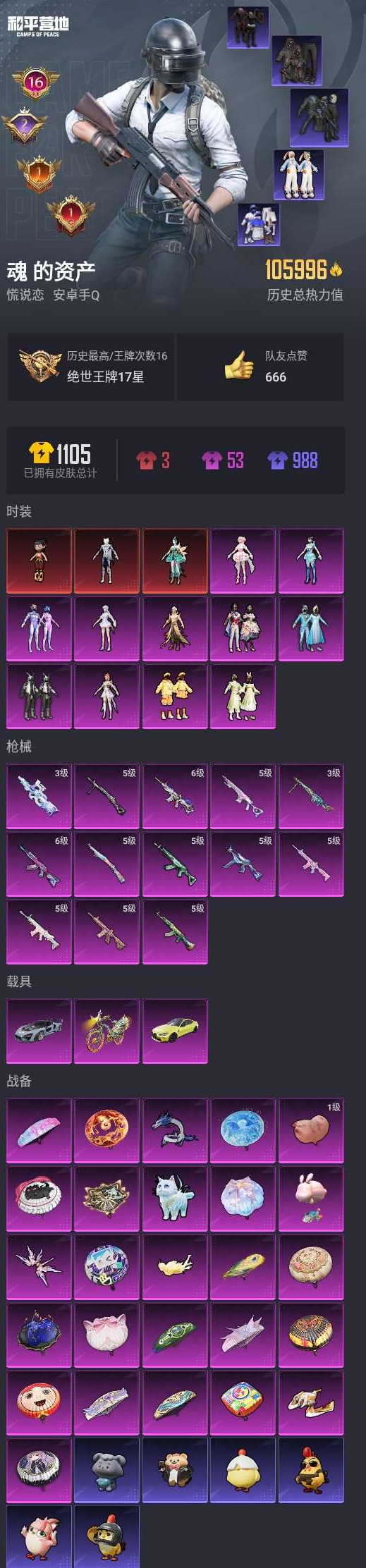 【和平精英】【lyhp15445】16印记1绝世10w热力值 3红11粉13特效呛3载 3级哪吒 其余1级 雪国幻梦 梦幻火箭 奇迹舞步 都市猎人 多呛型 6级m4灵猫魔法师 宝马m4 幻影随风 11粉装,13特效呛,3载具,历史最高段位:绝世王牌17星 王牌印记16次 热力值:105996,199套装,320呛械,388装备,161战备;套装:辉羽雀灵-初翊,魔童闹海-哪吒,灵猫魔法师-塞维尔,套装-数码大师,套装-雪国幻梦,套装-梦幻火箭,套装-闲梦青缨,角色-圣堂之誓,套装-憨憨奶龙,角色-异瞳寒姬,角色-罗征,套装-星穹咏叹调,角色-荧海星豚,角色-奇迹舞步 美雪,套装-黄色运动,套装-白色伏地魔,套装-黑色伏地魔,套装-骑行爱好者,套装-竞技名士,套装-酒红色名流,套装-湖蓝色名流,套装-黄色名流,套装-猛禽,套装-长空猛禽,套装-漫步者,套装-竞技勇士朋克,套装-蓝色守护者,套装-旭日情侣,套装-六六大吉,套装-冷焰舞者,套装-都市猎人,套装-水银刺客,套装-浪漫天命,套装-特战装甲,套装-浪漫假日,套装-青春校园,套装-鹰眼刺客,套装-冰冻风暴,套装-冷酷挑战者,套装-蓝彩潮人,套装-神秘领域,套装-怒火燎原,套装-魅力单车,套装-野性战心,套装-荣耀,套装-热血青春,套装-雪山精英,套装-传奇侦探,套装-幻世战舞者,套装-奇异狩猎者,套装-金耀舞者,套装-蓝调潮人,套装-暗影哥特,套装-弄潮海豚,套装-青涩时光,套装-缤纷果语,套装-龙魂突击队,套装-冰川特警,套装-青涩年华,套装-忍者信条,套装-海上生明月,套装-麻辣教官,套装-万圣娃娃,套装-疯狂小兔子,套装-北国孤狼,套装-ss6特训,套装-星光纪元,套装-跃动心情,套装-鹤鸣,套装-霓虹街区,套装-ss10特训,套装-ss8特训,套装-萌黄之夏,套装-夏日音浪,套装-ss9特训,套装-探宝勇士,套装-ag战队服,套装-牛气满满,套装-ss11特训,套装-原初圣火,套装-逆风勇士,套装-萌趣颜团子,套装-特种颜团子,套装-战术大师,套装-ss12特训,套装-牛气冲天,套装-ss18特训,套装-耀粉歌者,套装-ss13特训,套装-热情海星,套装-纯真浪花,套装-ss14特训,套装-电音精灵,套装-吉莉礼服,套装-ss15特训,套装-ag追光队服,套装-ss16特训,套装-ss17特训,套装-瑞龙福将,套装-团圆交子,套装-炫光向阳,套装-福星高照,套装-虎虎生威吉莉,套装-异彩先驱,套装-霓虹极客,套装-空投萌叽,套装-ss19特训,套装-兔兔白日梦,套装-飞驰魅影,套装-音速流光,套装-炫蓝之夏,套装-ss20特训,套装-猎梦纪元,套装-甜心亚梦,套装-虚音幻奏,套装-ss21特训,套装-玉兔迎春,套装-ss22特训,套装-和煦暖阳,套装-田园牧歌,套装-轻风白浪,套装-光之冒险,套装-绯格组合,套装-ss23特训,套装-神气柴柴,套装-懵萌河马,套装-妙红点点,套装-幻彩翩翩,套装-王牌教练,套装-柠萌假日,套装-ss24特训,套装-龟仙人,套装-涂山之恋,套装-ss25特训,套装-惊鸿侠骨,套装-锦衣飞扬,套装-云霞荷露,套装-元气发射,套装-香桃花海,套装-龙的传人,套装-冰河战士,套装-ss26特训,套装-快闪甜心,套装-春光漫游,套装-空岛之星,套装-贝斯之夜,套装-焰鹰斗篷,套装-幻羽潜行,套装-ss27特训,套装-老实芭蕉,套装-ss28特训,角色-米开朗基罗,角色-冰公主,角色-mark.06,套装-街头风暴,套装-海盐绵绵冰,套装-蝶变,套装-创世·追猎,套装-ss29特训,套装-雏菊兔兔,套装-萝兰蝴蝶,角色-紫俏灵猫,套装-异域银装,角色-都市丽猫,套装-星途旅人,套装-ss30特训,套装-青团波波,套装-糖糖葫芦,套装-ss31特训,套装-智谋强哥,套装-紫幽梦,套装-粉恋花,套装-ss33特训,角色-猎影月神,套装-云朵鹅,套装-巳巳如意,套装-ss32特训,套装-彩虹兔,套装-蓝冰羽,套装-顶瓜瓜,套装-雪绒豹,套装-大橘大利,套装-极速光影,套装-星渊小夜曲,套装-霓虹热舞,套装-蜜露汐语,玩偶服-懒羊羊,套装-蓝海鲸歌,套装-元气之梦,套装-ss34特训,套装-擎苍青焰,套装-朱霞炽焰,套装-凌霄紫焰,套装-薄荷星砂,套装-ss35特训,套装-午间小调,套装-秘语星愿,套装-风迹短诗,套装-萌鸡速递;呛皮:5级scar-l-锦绣绵绵,scar-l-红色方程式,scar-l-炫彩节奏,scar-l-碧影闪光,scar-l-彩虹符号,scar-l-银碳小老虎,scar-l-玉兔迎春,scar-l-甜蜜旋律,scar-l-星途旅人,scar-l-海盐豹豹,scar-l-冷漠罗丽,groza-影袭,groza-彩虹符号,groza-异彩先驱,groza-田园牧歌,groza-懵萌河马,groza-海盐豹豹,groza-荧海星豚,groza-乌木金纹,6级akm-炫紫旋律,5级akm-绿萝繁花,akm-灼热熔岩,akm-生命誓言,akm-影袭,akm-奇异狩猎者,akm-缤纷海域,akm-破晓战魂,akm-霓虹街区,akm-夜灯,akm-涂鸦街区,akm-彩虹符号,akm-萌趣颜团子,akm-虎虎生威,akm-2p战斗服款,akm-龙的传人,akm-荧星灵猫,akm-灵猫魔法师,akm-霓彩脉冲,akm-绿洲时空,q-原初圣火,q-彩虹符号,q-洛神天依,q-飞驰魅影,q-纯真浪花,q-乌木金纹,5级m762-青锋波束,m762-绯红前夜,m762-奇异狩猎者,m762-牛气冲天,m762-瑞龙福将,m762-暗夜鎏金,m762-天降萌叽,m762-雏菊兔兔,m762-云朵鹅,5级m416-心之恋语,5级m416-电玩时刻,6级m416-灵猫魔法师,m416-夜灯,m416-蓝色火焰,m416-绯红前夜,m416-红色方程式,m416-紫翼圣骑,m416-糯团青竹,m416-绿野极光,蜜獾-天降萌叽,蜜獾-精灵梦叶罗丽,蜜獾-糖糖葫芦,蜜獾-绯穹魔姬,蜜獾-风迹短诗,蜜獾-冰澜龙吟,蜜獾-乌木金纹,aug-耀粉歌者,aug-异域银装,aug-紫晶流影,ac-val-甜心亚梦,ac-val-乌木金纹,ac-val-天降萌叽,ac-val-快闪甜心,m16a4-蓝色火焰,m16a4-甜心亚梦,m16a4-幻世战舞者,m16a4-冰河战士,mk47-乌木金纹,mk47-妙红点点,mk47-炫光之旅,mk47-极冰使者,mk47-风迹短诗,famas-桃粉嫣然,famas-霓彩脉冲,famas-乌木金纹,g36c-青丘仙客,