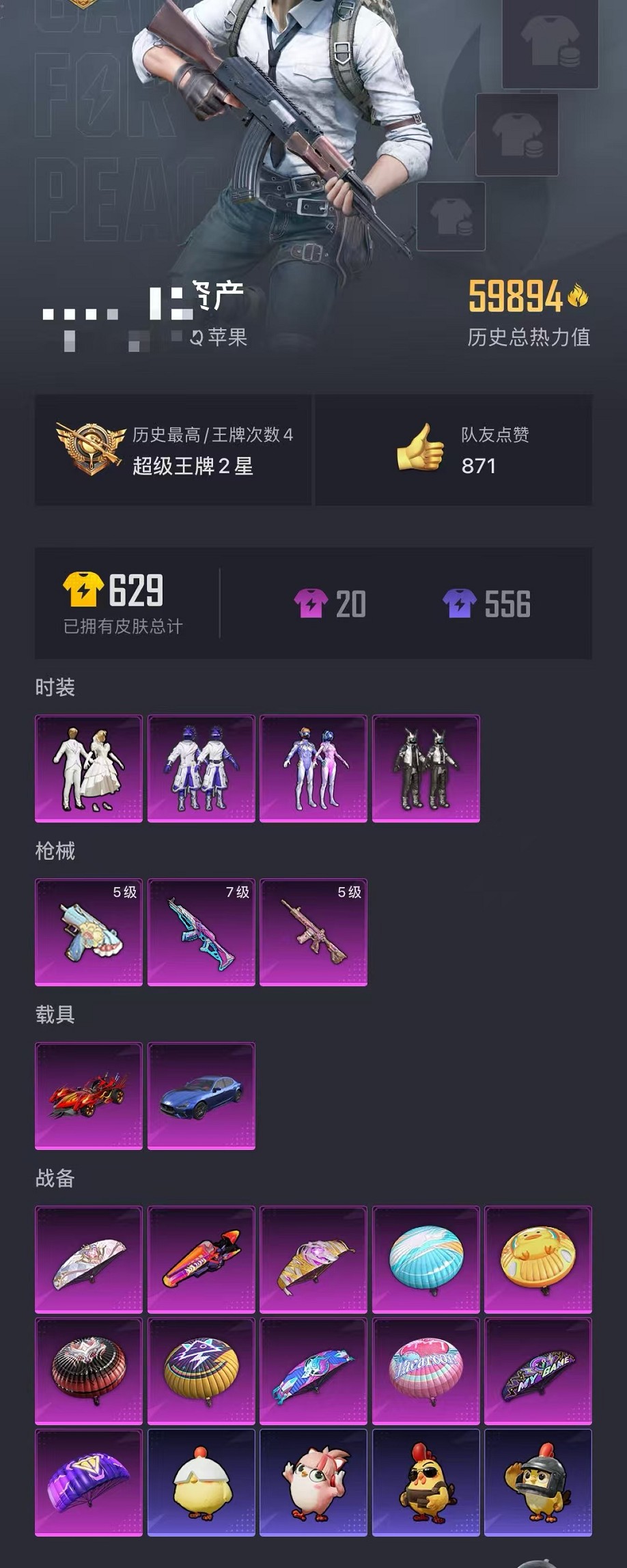 【梦幻火箭4粉装3特效呛2载具可秒换绑】 苹果q区-59894热力值-4印记-131套装-182呛皮 【2载具】 玛莎拉蒂蓝色 焰龙咆哮【2稀有】 奇异狩猎者 akm-百万伏特【4粉装】 梦幻火箭 新星烈龙(小白龙) 数码大师 纯珍童话【3特效呛】 m416-心之恋语5级 uzi-筑梦精灵5级 akm-梦之光华7级【40热门】 m416-蓝色火焰 长空猛禽 虚音幻奏 甜心亚梦 拳皇97八神庵 霓虹街区 梦幻奶油 懵萌河马 酷萌兔限定 黑色刀锋 雪山精英老6服 梦魇先生 鹰眼刺客 好奇恐龙 金羽特工 赛罗奥特曼 团圆交子 瑞龙福将 白色伏地魔 ss8特训 ss6特训 ss27特训 ss26特训 ss25特训 ss24特训 ss22特训 mini14-梦幻火箭 m762-乌木金纹 kar98k-王子的夏天 m416-乌木金纹 groza-乌木金纹 groza-2b战斗服款 mk47-乌木金纹 sks-糯团青竹 uzi-娇憨猪猪 m249-彩虹符号 mg3-幻世战舞者 akm-虎虎生威 akm-霓虹街区【2飞行器】 火焰蝠人飞行服 霓虹漫游飞行器 营地id:703565972