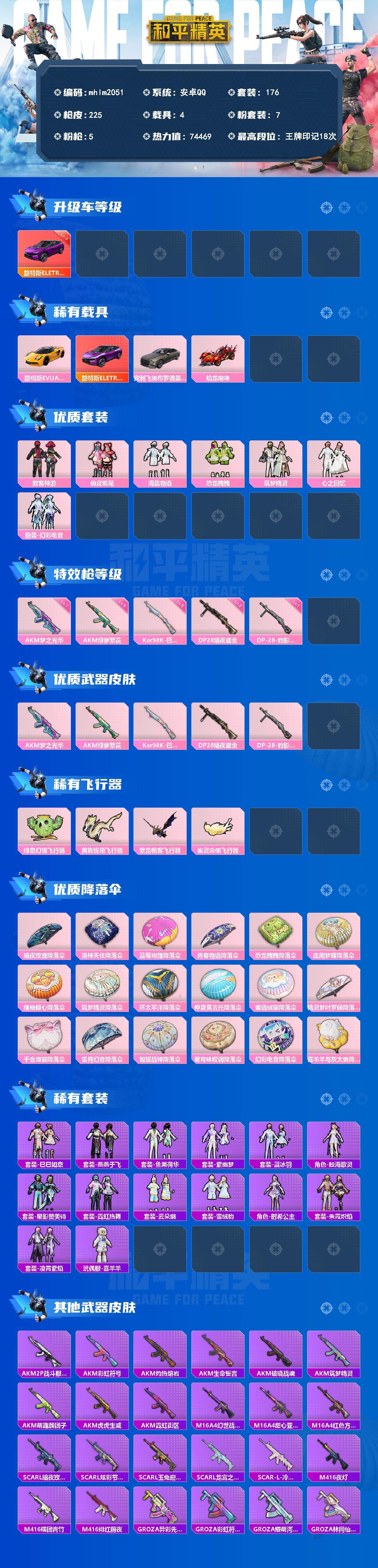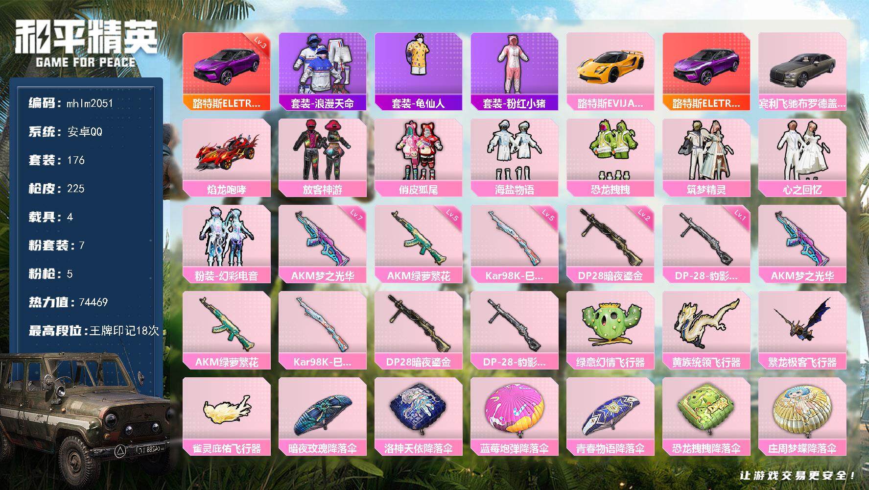 [13545036]【mhlm2051】安卓 手q-7粉装-5特效呛-4载具-5粉色飞行器-74469热力值-18王牌印记-176套装-225呛皮 【红色载具】:路特斯eletre(电光紫)三级 【热门品类】:套装-浪漫天命,套装-龟仙人,套装-粉红小猪 【粉色载具】:路特斯evija(星际黄),路特斯eletre(电光紫),宾利飞驰(布罗德盖棕双色),焰龙咆哮 【粉色套装】:粉装-放客神游,粉装-俏皮狐尾,粉装-海盐物语,粉装-恐龙拽拽,粉装-筑梦精灵,粉装-心之回忆,粉装-幻彩电音 【粉色呛皮等级】:akm-梦之光华七级,akm-绿萝繁花五级,kar98k-巳巳如意五级,dp-28-暗夜鎏金二级,dp-28-豹影疾电一级 【粉色呛皮】:akm-梦之光华,akm-绿萝繁花,kar98k-巳巳如意,dp-28-暗夜鎏金,dp-28-豹影疾电 【粉色飞行器】:绿意幻情飞行器,黄族统领飞行器,繁龙极客飞行器,雀灵庇佑飞行器 【粉色降落伞】:暗夜玫瑰降落伞,洛神天依降落伞,蓝莓炮弹降落伞,青春物语降落伞,恐龙拽拽降落伞,庄周梦蝶降落伞,橘柚倾心降落伞,筑梦精灵降落伞,环太平洋降落伞,仲夏莫吉托降落伞,蜜语绒猫降落伞,精灵梦叶罗丽降落伞,千金淑猫降落伞,雪月幻音降落伞,智耀战神降落伞,星穹咏叹调降落伞,幻彩电音降落伞,喜羊羊与灰太狼降落伞 【稀有套装】:套装-龟仙人,套装-巳巳如意,套装-燕燕于飞,套装-鱼渊荷华,套装-紫幽梦,套装-蓝冰羽,角色-鲛海歌灵,套装-星影赞美诗,套装-霓虹热舞,套装-云朵鹅,套装-雪绒豹,角色-时希公主,套装-朱霞炽焰,套装-凌霄紫焰,玩偶服-喜羊羊 【稀有呛皮】:akm-2p战斗服款,akm-彩虹符号,akm-灼热熔岩,akm-生命誓言,akm-破晓战魂,akm-筑梦精灵,akm-萌趣颜团子,akm-虎虎生威,akm-霓虹街区,m16a4-幻世战舞者,m16a4-甜心亚梦,m16a4-红色方程式,scar-l-暗夜玫瑰,scar-l-炫彩节奏,scar-l-玉兔迎春,scar-l-龙宫之主,scar-l-冷漠罗丽,m416-夜灯,m416-糯团青竹,m416-绯红前夜,groza-异彩先驱,groza-彩虹符号,groza-懵萌河马,groza-林间仙鹿,groza-生命誓言,groza-田园牧歌,aug-天降萌叽,aug-灵符少年,a