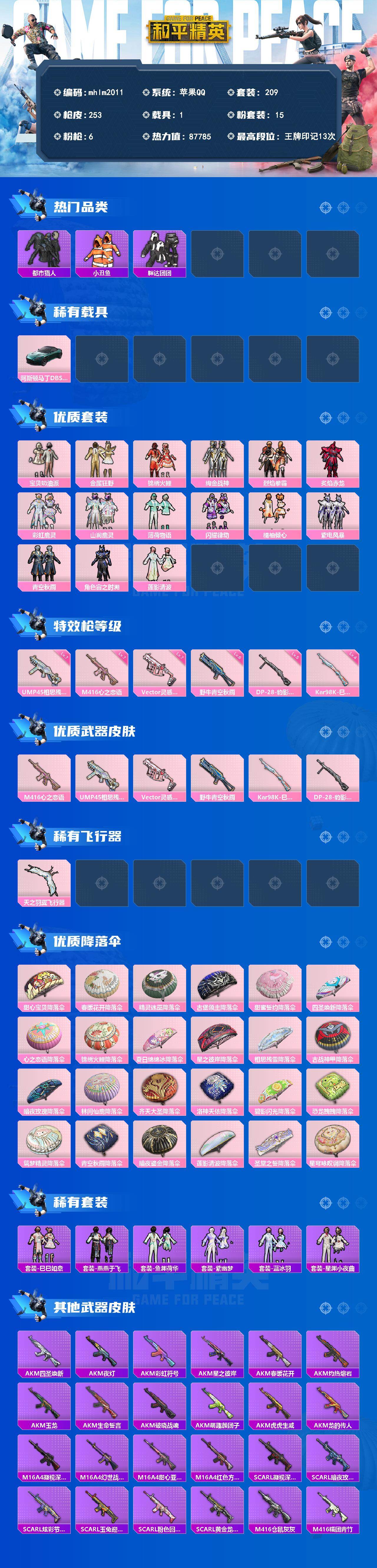 [13547095]【mhlm2011】苹果 手q-15粉装-6特效呛-1载具-1粉色飞行器-87785热力值-13王牌印记-209套装-253呛皮 【热门品类】:套装-浪漫天命,套装-都市猎人,套装-深海小丑鱼,套装-小丑鱼,套装-胖达团团 【粉色载具】:阿斯顿马丁dbs(绿) 【粉色套装】:粉装-宝贝奶油派,粉装-金属狂野,粉装-锦绣火鲤,粉装-绚金战神,粉装-烈焰拳霸,粉装-炙焰赤龙,粉装-彩虹鹿灵,粉装-山涧鹿灵,粉装-薄荷物语,粉装-闪耀律动,粉装-橘柚倾心,粉装-紫电风暴,粉装-青空秋雨,角色-宙之时溯,粉装-莲影清波 【粉色呛皮等级】:m416-心之恋语七级,ump45-相思残雪七级,vect-灵感创作师七级,野牛-青空秋雨六级,kar98k-巳巳如意四级,dp-28-豹影疾电五级 【粉色呛皮】:m416-心之恋语,ump45-相思残雪,vect-灵感创作师,野牛-青空秋雨,kar98k-巳巳如意,dp-28-豹影疾电 【粉色飞行器】:天之羽翼飞行器 【粉色降落伞】:甜心宝贝降落伞,春暖花开降落伞,精灵迷巫降落伞,古堡领主降落伞,甜蜜誓约降落伞,四圣焕新降落伞,心之恋语降落伞,锦绣火鲤降落伞,夏日绵绵冰降落伞,星之彼岸降落伞,相思残雪降落伞,古战神甲降落伞,暗夜玫瑰降落伞,林间仙鹿降落伞,齐天大圣降落伞,洛神天依降落伞,碧影闪光降落伞,恐龙拽拽降落伞,筑梦精灵降落伞,青空秋雨降落伞,暗夜鎏金降落伞,莲影清波降落伞,圣堂之誓降落伞,星穹咏叹调降落伞 【稀有套装】:套装-巳巳如意,套装-燕燕于飞,套装-鱼渊荷华,套装-紫幽梦,套装-蓝冰羽,套装-星渊小夜曲 【稀有呛皮】:akm-四圣焕新,akm-夜灯,akm-彩虹符号,akm-星之彼岸,akm-春暖花开,akm-灼热熔岩,akm-玉龙,akm-生命誓言,akm-破晓战魂,akm-萌趣颜团子,akm-虎虎生威,akm-龙的传人,m16a4-凝视深渊,m16a4-幻世战舞者,m16a4-甜心亚梦,m16a4-红色方程式,scar-l-凝视深渊,scar-l-暗夜玫瑰,scar-l-炫彩节奏,scar-l-玉兔迎春,scar-l-粉色回忆,scar-l-黄金龙骨,m416-仓鼠灰灰,m416-糯团青竹,m416-红色方程式,m416-罗小黑,m416-蓝色火焰,groza-异彩先驱,groza-彩