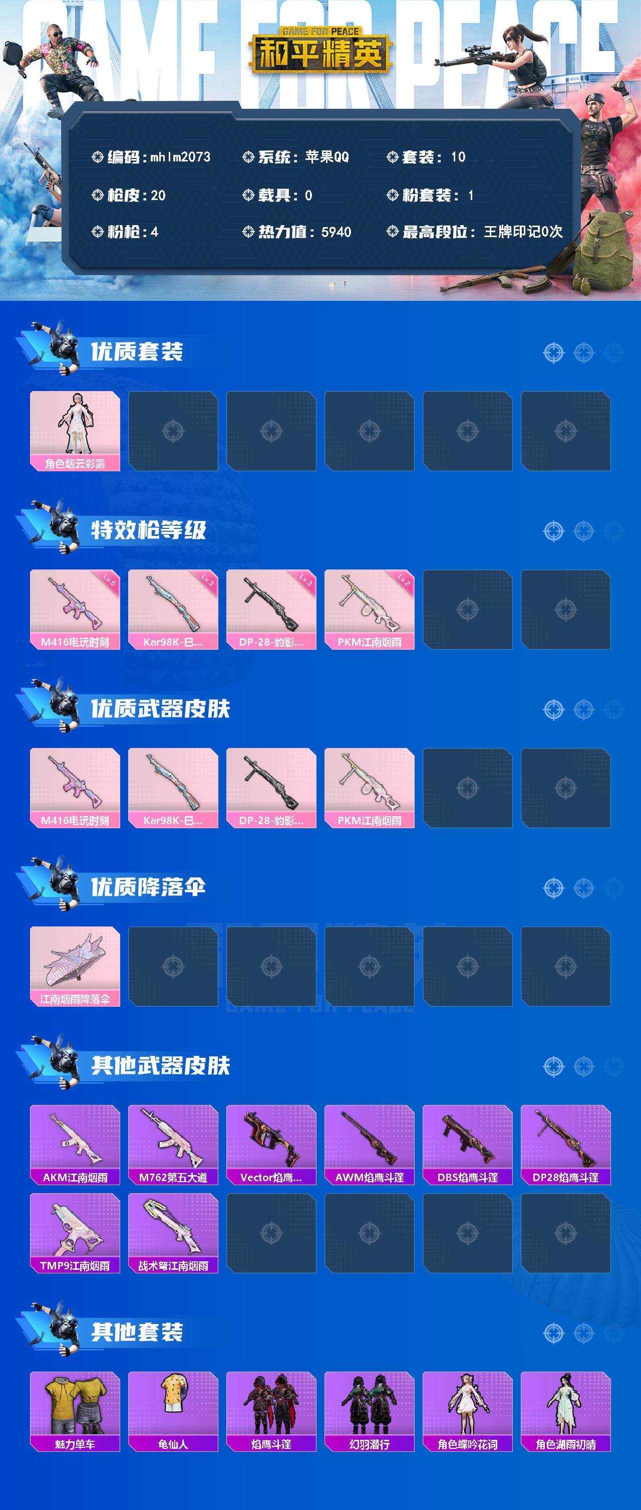 [13610707]【mhlm2073】苹果 手q-1粉装-4特效呛-0载具-0粉色飞行器-5940热力值-1王牌印记-10套装-20呛皮 【热门品类】:套装-龟仙人 【粉色套装】:角色-烟云彩露 【粉色呛皮等级】:m416-电玩时刻五级,kar98k-巳巳如意三级,dp-28-豹影疾电三级,pkm-江南烟雨二级 【粉色呛皮】:m416-电玩时刻,kar98k-巳巳如意,dp-28-豹影疾电,pkm-江南烟雨 【粉色降落伞】:江南烟雨降落伞 【稀有套装】:套装-龟仙人 【稀有呛皮】:akm-江南烟雨,m762-第五大道,vect-焰鹰斗篷,awm-焰鹰斗篷,dbs-焰鹰斗篷,dp-28-焰鹰斗篷,tmp-9-江南烟雨,战术弩-江南烟雨 【其他套装】:套装-魅力单车,套装-龟仙人,套装-焰鹰斗篷,套装-幻羽潜行,角色-蝶吟花词,角色-湖雨初晴 【营地id】:959820291