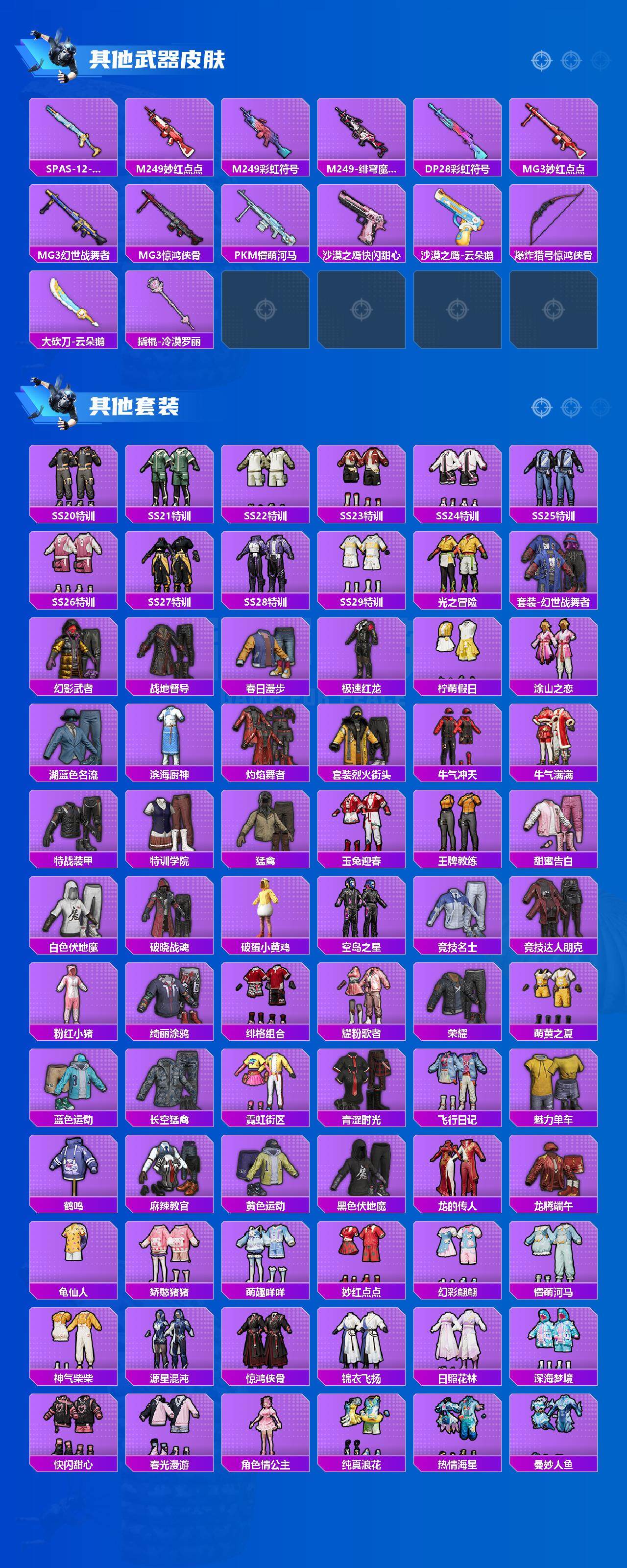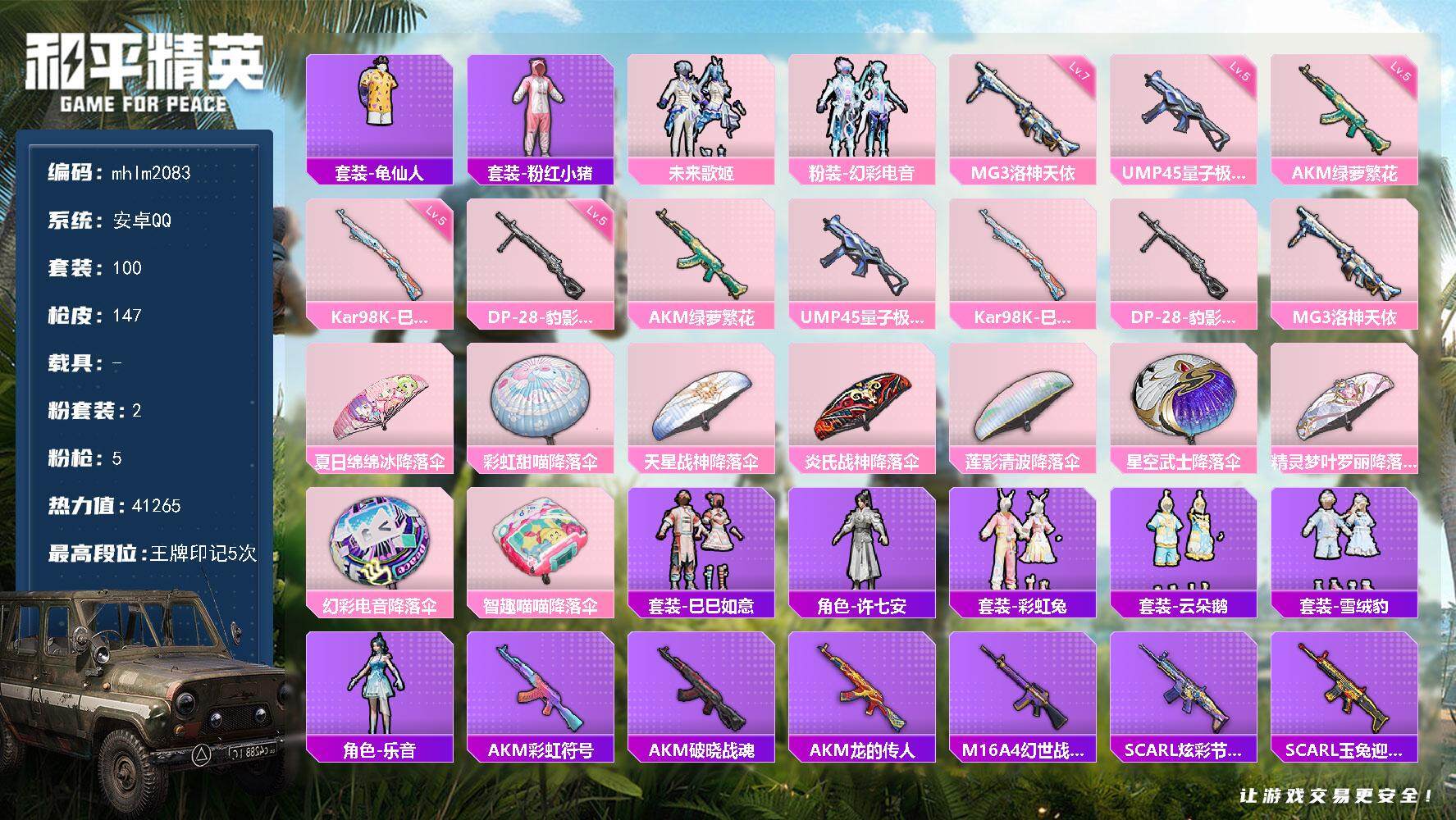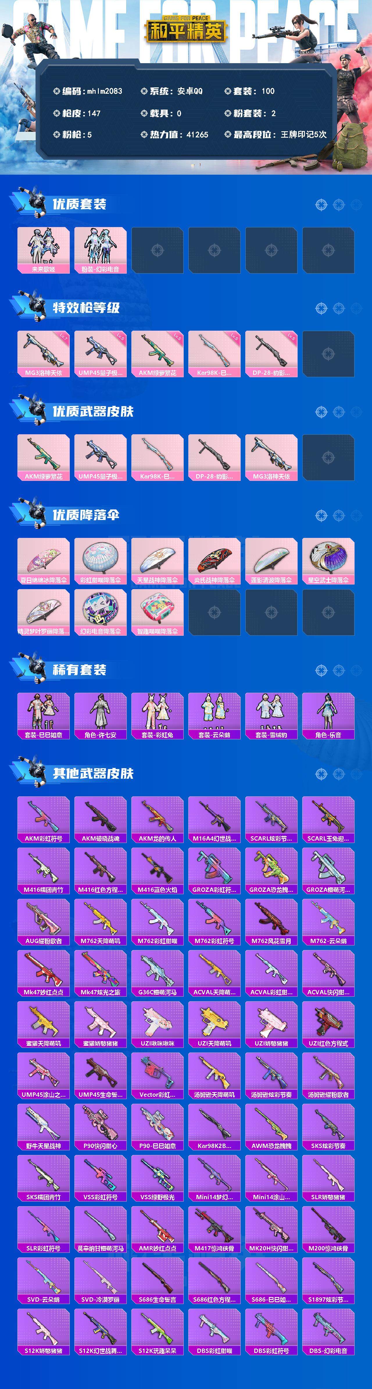 [13611705]【mhlm2083】安卓 手q-2粉装-5特效呛-0载具-0粉色飞行器-41265热力值-5王牌印记-100套装-147呛皮 【热门品类】:套装-龟仙人,套装-粉红小猪 【粉色套装】:粉装-未来歌姬,粉装-幻彩电音 【粉色呛皮等级】:akm-绿萝繁花五级,ump45-量子极限五级,kar98k-巳巳如意五级,dp-28-豹影疾电五级,mg3-洛神天依七级 【粉色呛皮】:akm-绿萝繁花,ump45-量子极限,kar98k-巳巳如意,dp-28-豹影疾电,mg3-洛神天依 【粉色降落伞】:夏日绵绵冰降落伞,彩虹甜喵降落伞,天星战神降落伞,炎氏战神降落伞,莲影清波降落伞,星空武士降落伞,精灵梦叶罗丽降落伞,幻彩电音降落伞,智趣喵喵降落伞 【稀有套装】:套装-龟仙人,套装-巳巳如意,角色-许七安,套装-彩虹兔,套装-云朵鹅,套装-雪绒豹,角色-乐音 【稀有呛皮】:akm-彩虹符号,akm-破晓战魂,akm-龙的传人,m16a4-幻世战舞者,scar-l-炫彩节奏,scar-l-玉兔迎春,m416-糯团青竹,m416-红色方程式,m416-蓝色火焰,groza-彩虹符号,groza-恐龙拽拽,groza-懵萌河马,aug-耀粉歌者,m762-天降萌叽,m762-彩虹甜喵,m762-彩虹符号,m762-风花雪月,m762-云朵鹅,mk47-妙红点点,mk47-炫光之旅,g36c-懵萌河马,ac-val-天降萌叽,ac-val-彩虹甜喵,ac-val-快闪甜心,蜜獾-天降萌叽,蜜獾-娇憨猪猪,uzi-啾咪啾咪,uzi-天降萌叽,uzi-娇憨猪猪,uzi-红色方程式,ump45-涂山之恋,ump45-生命誓言,vect-彩虹符号,汤姆逊-天降萌叽,汤姆逊-炫彩节奏,汤姆逊-耀粉歌者,野牛-天星战神,p90-快闪甜心,p90-巳巳如意,kar98k-2b战斗服款,awm-恐龙拽拽,sks-炫彩节奏,sks-糯团青竹,vss-彩虹符号,vss-绿野极光,mini14-梦幻火箭,mini14-涂山之恋,slr-娇憨猪猪,slr-彩虹符号,莫辛纳甘-懵萌河马,amr-妙红点点,m417-惊鸿侠骨,mk20-h-快闪甜心,m200-惊鸿侠骨,svd-云朵鹅,svd-冷漠罗丽,s686-生命誓言,s686-红色方程式,s686-巳巳如意,s1897-炫彩节奏,s12