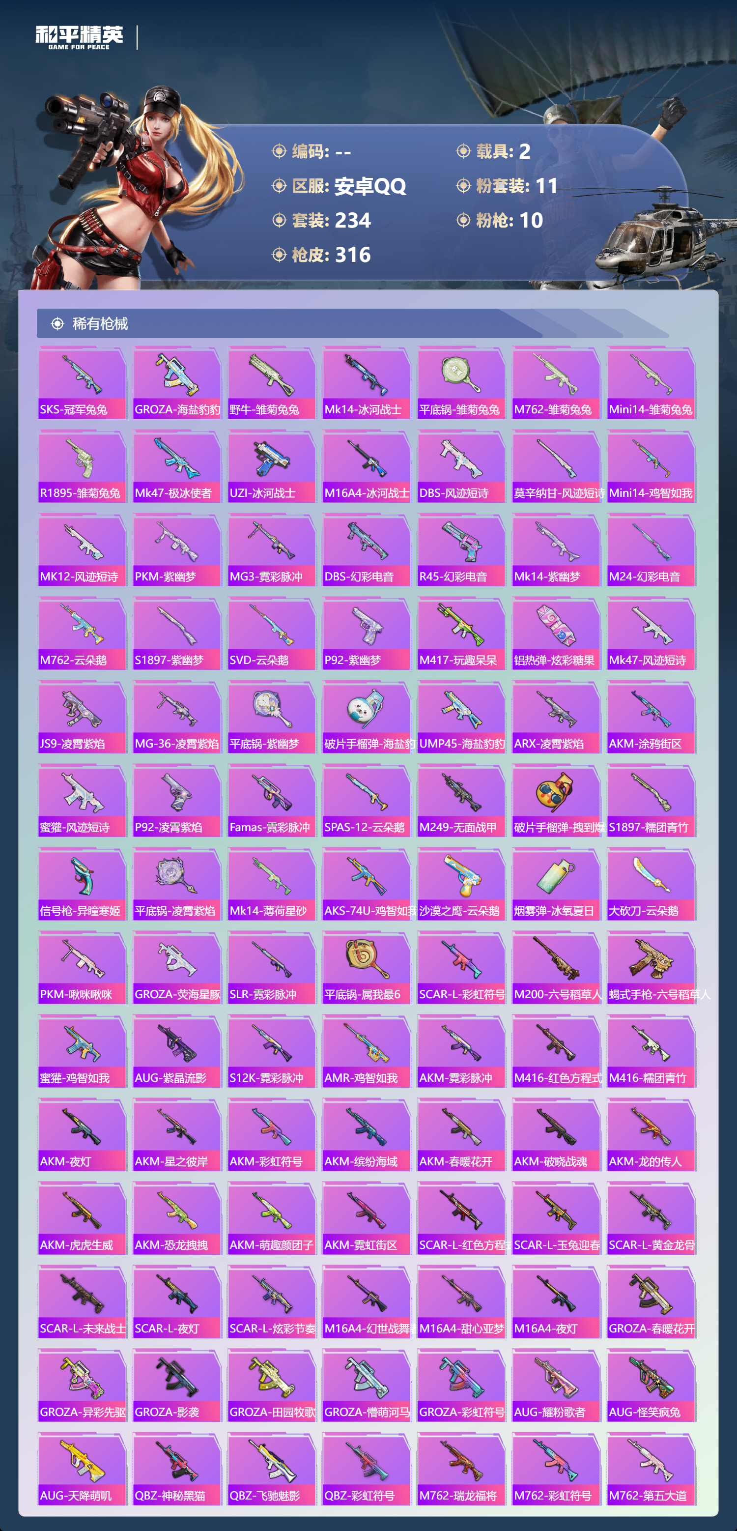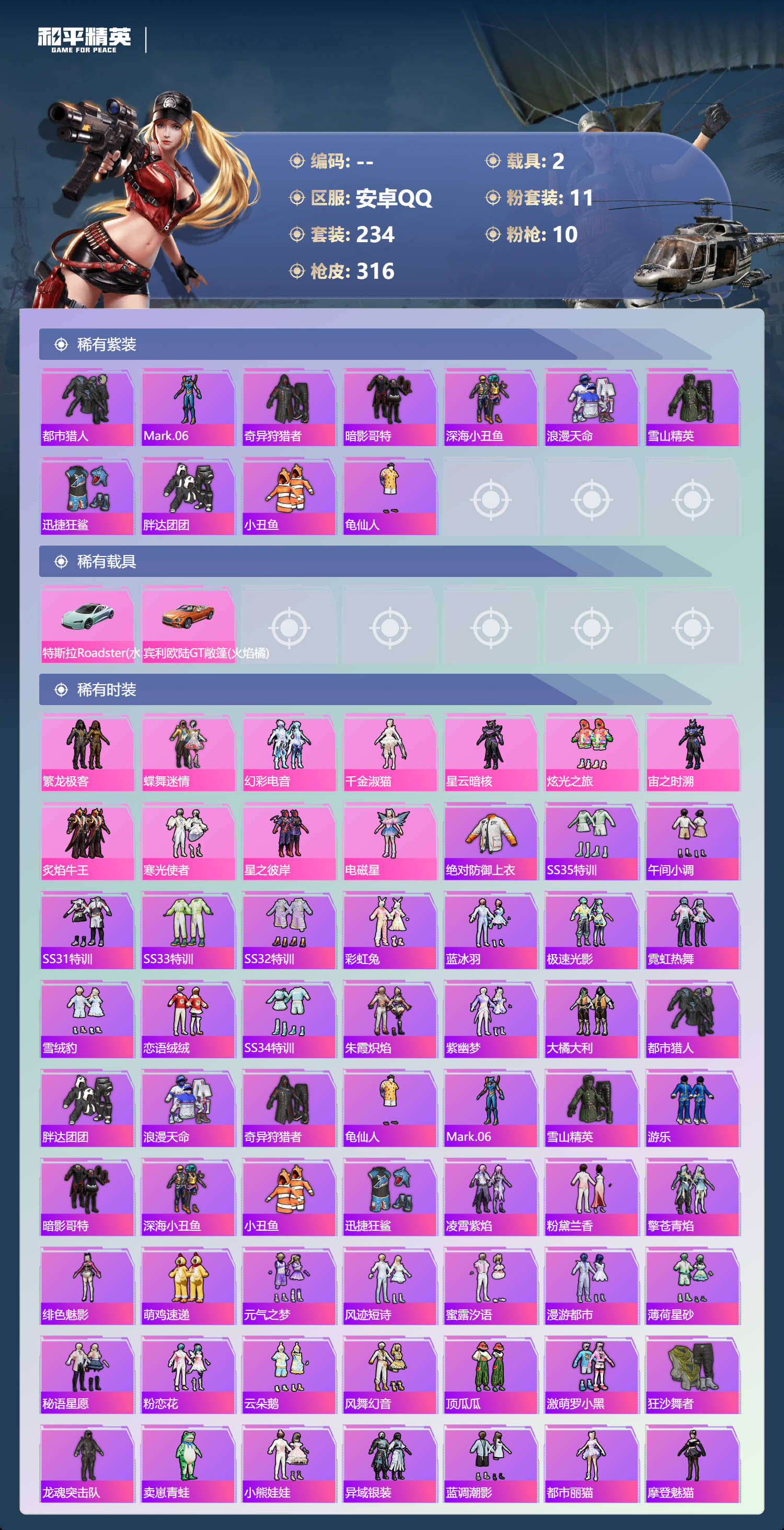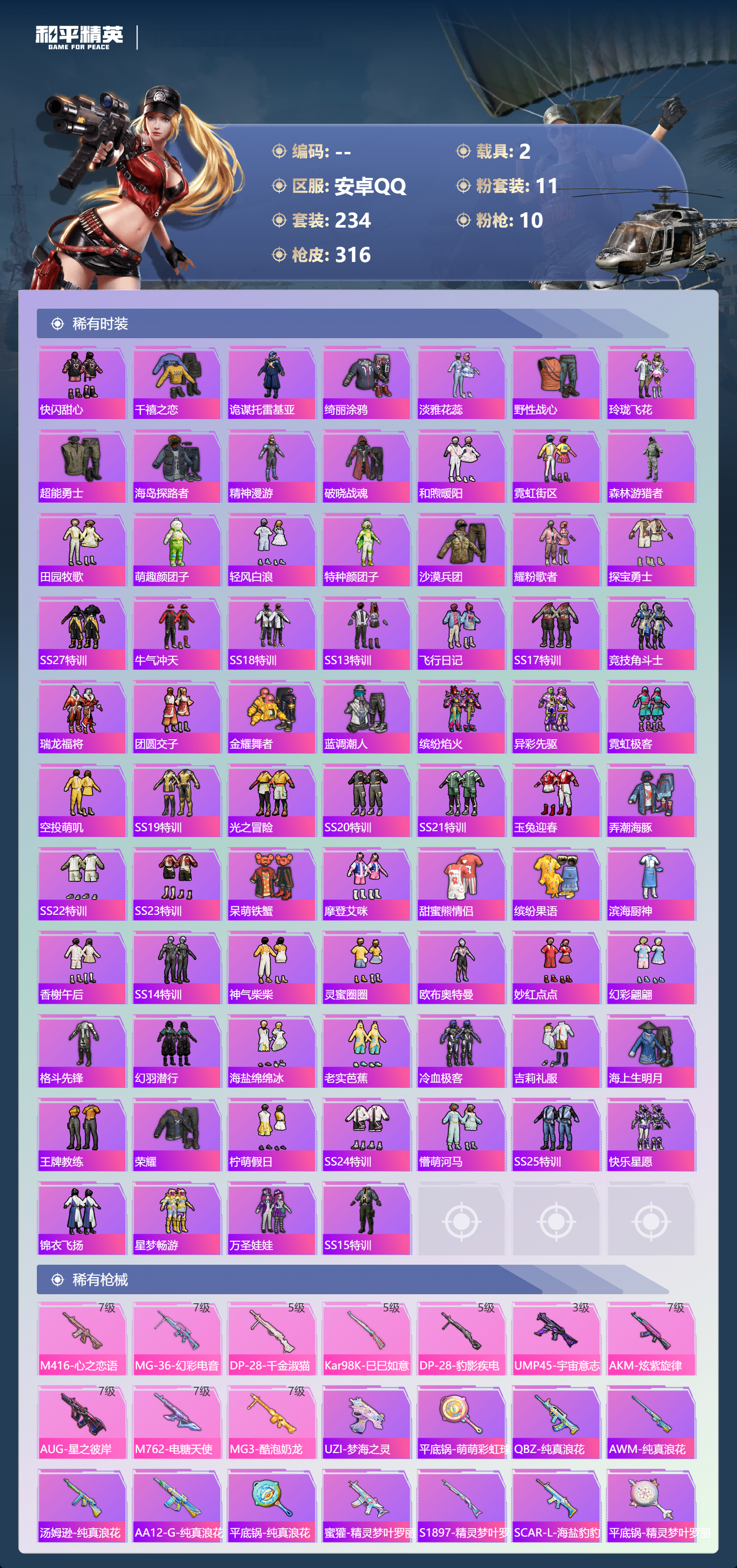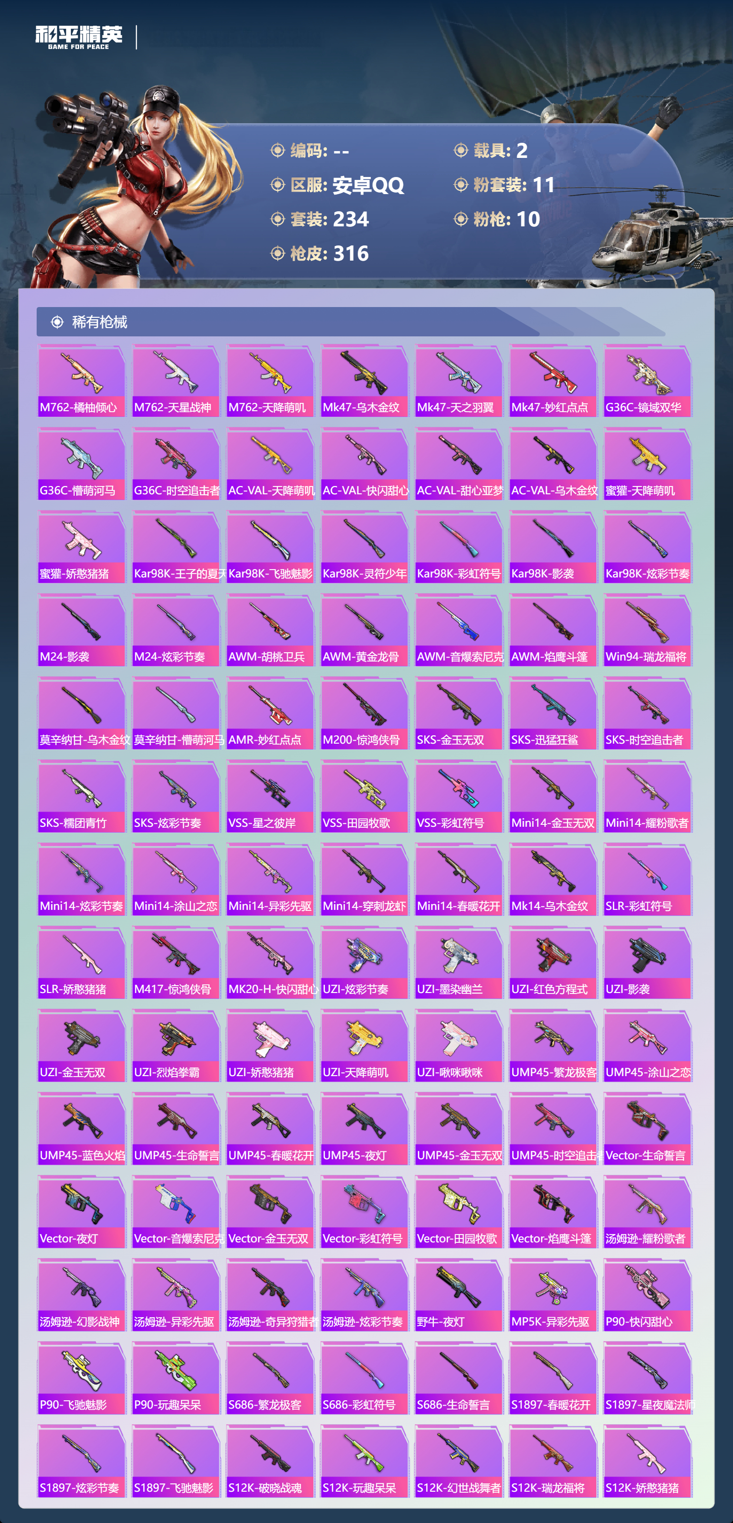 hs49485 安卓手q-20王牌印记-11粉装-10特效呛-2载具-热力值-234套装-316呛皮-3卓越印记-1传奇印记【11粉装】角色-宙之时溯套装-炫光之旅角色-千金淑猫套装-幻彩电音角色-星云暗核套装-炙焰牛王套装-星之彼岸角色-电磁星套装-蝶舞迷情套装-繁龙极客套装-寒光使者【10特效呛】mg3-酷泡奶龙/7级dp-28-千金淑猫/5级ump45