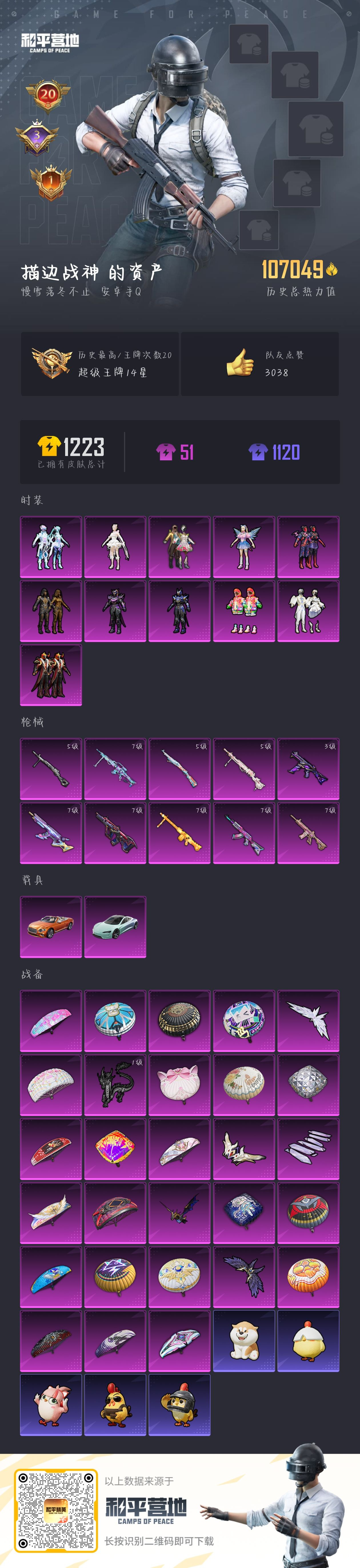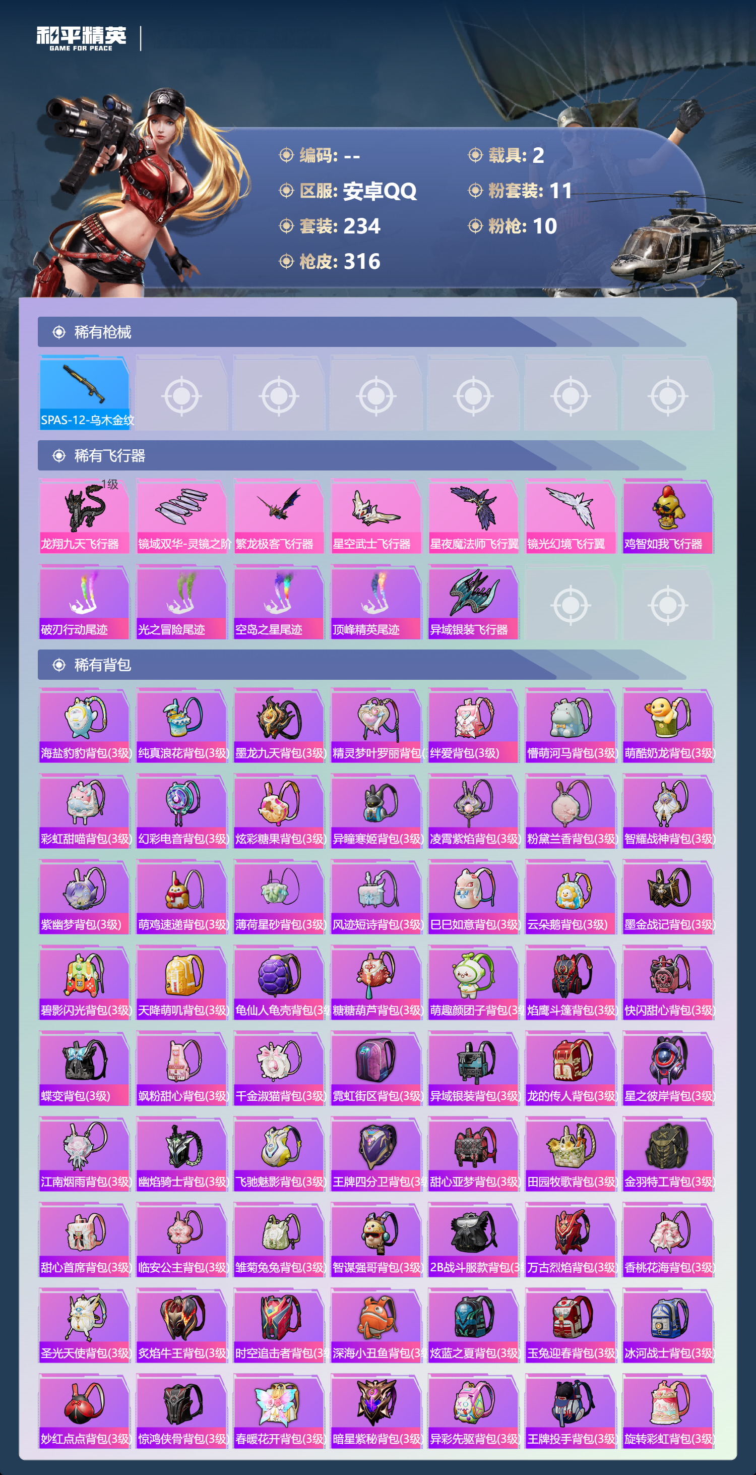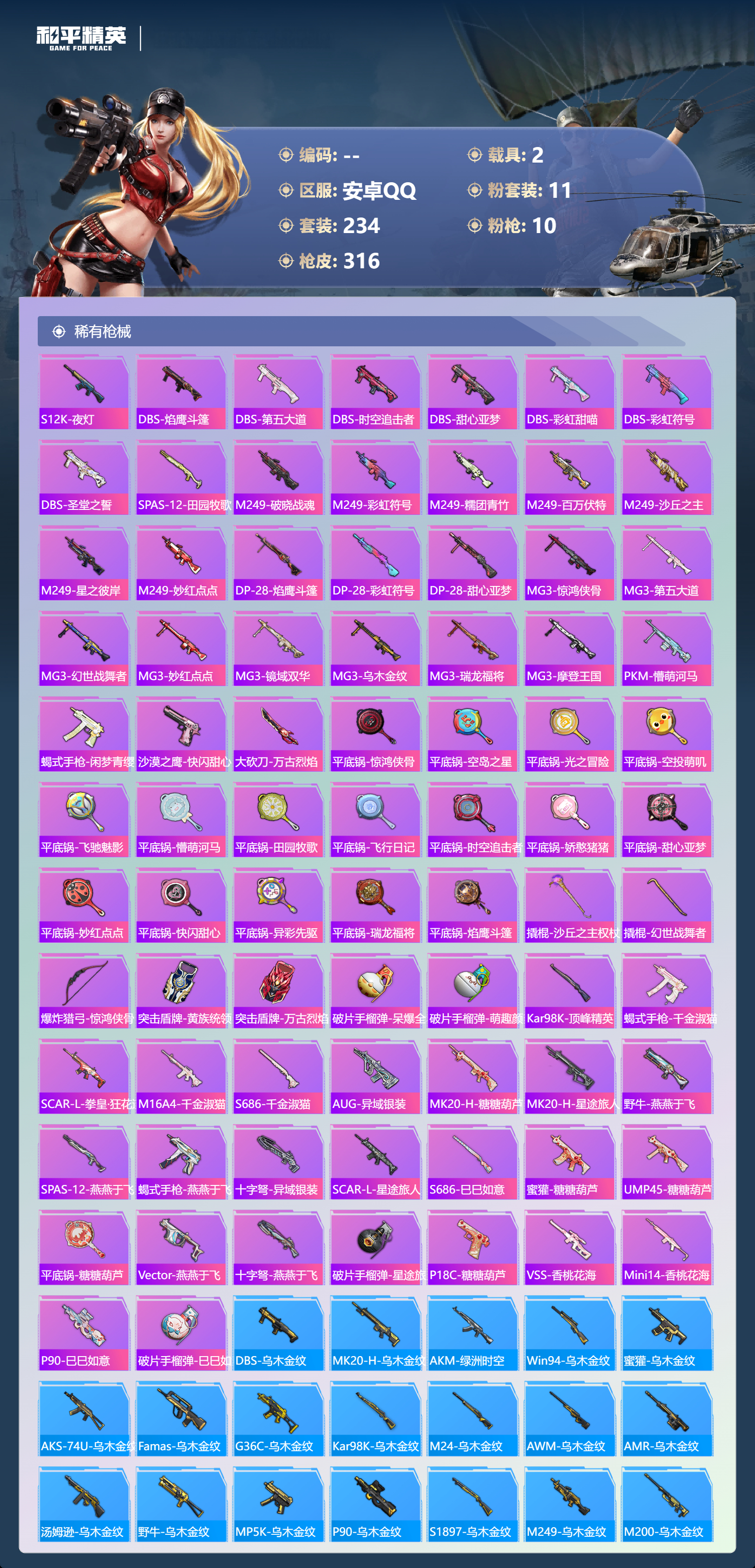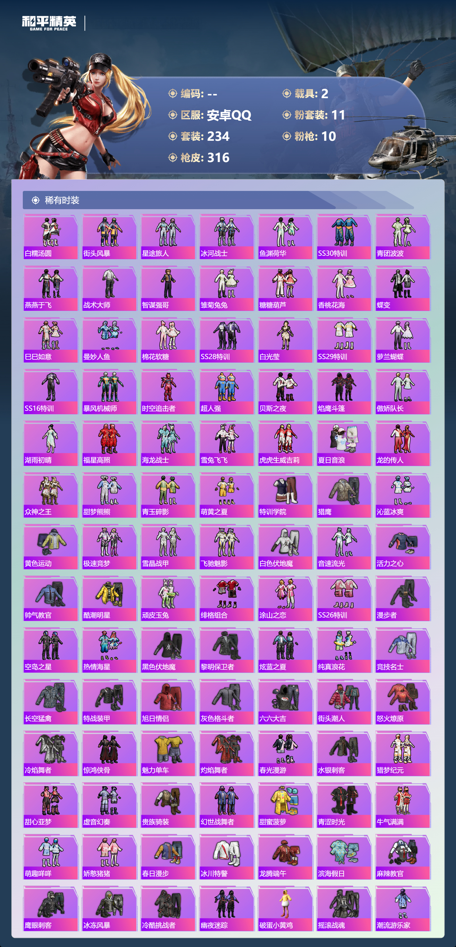 hs49485 安卓手q-20王牌印记-11粉装-10特效呛-2载具-热力值-234套装-316呛皮-3卓越印记-1传奇印记【11粉装】角色-宙之时溯套装-炫光之旅角色-千金淑猫套装-幻彩电音角色-星云暗核套装-炙焰牛王套装-星之彼岸角色-电磁星套装-蝶舞迷情套装-繁龙极客套装-寒光使者【10特效呛】mg3-酷泡奶龙/7级dp-28-千金淑猫/5级ump45