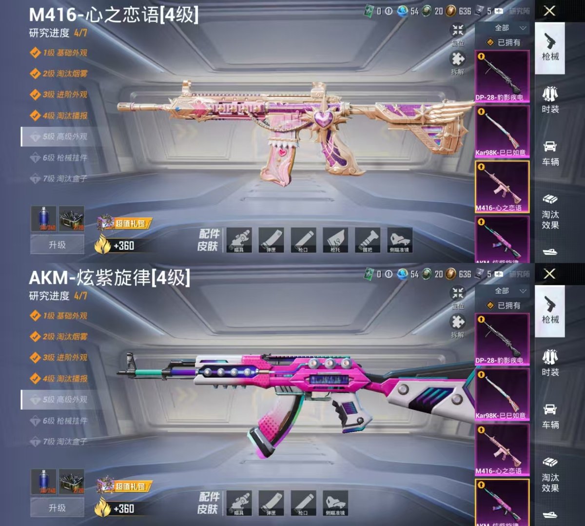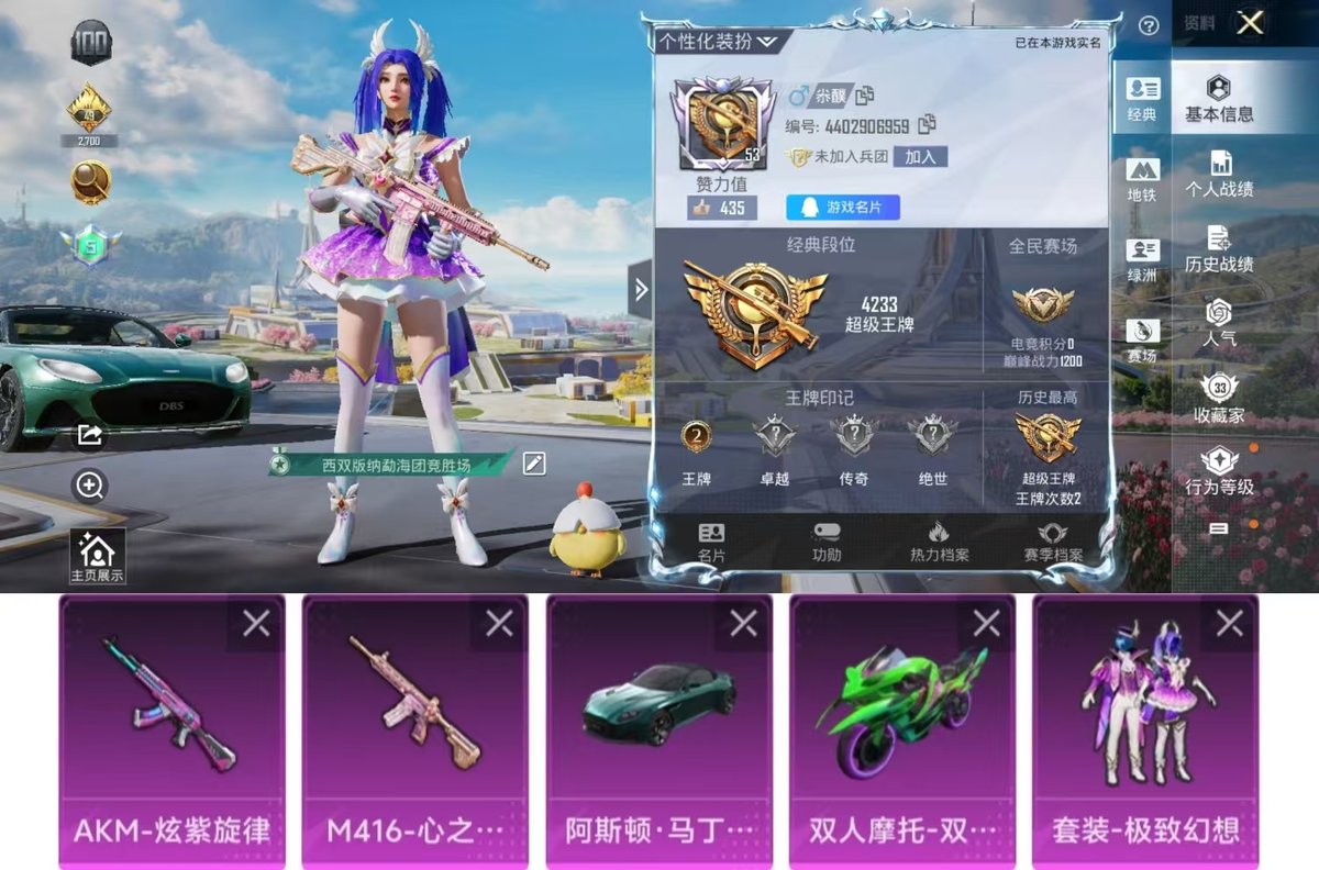 _2253919-实名:可修改时装数:166载具数:2呛械数:63战备数:40热门装扮:浪漫波比极致幻想载具:双人摩托-双刃魅影绿阿斯顿·马丁dbs绿稀有呛皮:akm炫紫旋律m416心之恋语kar98k-巳巳如意dp-28-豹影疾电