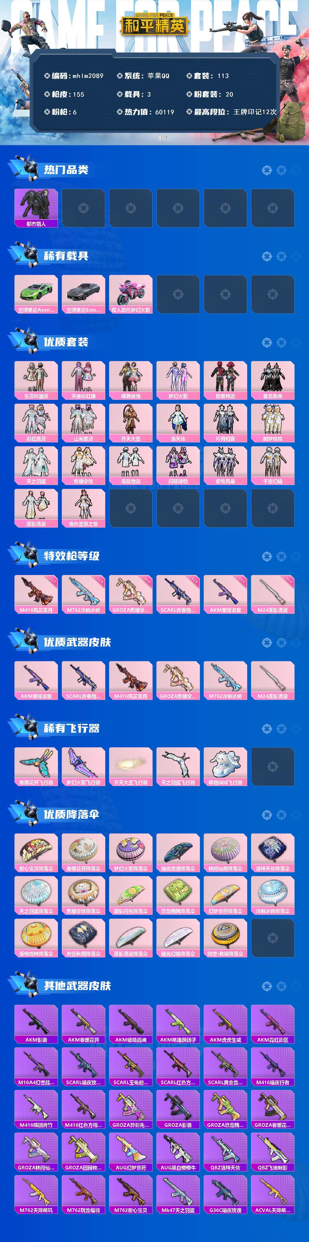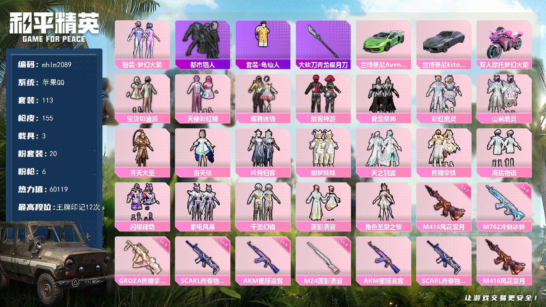 [13646067]【mhlm2089】苹果 手q-20粉装-6特效呛-3载具-5粉色飞行器-60119热力值-12王牌印记-113套装-155呛皮 【热门品类】:粉装-梦幻火箭,套装-都市猎人,套装-龟仙人,大砍刀-青龙偃月刀 【粉色载具】:兰博基尼aventad svj(翡翠绿),兰博基尼estoque(银翼灰),双人摩托-梦幻火箭 【粉色套装】:粉装-宝贝奶油派,粉装-天使彩虹糖,粉装-蝶舞迷情,粉装-梦幻火箭,粉装-放客神游,粉装-骨龙祭渊,粉装-彩虹鹿灵,粉装-山涧鹿灵,粉装-齐天大圣,角色-洛天依,粉装-吟月归客,粉装-酣梦娃娃,粉装-天之羽翼,粉装-焦糖拿铁,粉装-海盐物语,粉装-闪耀律动,粉装-紫电风暴,粉装-千面幻镜,粉装-莲影清波,角色-圣堂之誓 【粉色呛皮等级】:akm-星际浪客五级,scar-l-青春物语五级,m416-风花雪月七级,groza-焦糖拿铁五级,m762-冷魅冰骑六级,m24-莲影清波四级 【粉色呛皮】:akm-星际浪客,scar-l-青春物语,m416-风花雪月,groza-焦糖拿铁,m762-冷魅冰骑,m24-莲影清波 【粉色飞行器】:春暖花开飞行器,梦幻火箭飞行器,齐天大圣飞行器,天之羽翼飞行器,萌物绒绒飞行器 【粉色降落伞】:甜心宝贝降落伞,春暖花开降落伞,梦幻火箭降落伞,暗夜玫瑰降落伞,林间仙鹿降落伞,洛神天依降落伞,天之羽翼降落伞,焦糖拿铁降落伞,碧影闪光降落伞,恐龙拽拽降落伞,幻梦音符降落伞,冷魅冰骑降落伞,垂柳戏鸭降落伞,青空秋雨降落伞,莲影清波降落伞,镜光幻境降落伞,创世·救赎降落伞 【稀有套装】:套装-龟仙人 【稀有呛皮】:akm-影袭,akm-春暖花开,akm-破晓战魂,akm-萌趣颜团子,akm-虎虎生威,akm-霓虹街区,m16a4-幻世战舞者,scar-l-暗夜玫瑰,scar-l-玉兔迎春,scar-l-红色方程式,scar-l-黄金龙骨,m416-暗夜行者,m416-糯团青竹,m416-红色方程式,groza-异彩先驱,groza-影袭,groza-恐龙拽拽,groza-春暖花开,groza-林间仙鹿,groza-田园牧歌,aug-幻梦音符,aug-黑白懵懵牛,q-洛神天依,q-飞驰魅影,m762-天降萌叽,m762-瑞龙福将,m762-甜心宝贝,mk47-天之羽翼,g36c-暗夜