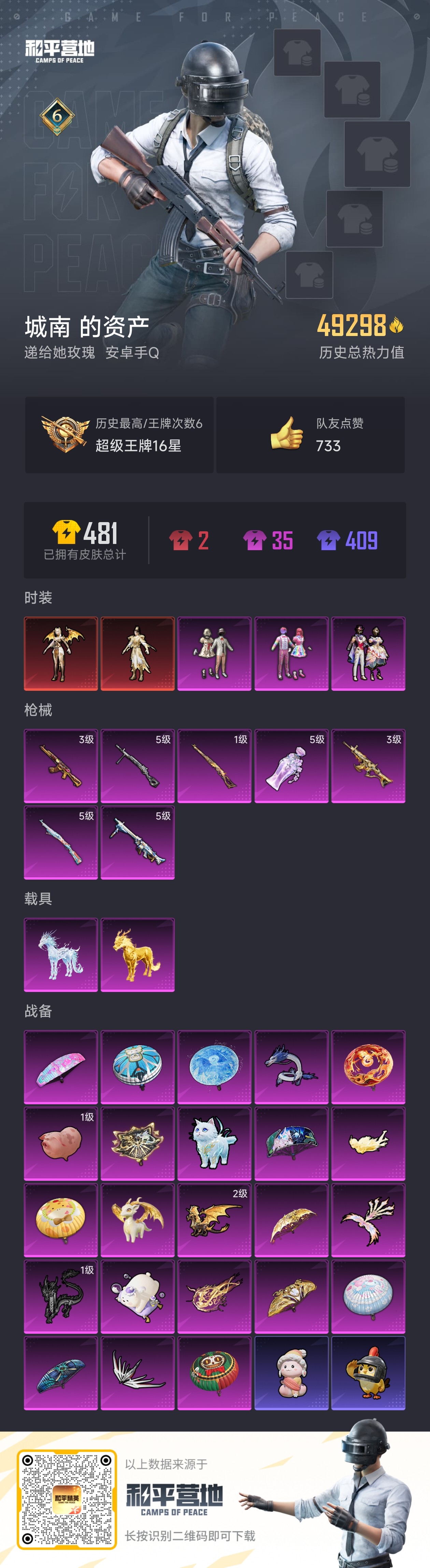 【和平精英】【txhp3734】3粉装,7特效呛,2载具,历史最高段位:超级王牌16星 王牌印记6次 热力值:49298,79套装,138呛械,165装备,75战备;套装:金蛇镇世-烛九,圣域龙灵-瑞拉,套装-宝贝奶油派,套装-天使彩虹糖,套装-星穹咏叹调,套装-蓝色运动,套装-白色伏地魔,套装-竞技名士,套装-深蓝色名流,套装-黄色名流,套装-长空猛禽,套装-甜蜜告白,套装-坚韧舞者,套装-夜莺强袭者,套装-野性战魂,套装-狂沙舞者,套装-热血青春,套装-雪山精英,套装-幻世战舞者,套装-奇异狩猎者,套装-甜蜜熊情侣,套装-青涩时光,套装-缤纷果语,套装-滨海厨神,套装-格斗先锋,套装-破蛋小黄鸡,套装-疯狂小兔子,套装-ss5特训,套装-北国孤狼,套装-鹤鸣,套装-智慧之神,套装-白熊同盟,套装-萌趣颜团子,套装-特种颜团子,套装-战术大师,套装-ss18特训,套装-耀粉歌者,套装-ss14特训,套装-ss15特训,套装-ss16特训,套装-ss17特训,套装-福星高照,套装-空投萌叽,套装-ss21特训,套装-萌趣咩咩,套装-娇憨猪猪,套装-ss22特训,套装-田园牧歌,套装-轻风白浪,套装-空岛之星,套装-恋语绒绒,套装-异域银装,套装-ss31特训,套装-鱼渊荷华,套装-石蕴玉辉,套装-燕燕于飞,角色-海琴烟,套装-紫幽梦,套装-粉恋花,套装-ss33特训,套装-云朵鹅,套装-巳巳如意,套装-ss32特训,套装-樱梦幻音,套装-蓝冰羽,套装-顶瓜瓜,套装-雪绒豹,套装-极速光影,玩偶服-美羊羊,套装-元气之梦,套装-ss34特训,套装-擎苍青焰,套装-朱霞炽焰,套装-凌霄紫焰,套装-薄荷星砂,套装-ss35特训,套装-午间小调,套装-风迹短诗,套装-萌鸡速递;呛皮:mk47-洛神天依,mk47-乌木金纹,mk47-风迹短诗,3级akm-甜心宝贝,akm-夜灯,akm-萌趣颜团子,akm-虎虎生威,akm-砺玉逐花,akm-霓彩脉冲,蜜獾-娇憨猪猪,蜜獾-垂柳戏鸭,蜜獾-天降萌叽,蜜獾-风迹短诗,蜜獾-冰澜龙吟,蜜獾-乌木金纹,3级scar-l-金蛇镇世,scar-l-红色方程式,scar-l-炫彩节奏,scar-l-玉兔迎春,groza-彩虹符号,groza-田园牧歌,aug-耀粉歌者,aug-异域银装,aug-金蛇镇世,aug-乌木金纹,g36c-暗夜玫瑰,g36c-乌木金纹,famas-霓彩脉冲,famas-乌木金纹,arx-凌霄紫焰,q-彩虹符号,ac-val-天降萌叽,m416-红色方程式,m416-萌萌史莱姆,m16a4-蓝色火焰,m16a4-幻世战舞者,m762-云朵鹅,win94-乌木金纹,1级kar98k-圣域龙灵,5级kar98k-巳巳如意,kar98k-彩虹符号,kar98k-洛神天依,kar98k-乌木金纹,m200-乌木金纹,svd-云朵鹅,莫辛纳甘-风迹短诗,amr-乌木金纹,awm-圣堂之誓,m417-玩趣呆呆,mini14-穿刺龙虾,mini14-耀粉歌者,mini14-海渊国主,mini14-辉羽雀灵,slr-娇憨猪猪,slr-霓彩脉冲,mk14-山经魅狐,mk14-乌木金纹,mk14-紫幽梦,sks-炫彩节奏,sks-圣域龙灵,mk12-金蛇镇世,mk12-风迹短诗,vss-田园牧歌,mk20-h-圣域龙灵,aks-74u-鬼刀,aks-74u-乌木金纹,p90-巳巳如意,p90-金蛇镇世,vect-生命誓言,vect-彩虹符号,vect-田园牧歌,vect-燕燕于飞,mp5k-乌木金纹,野牛-燕燕于飞,野牛-乌木金纹,uzi-红色方程式,uzi-炫彩节奏,uzi-娇憨猪猪,uzi-天降萌叽,汤姆逊-耀粉歌者,ump45-蓝色火焰,js9-凌霄紫焰,s686-红色方程式,s686-奇异狩猎者,s686-生命誓言,s686-雪月幻音,s1897-紫幽梦,s1897-糯团青竹,s1897-乌木金纹,spas-12-田园牧歌,spas-12-燕燕于飞,spas-12-云朵鹅,s12k-破晓战魂,s12k-娇憨猪猪,s12k-玩趣呆呆,s12k-霓彩脉冲,dbs-风迹短诗,m249-破晓战魂,m249-乌木金纹,pkm-啾咪啾咪,pkm-紫幽梦,5级dp-28-豹影疾电,dp-28-甜心宝贝,dp-28-彩虹符号,dp-28-闪光银龙,5级mg3-洛神天依,mg3-乌木金纹,mg-36-凌霄紫焰,p92-紫幽梦,p92-凌霄紫焰,蝎式手呛-燕燕于飞,沙墨之鹦-云朵鹅,短管霰弹-圣域龙灵,tmp-9-萌萌史莱姆,撬棍-甜心宝贝,撬棍-环太平洋,撬棍-火尖呛,平底锅-娇憨猪猪,平底锅-田园牧歌,平底锅-光之冒险,平底锅-空岛之星,平底锅-紫幽梦,平底锅-属我最6,平底锅-凌霄紫焰,大砍刀-云朵鹅,破片手留单-萌趣颜团子,破片手留单-呆爆全场,破片手留单-拽到爆炸,破片手留单-巳巳如意,破片手留单-火尖莲影,爆炸猎弓-雪月幻音,爆炸猎弓-喜羊羊与灰太狼,铝热弹-炫彩糖果,5级盐雾蛋-丁香清露,盐雾蛋-冰澜龙吟,十子怒-燕燕于飞,十子怒-异域银装,燃点复合弓-火尖莲影;载具:护世瑞兽,冰绡玉鳞;僚机:僚机-圣域龙宝;降落伞:怪笑疯兔降落伞,暗夜玫瑰降落伞,彩虹甜喵降落伞,戏水时光降落伞,异瞳寒姬降落伞,圣域龙灵降落伞,金蛇镇世降落伞,最终圣卫者降落伞,灵猫魔法师降落伞,炫彩糖果降落伞,魔童闹海 哪吒降落伞,魔童闹海 敖丙降落伞,蓝海之火降落伞,钢铁雄心降落伞,pec2019降落伞,神秘科技降落伞,光影工厂降落伞,萌趣颜团子降落伞,2022烟花降落伞,娇憨猪猪降落伞,田园牧歌降落伞,空岛之星降落伞,异域银装降落伞,燕燕于飞降落伞,ss31王牌降落伞,紫幽梦降落伞,ss32王牌降落伞,萌萌史莱姆降落伞,一举夺葵降落伞,云朵鹅降落伞,ss33王牌降落伞,凌霄紫焰降落伞,ss34王牌降落伞,风迹短诗降落伞,紫菱降落伞,青羽降落伞,普通降落伞;滑翔尾迹:闪光银龙飞行器,酣梦熊熊飞行器,凤舞九天飞行器,万象金身飞行器,雀灵庇佑飞行器,灵猫魔法师飞行器,灵珠游龙飞行器,龙翔九天飞行器,圣域金龙飞行器,飞天猪飞行器,红色滑翔尾迹,异域银装飞行器,破刃行动尾迹,鸡智如我飞行器; 详情看图6印记-4.9w热力-2红装-3粉-7特-2马/瑞拉3级/烛九2级/scar-l金蛇3级/ak甜心3级/扭蛋碎片586/神装碎片1289/
